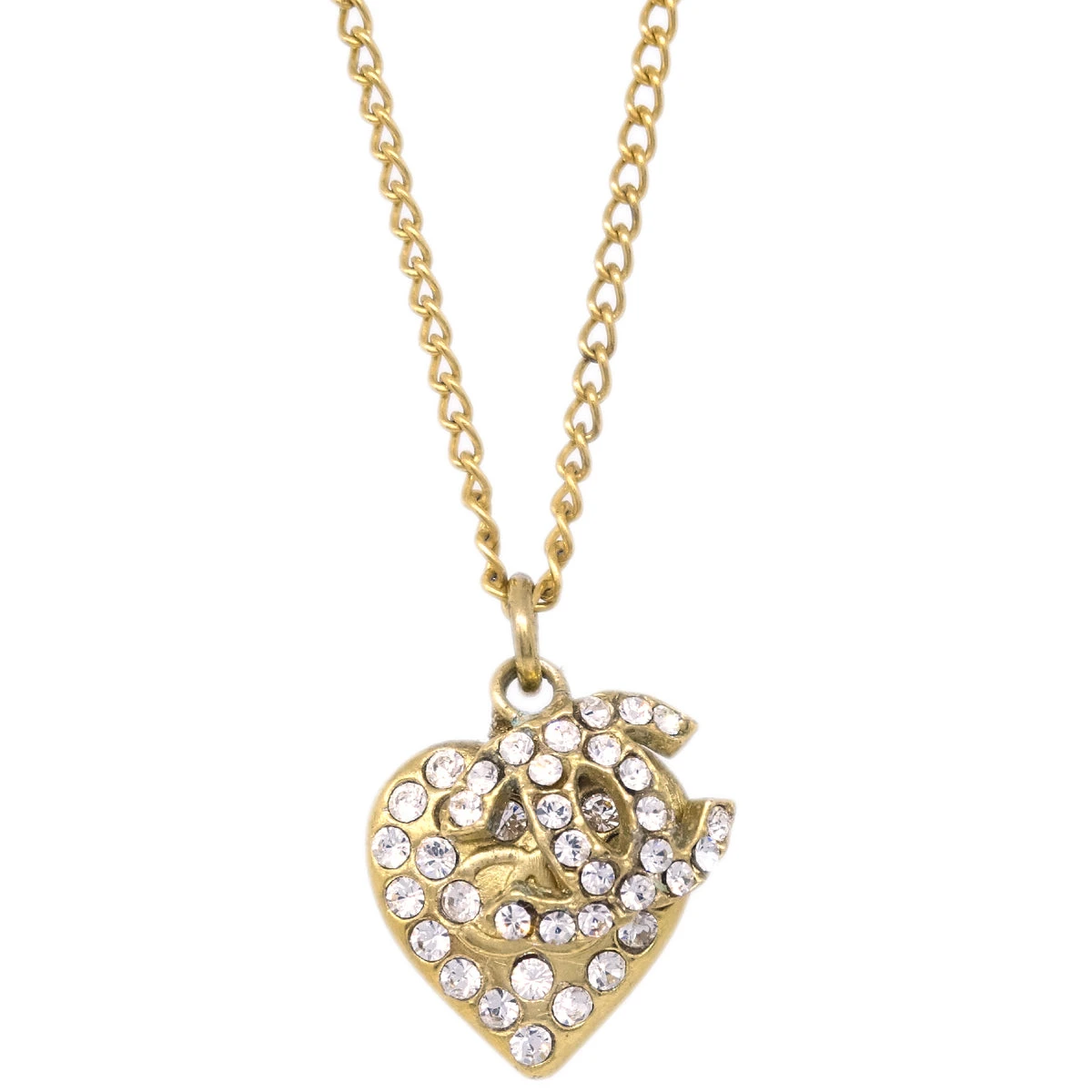 Chanel Heart Chain Pendant Necklace Rhinestone Gold 02P