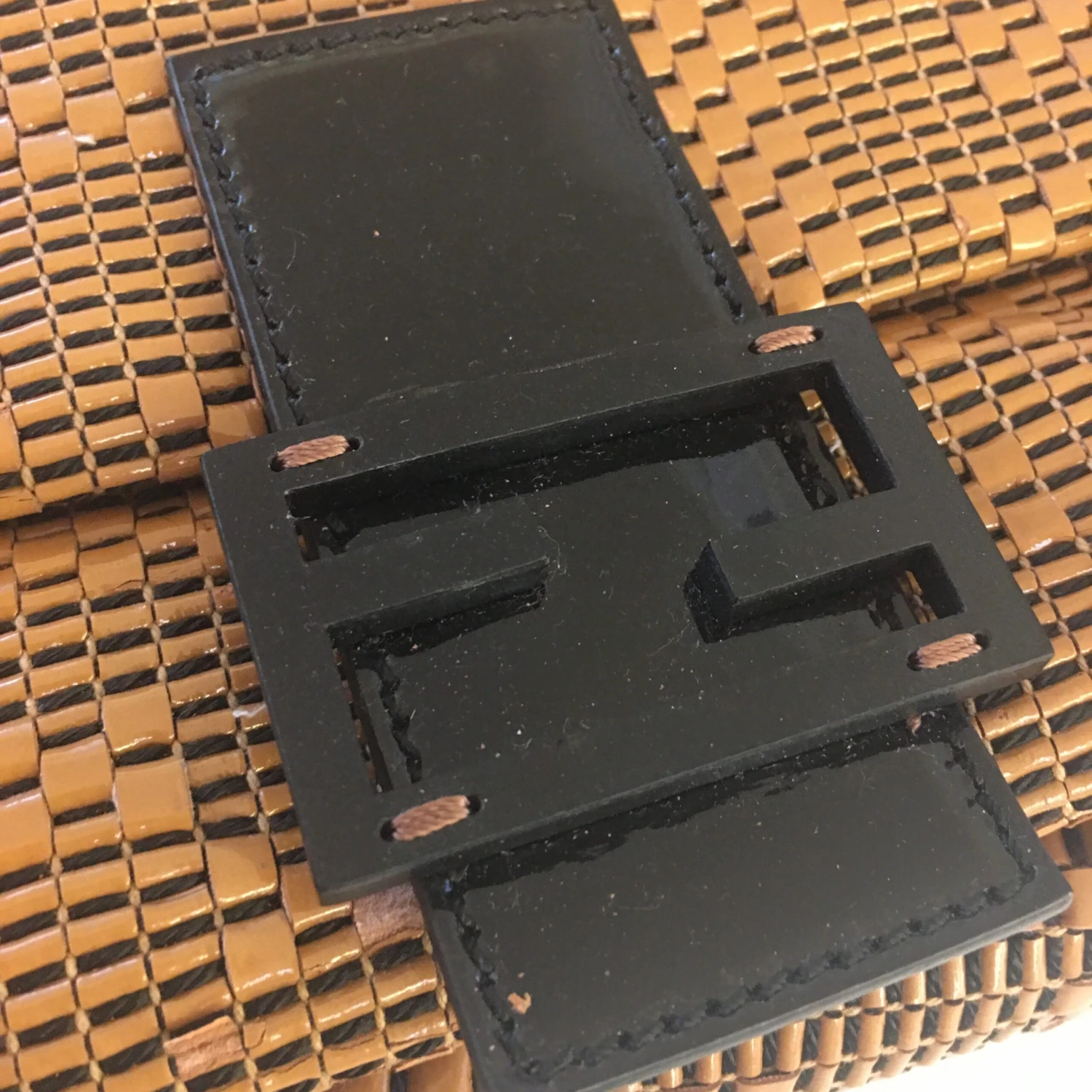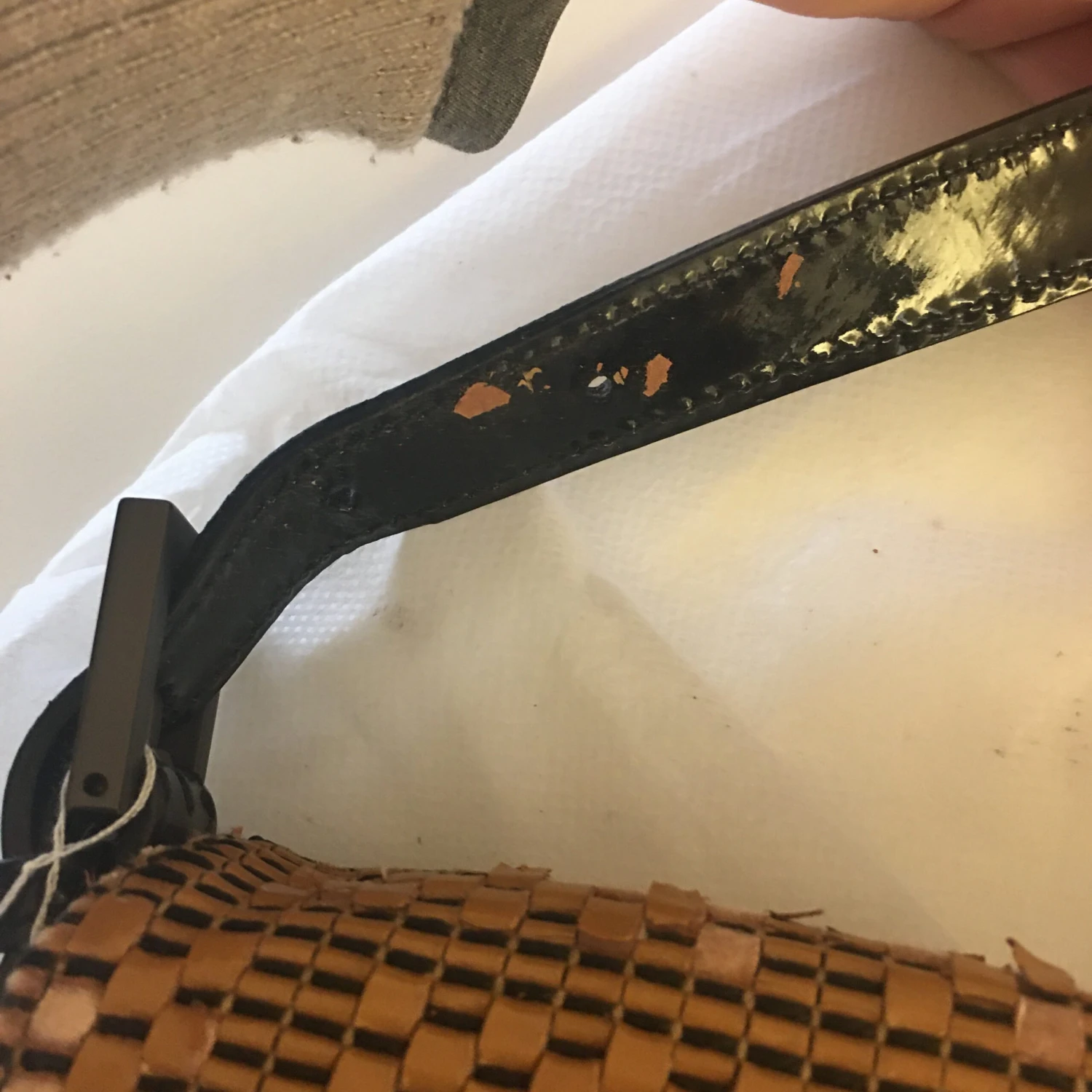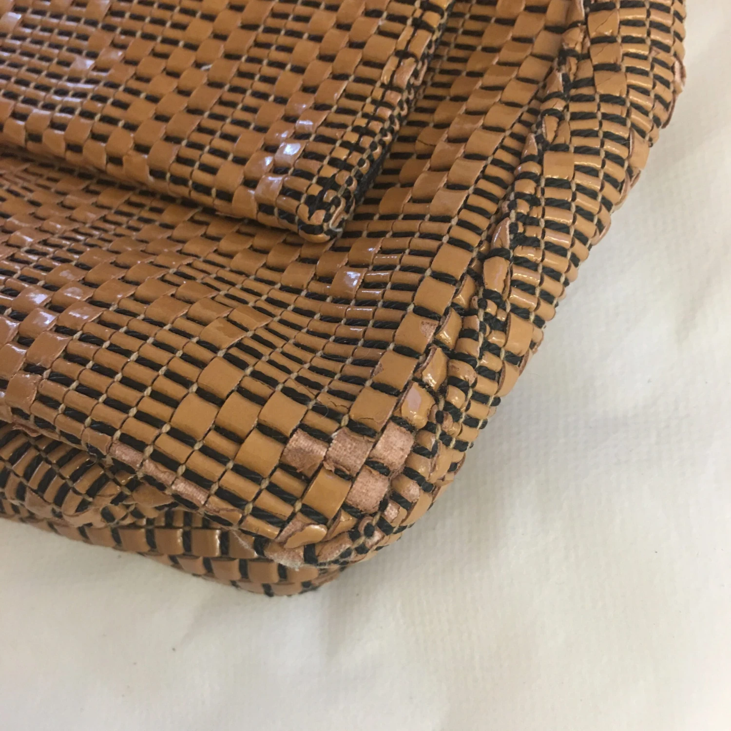 This beautiful bag has a major defect: the patent material is slowly deteriorating and the patent scales are detaching