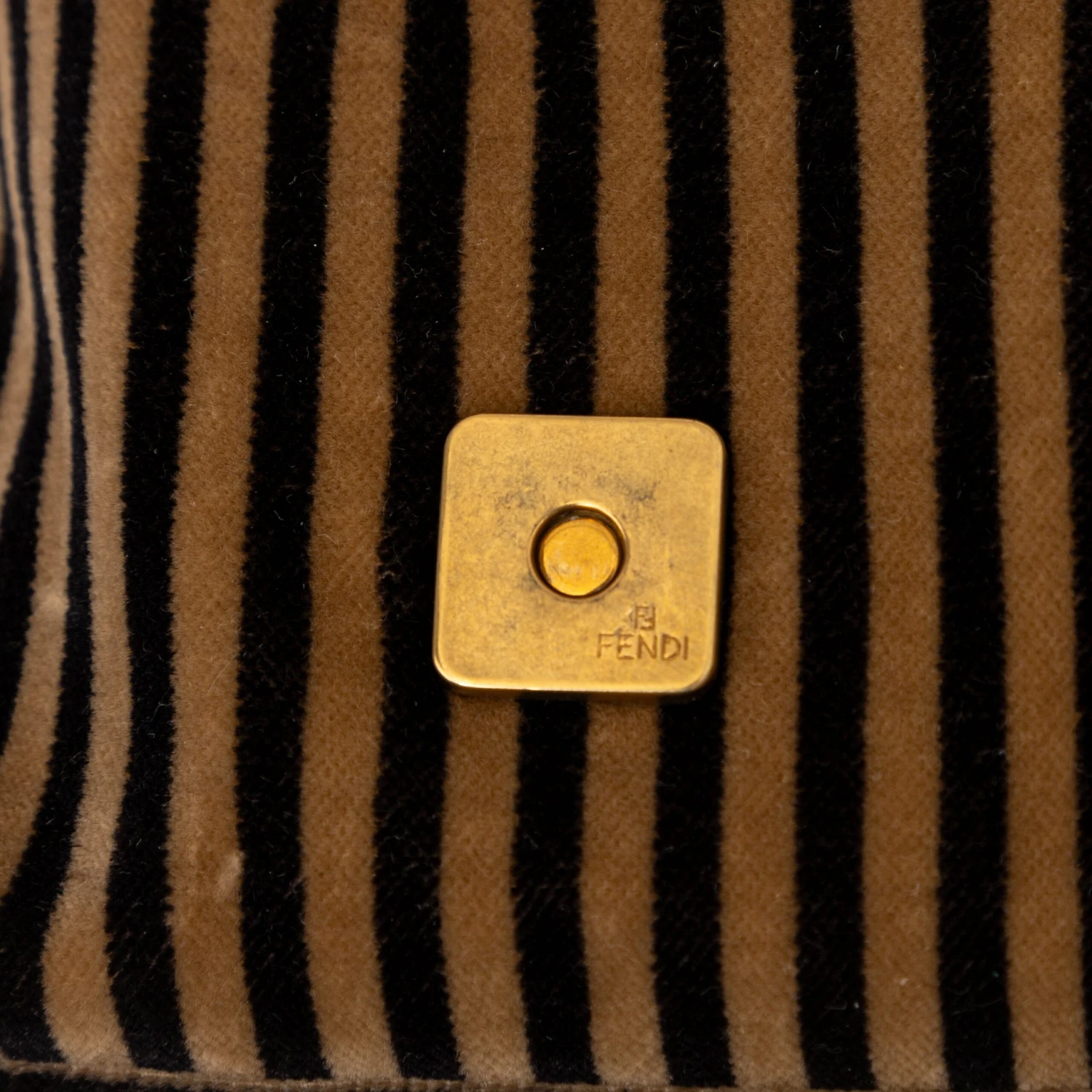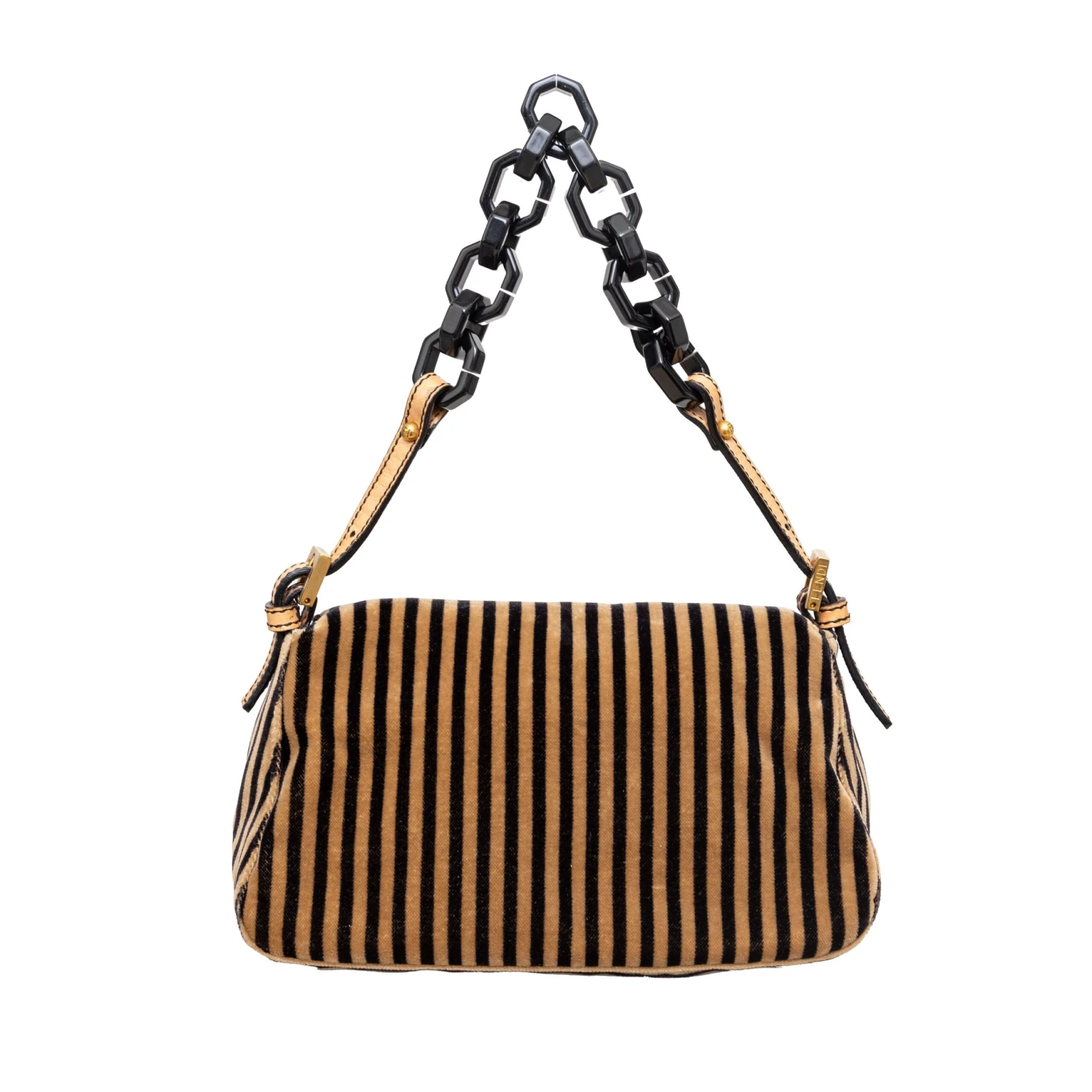 Expertly crafted with a striped velvet fabric, the Fendi vintage baguette handbag features the iconic FF clasp and a unique carrying chain with gold details.