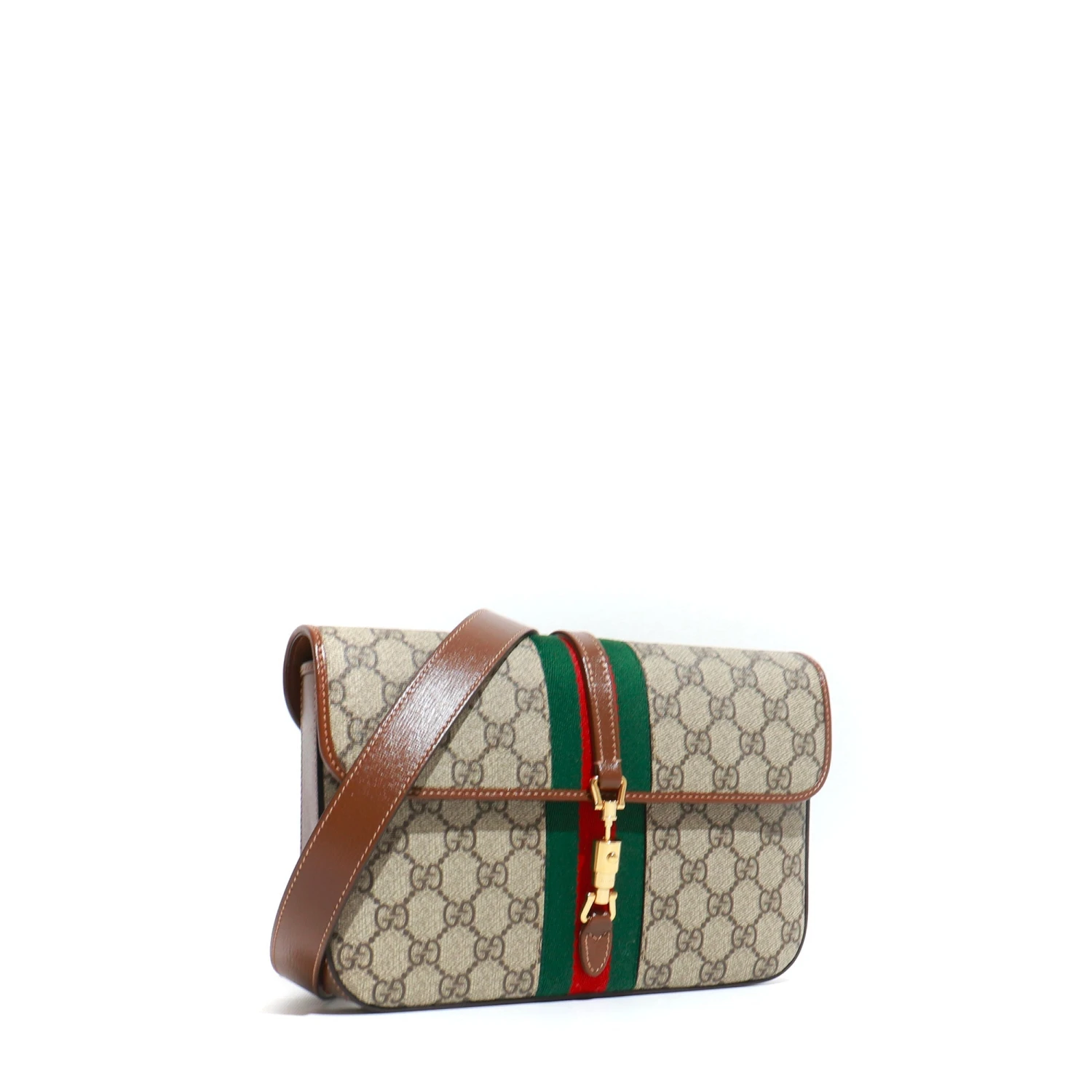 Model: Jackie 1961 Material: Coated canvas | Leather Brown color Gold finishes Dimensions: 24cm x 16cm x 4cm Removable adjustable shoulder strap T90 Belt Pink suede interior