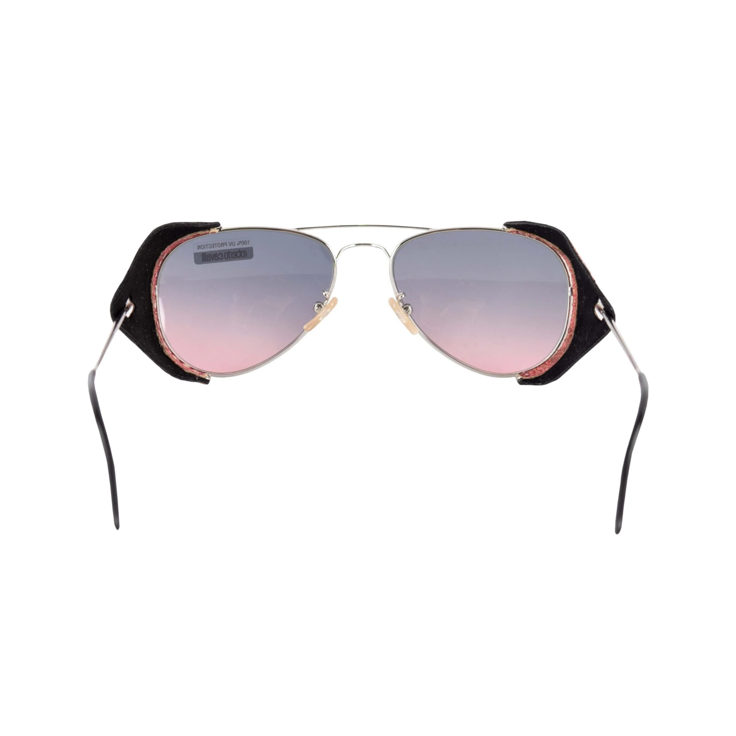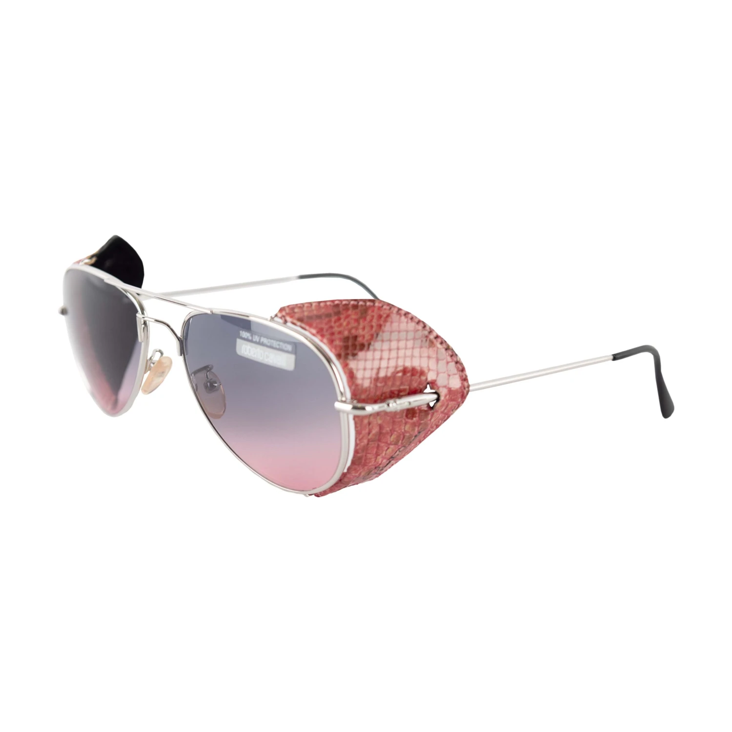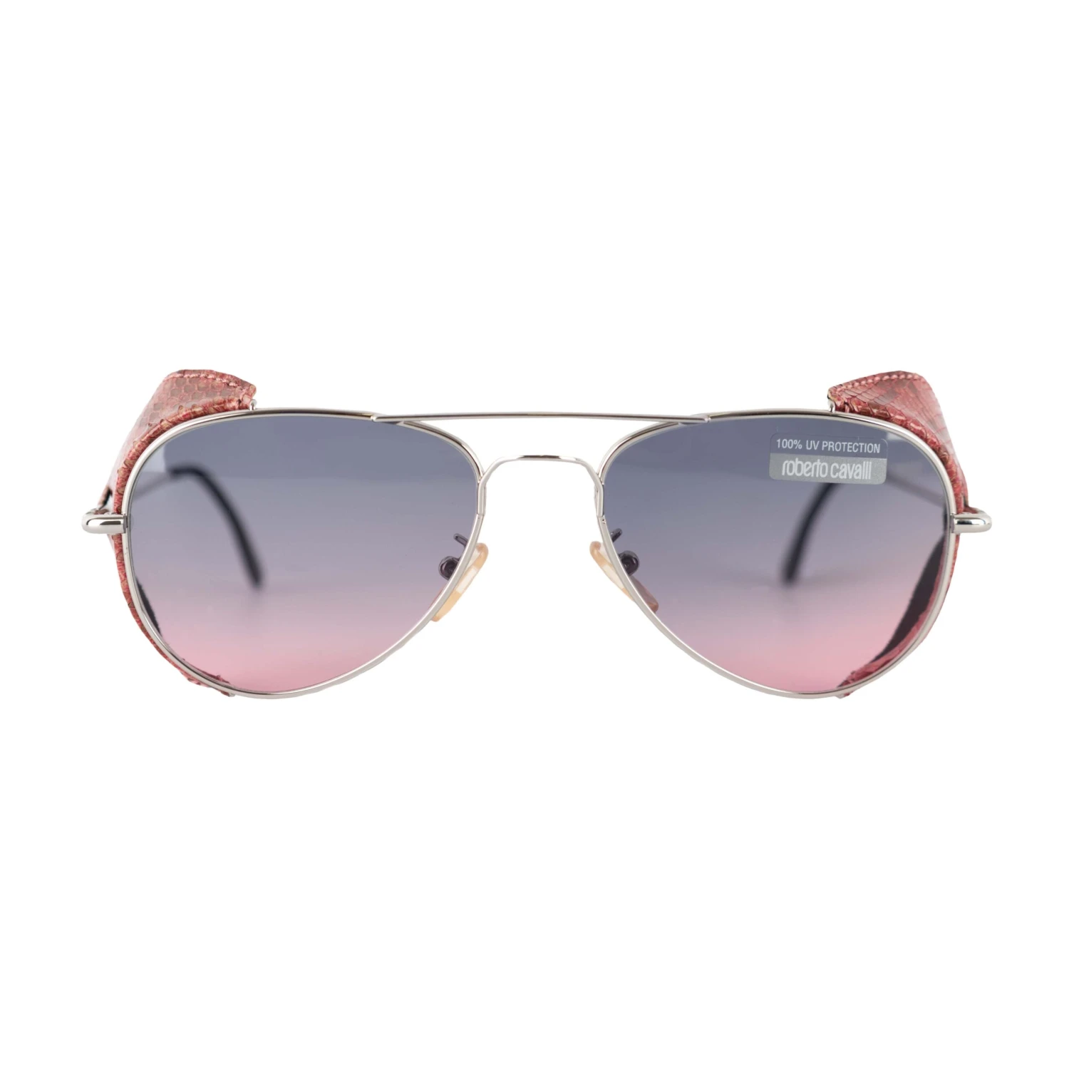 The aviator style sunglasses by Roberto Cavalli are crafted from sleek and durable ruthenium metal, with snakeskin patterned corner covers signed with Roberto Cavalli logo.