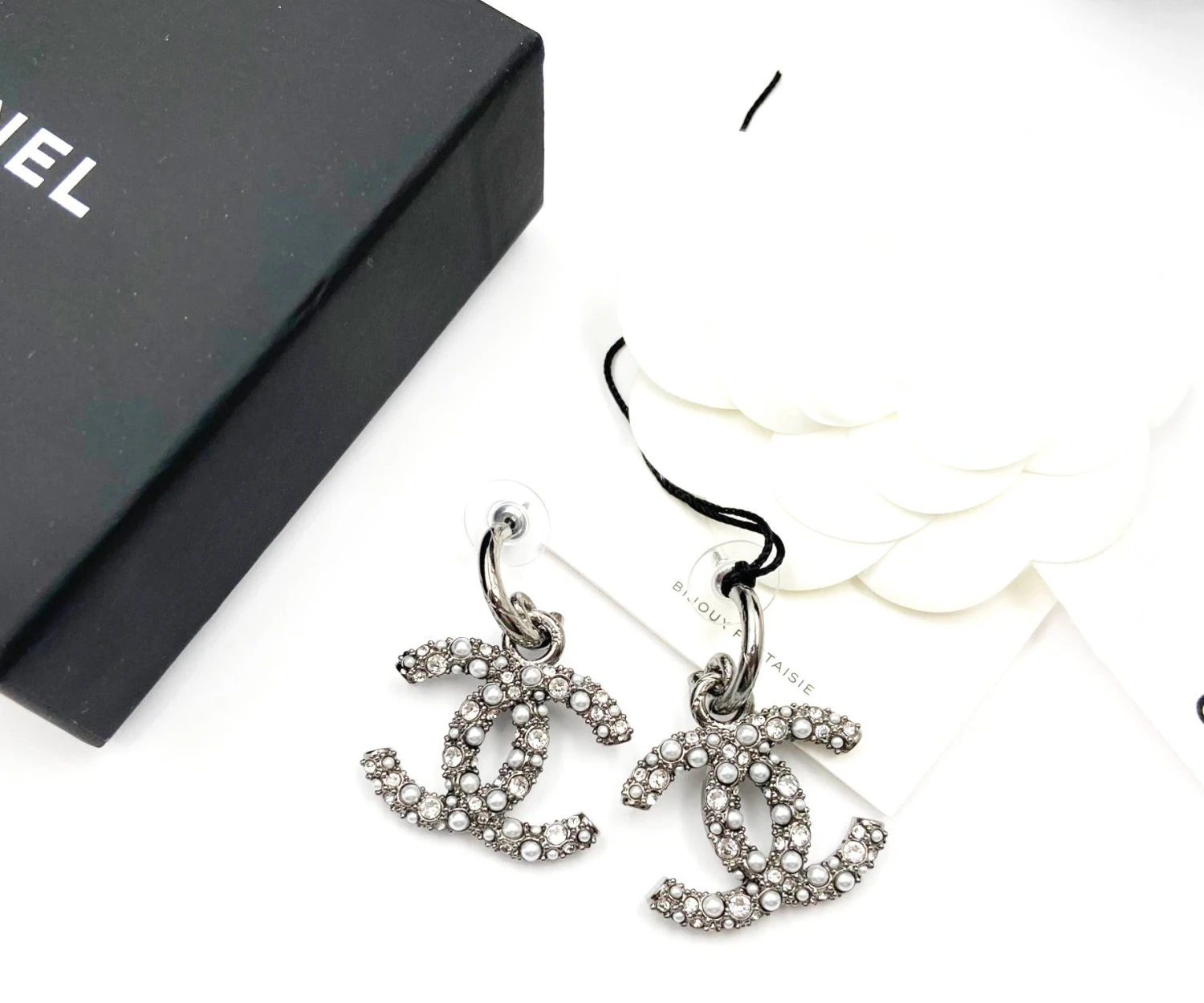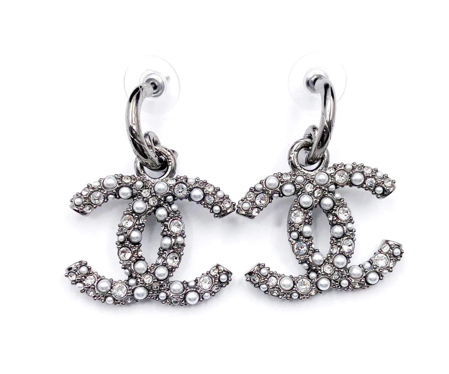 Chanel Brand New Grey CC Crystal Pearl XL Piercing Earrings.