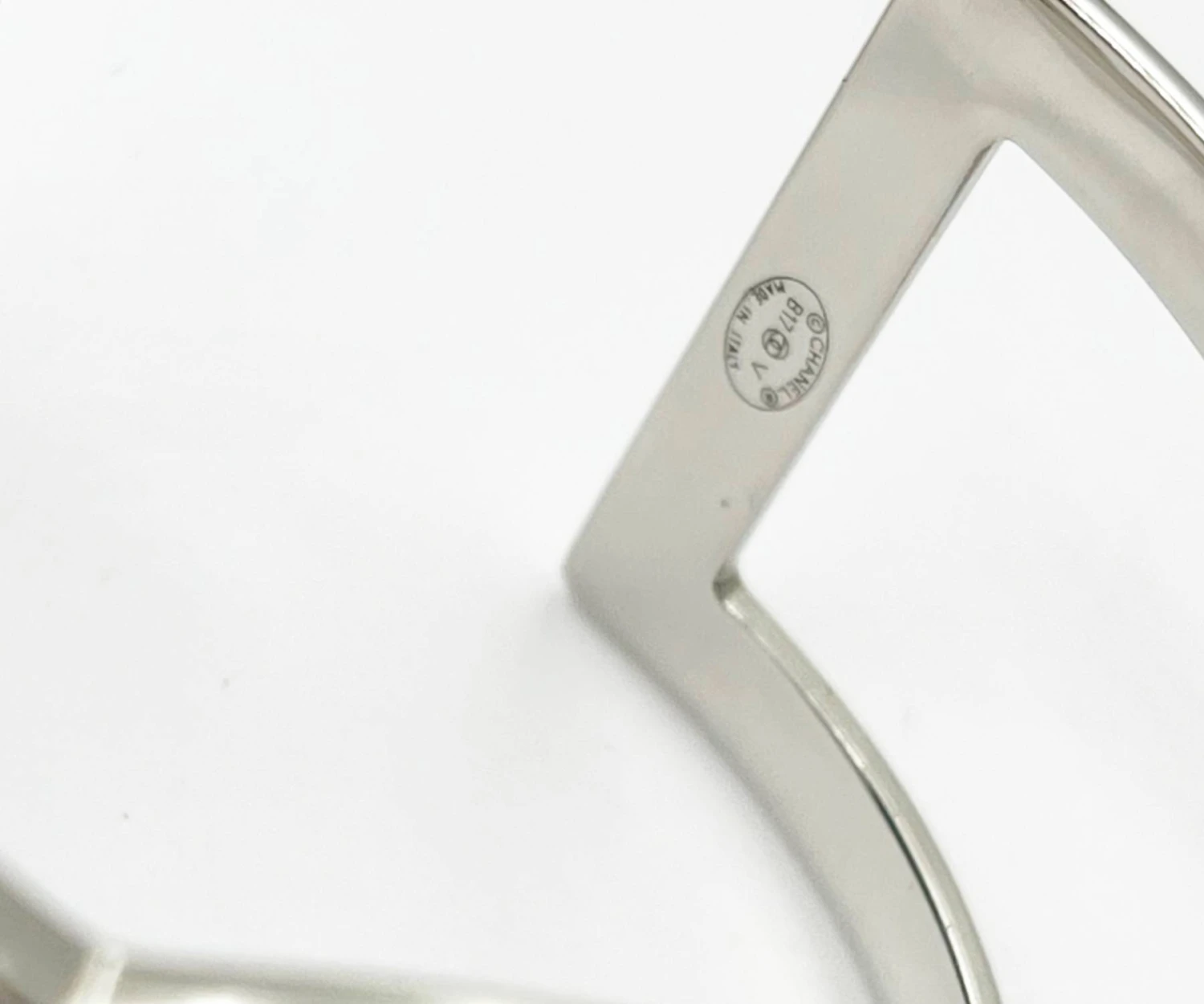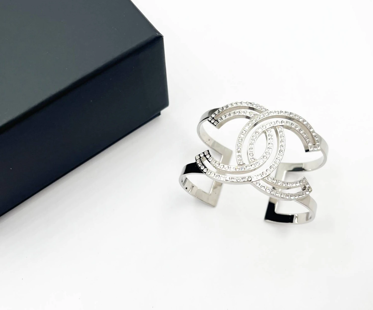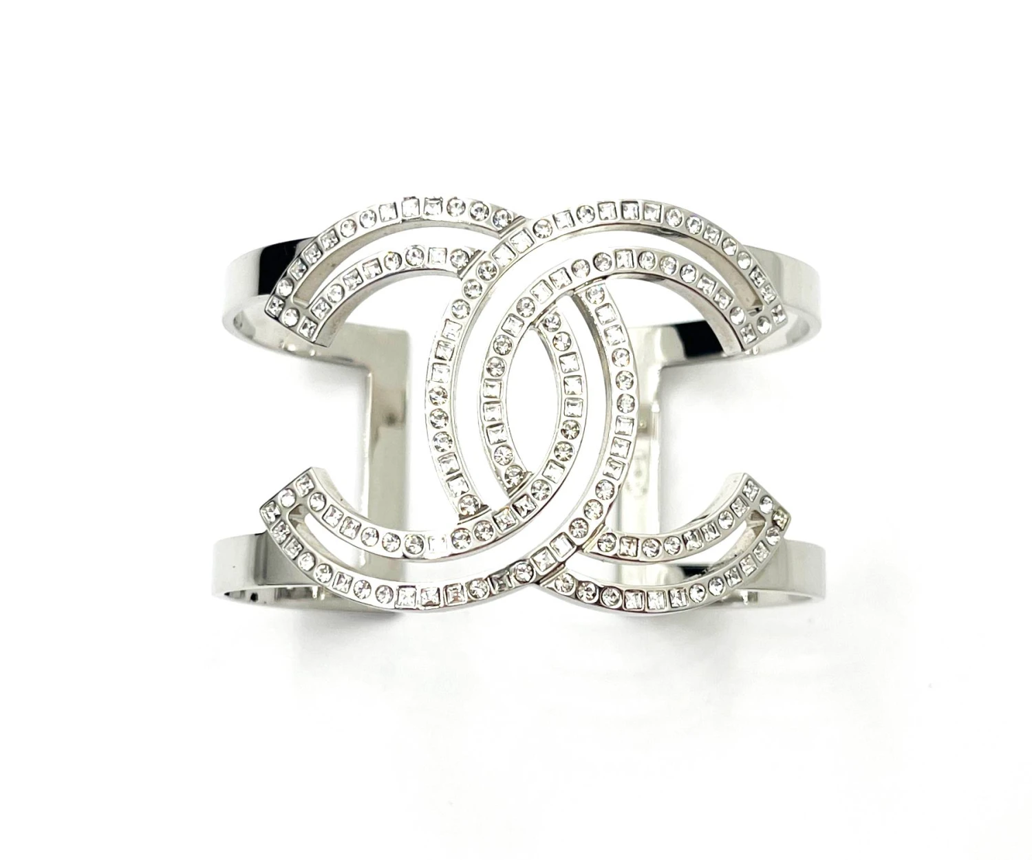 Chanel Classic Silver CC Square Round Crystal Cutout Double Cuff Bracelet.