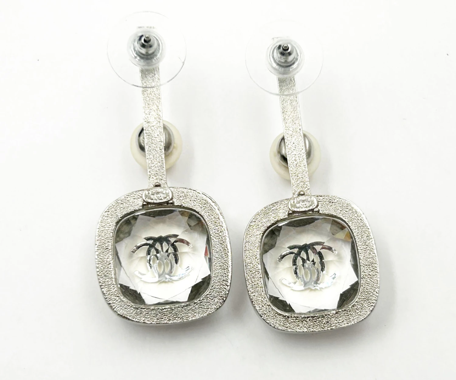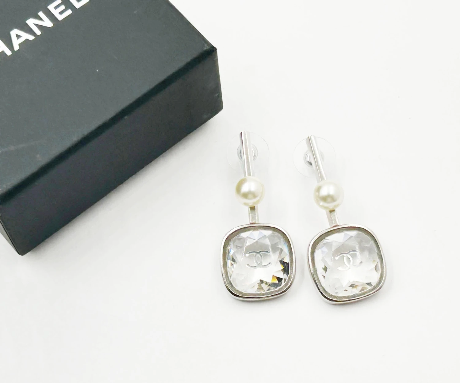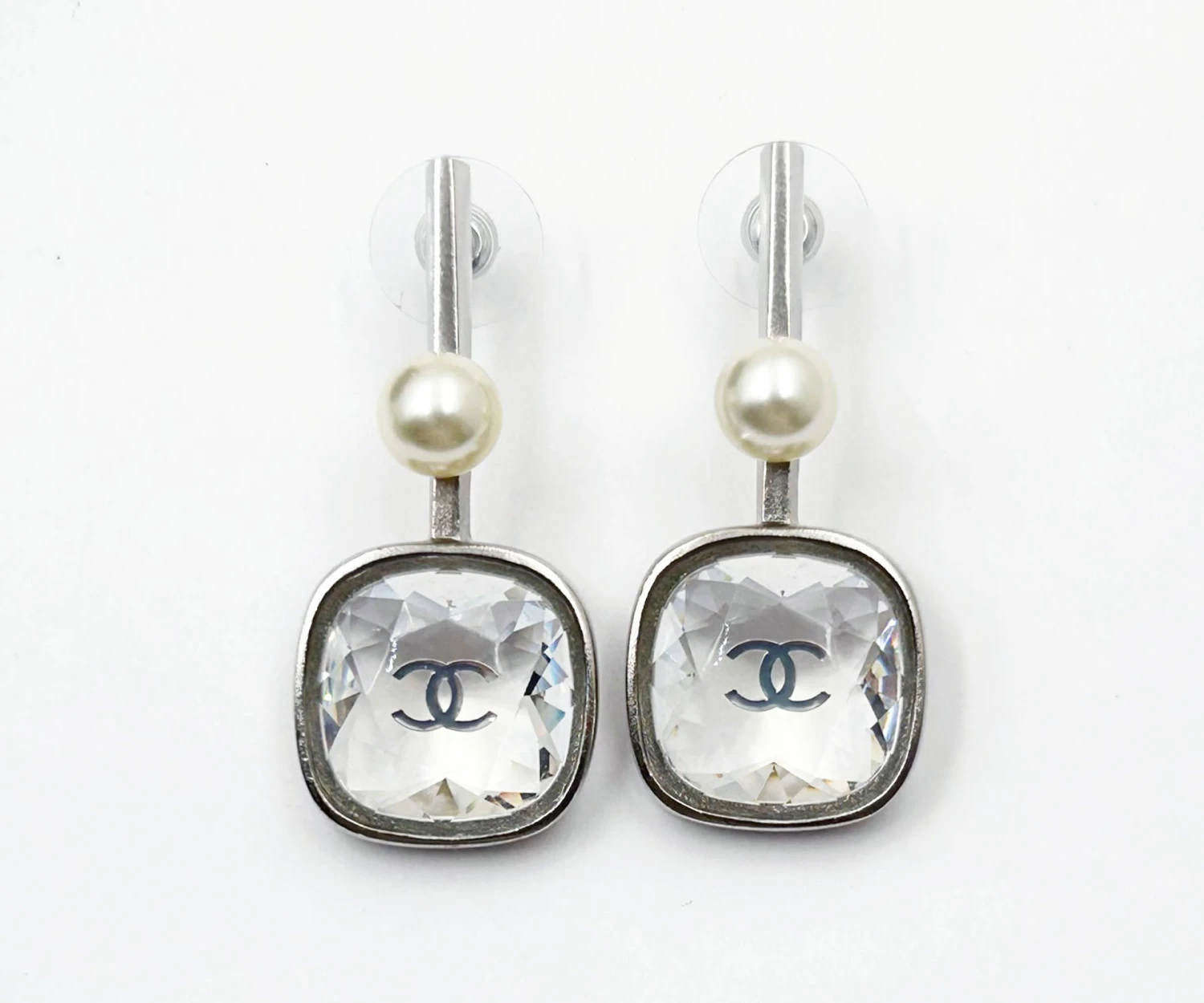 Chanel Silver CC Princess Crystal Geo Pearl Large Drop Piercing Earrings.