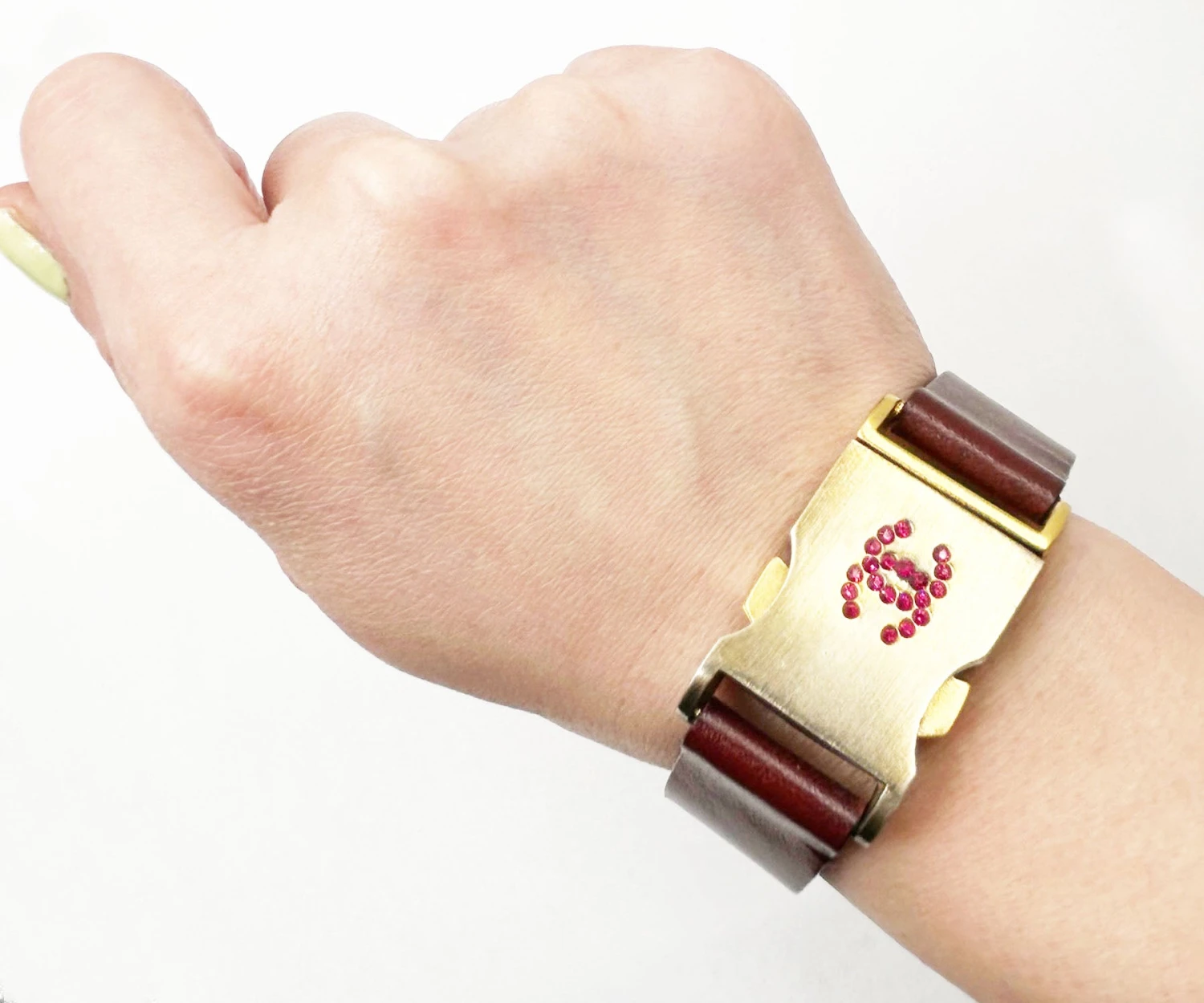 Chanel Vintage Red Crystal Gold Buckle Leather Belt Bracelet.