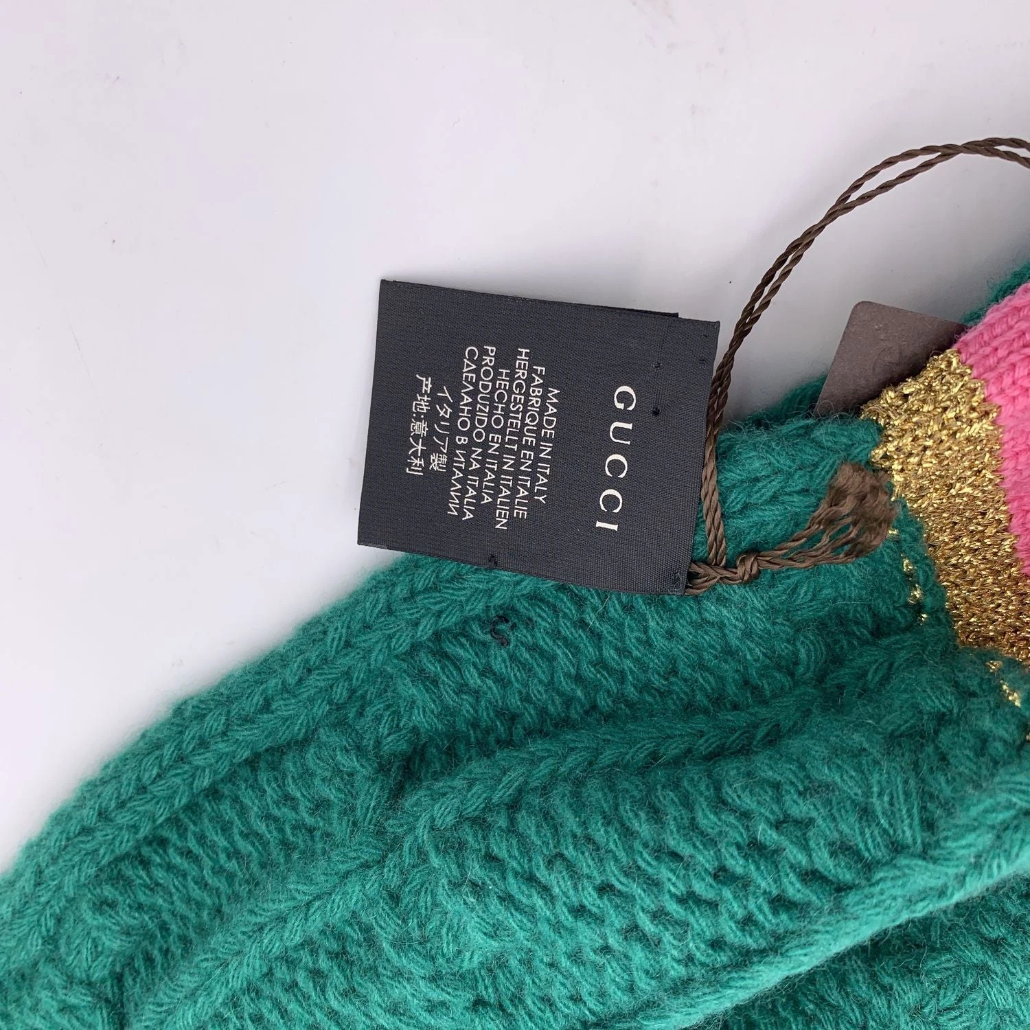 Gucci Green Cable Knit Unisex Scarf With Pink And Gold Striped Hem.
