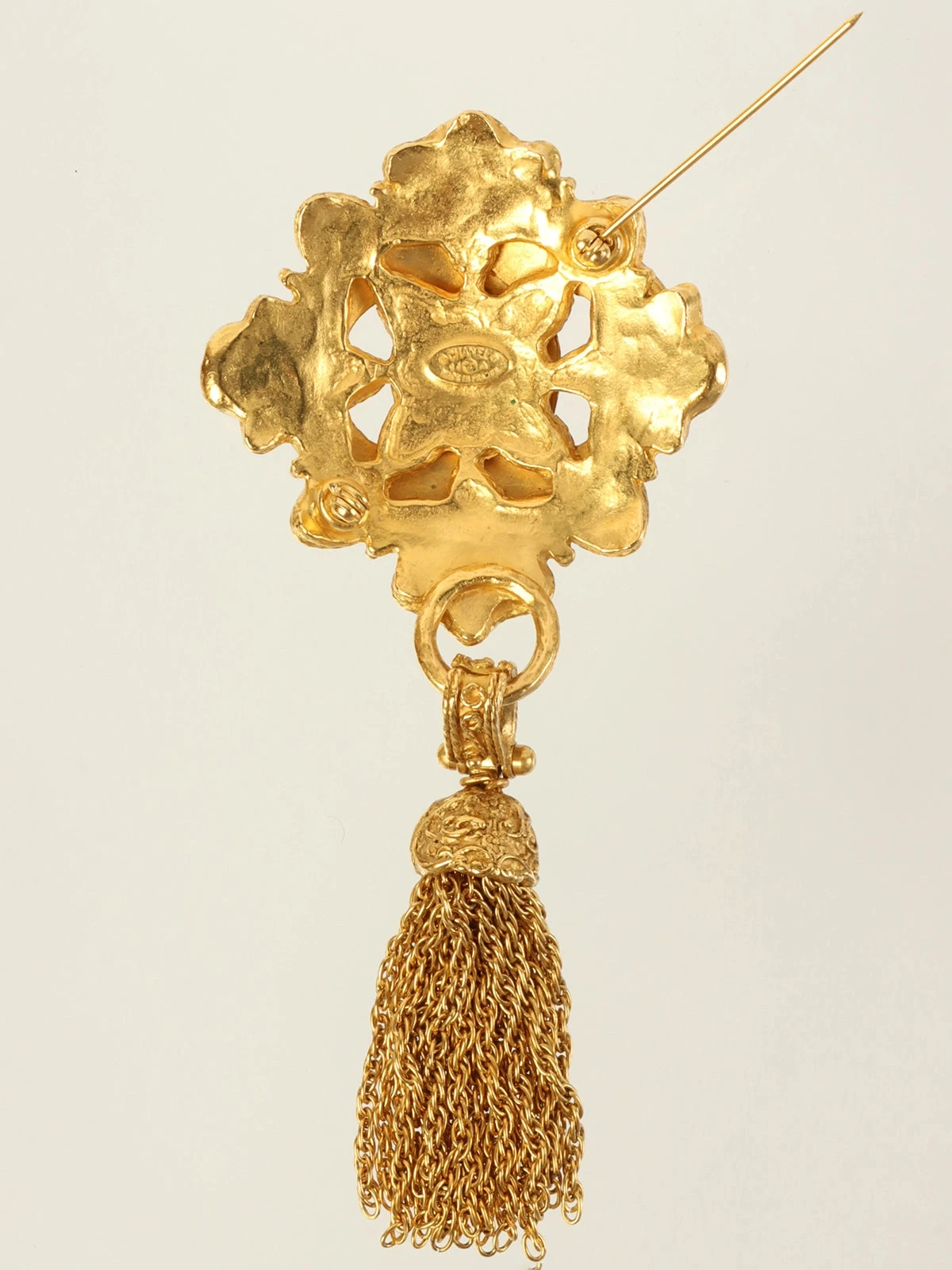 CHANEL 1994 Made Gripoix Design Cutout Fringe Cc Mark Brooch Gold/Green/Red