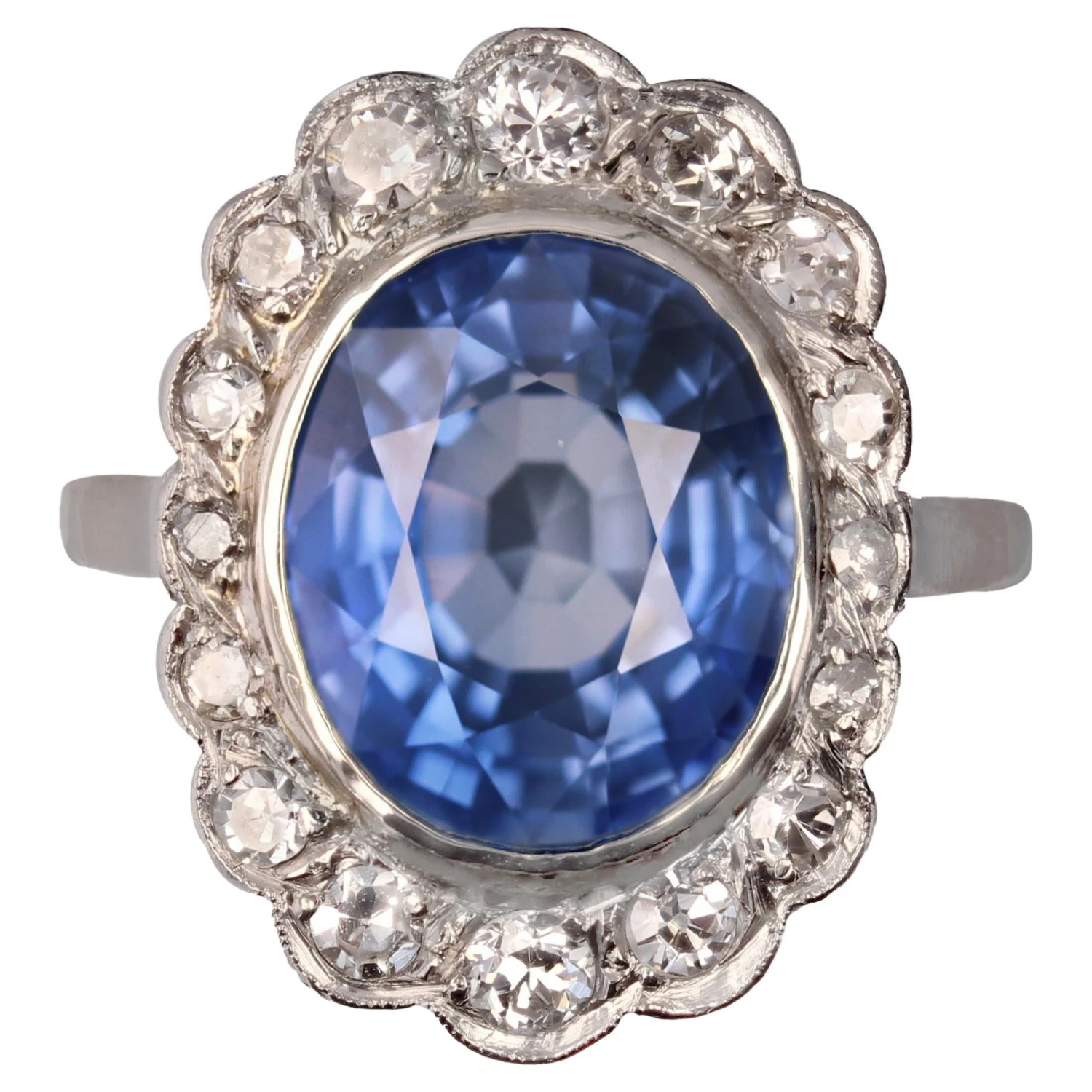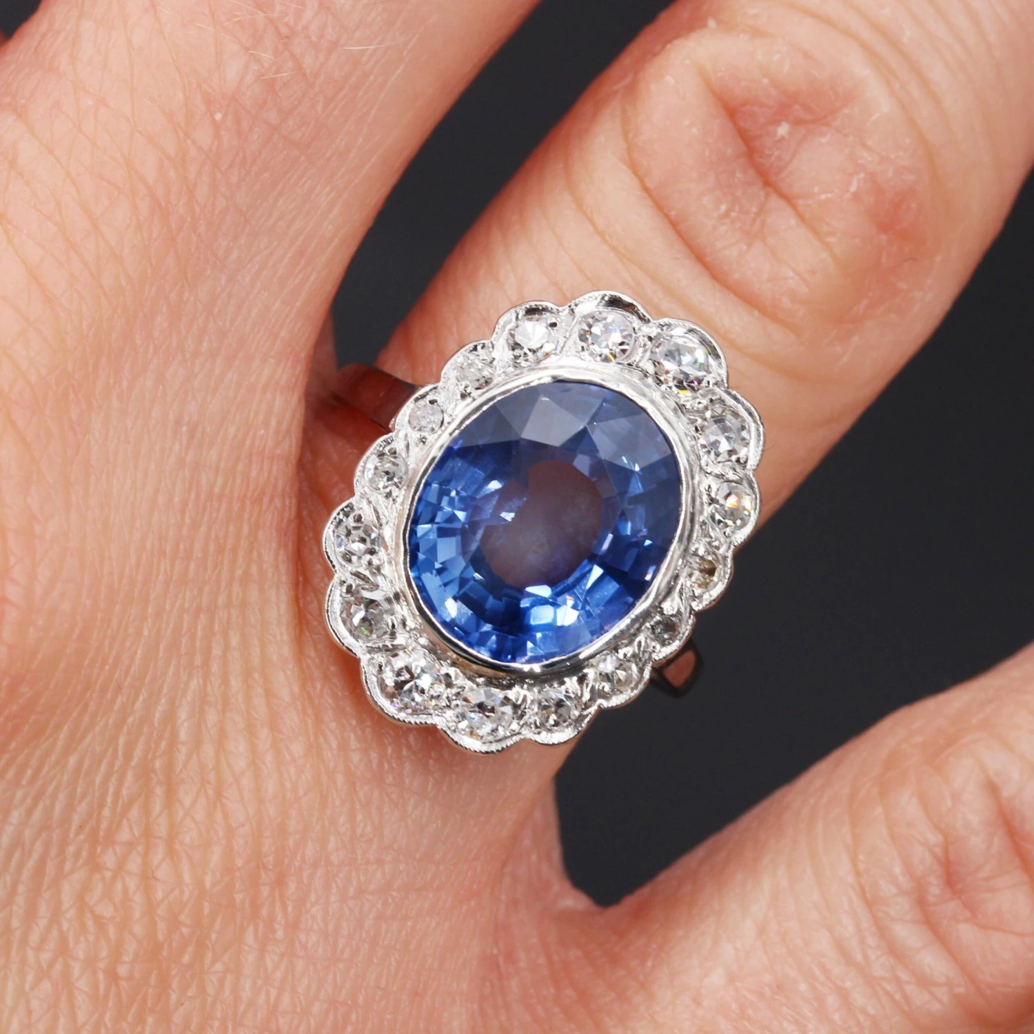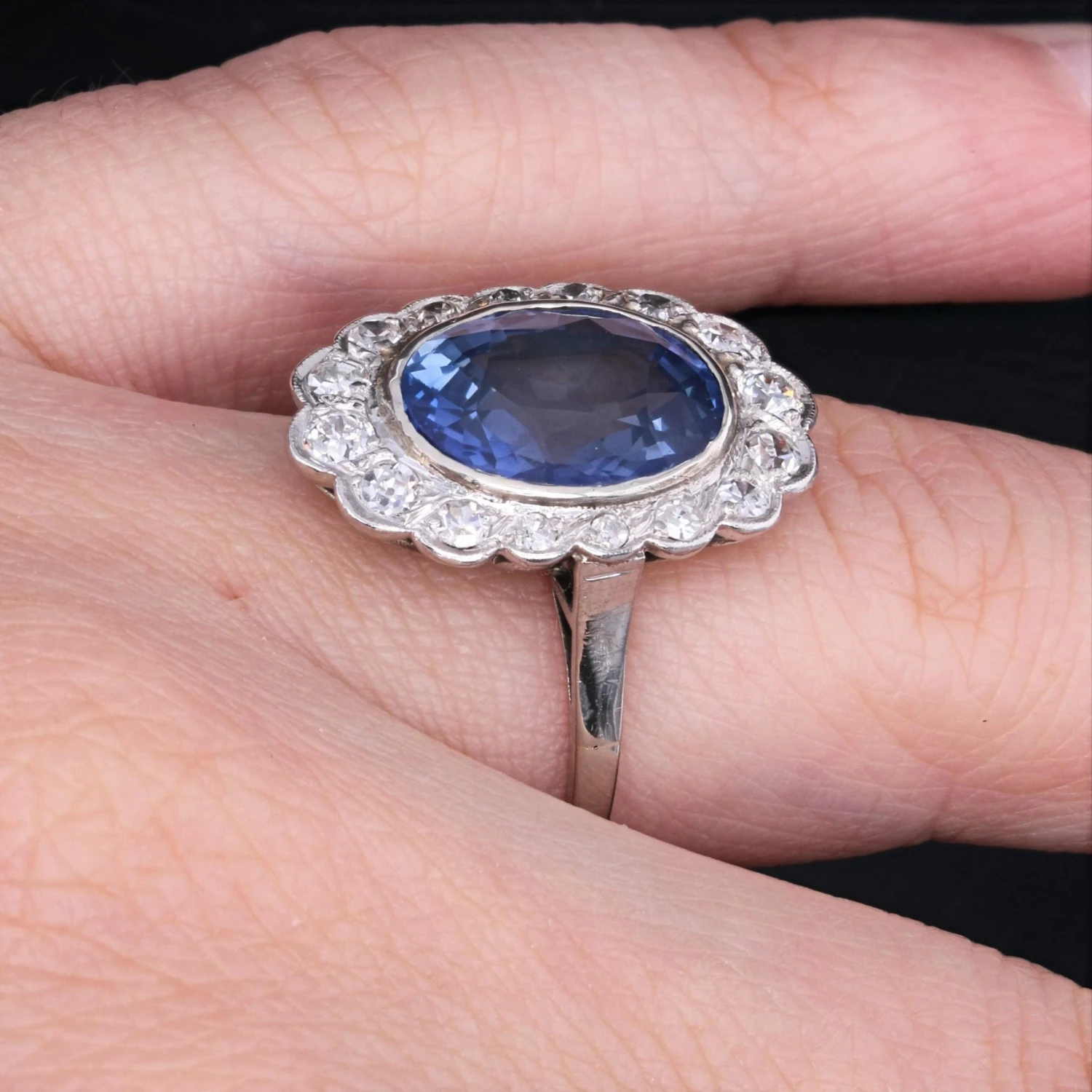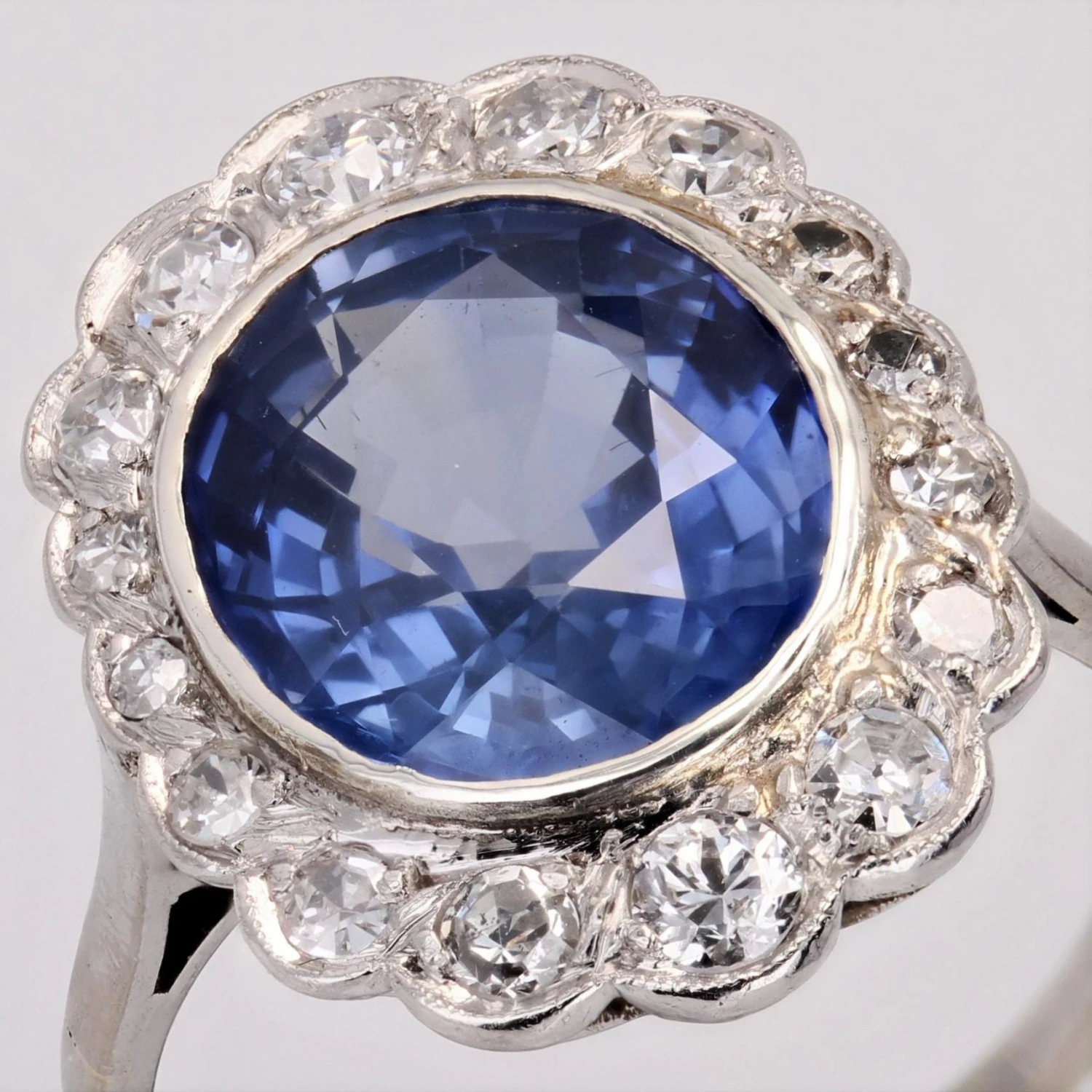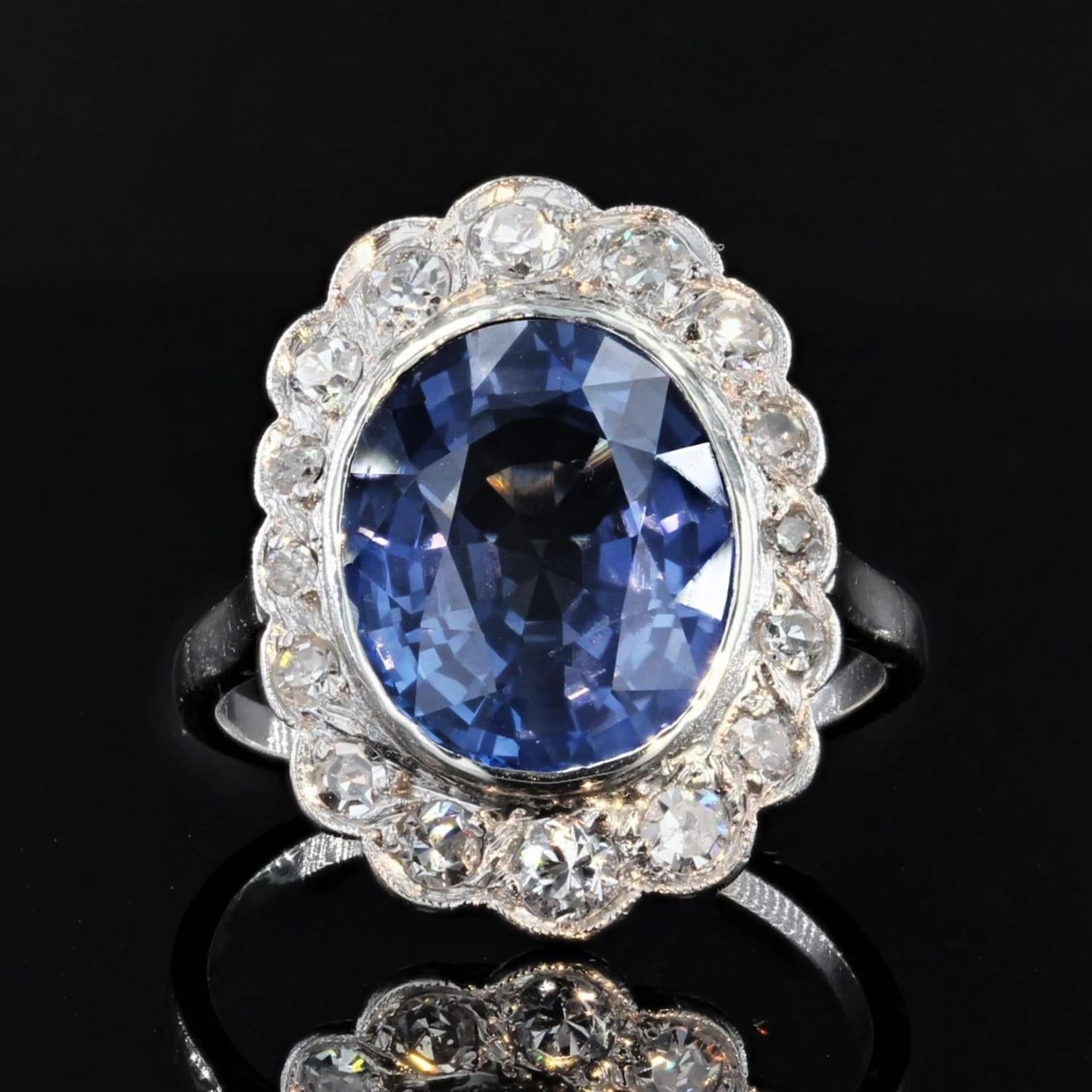 Of oval shape, a light blue sapphire decorates the top surrounded by 8/8 cut and antique brilliant- cut diamonds.The basket is openwork.