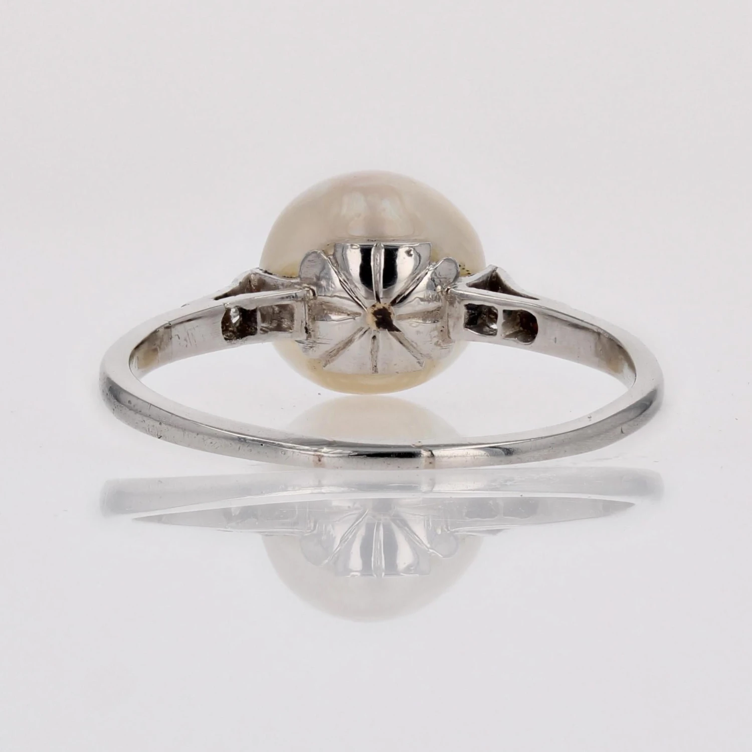 A great classic of antique jewelry, this ring is adorned with a pearly white oriental cultured pearl, with 2×3 8/8-cut diamonds on either side and at the start of the band.