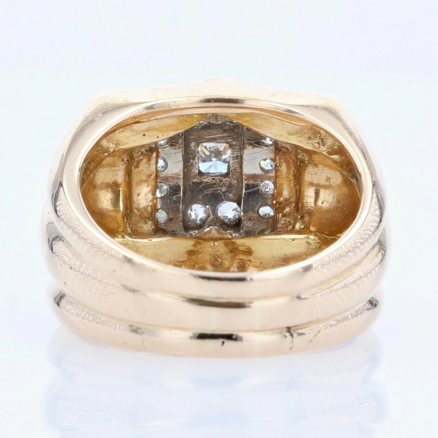Important tank ring, the top of this antique signet ring is bulging and set with lines of rose-cut diamonds.