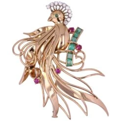 Magnificent bestiary brooch, it represents a bird of paradise set with a line of calibrated emeralds, round rubies sprinkled on its plumage and modern brilliant-cut diamonds on its crest.