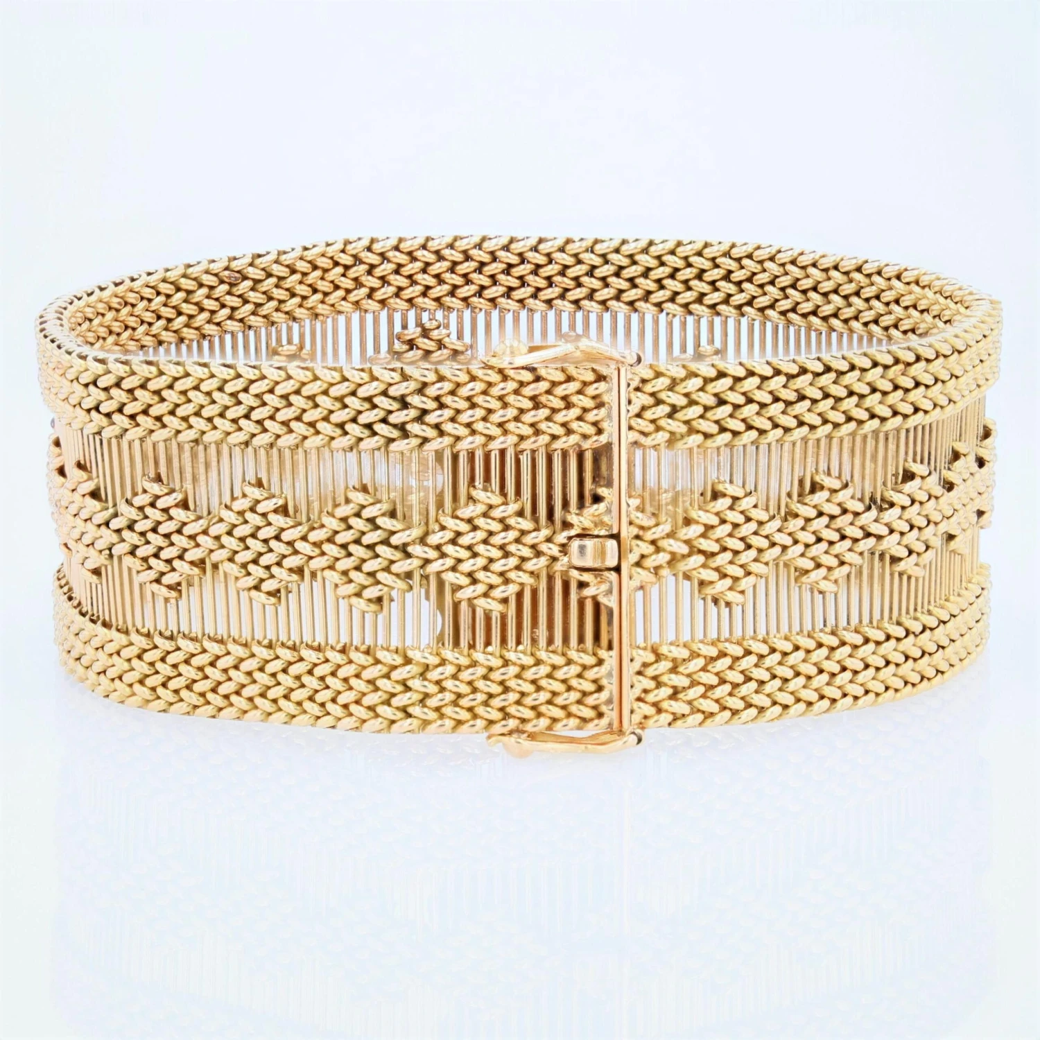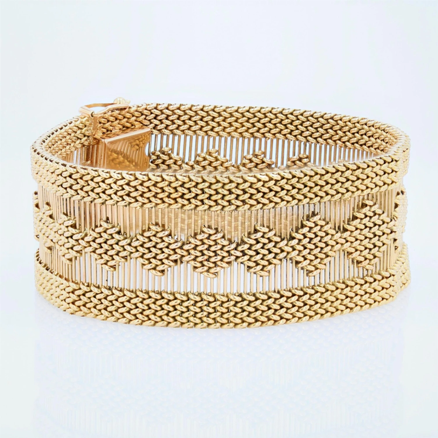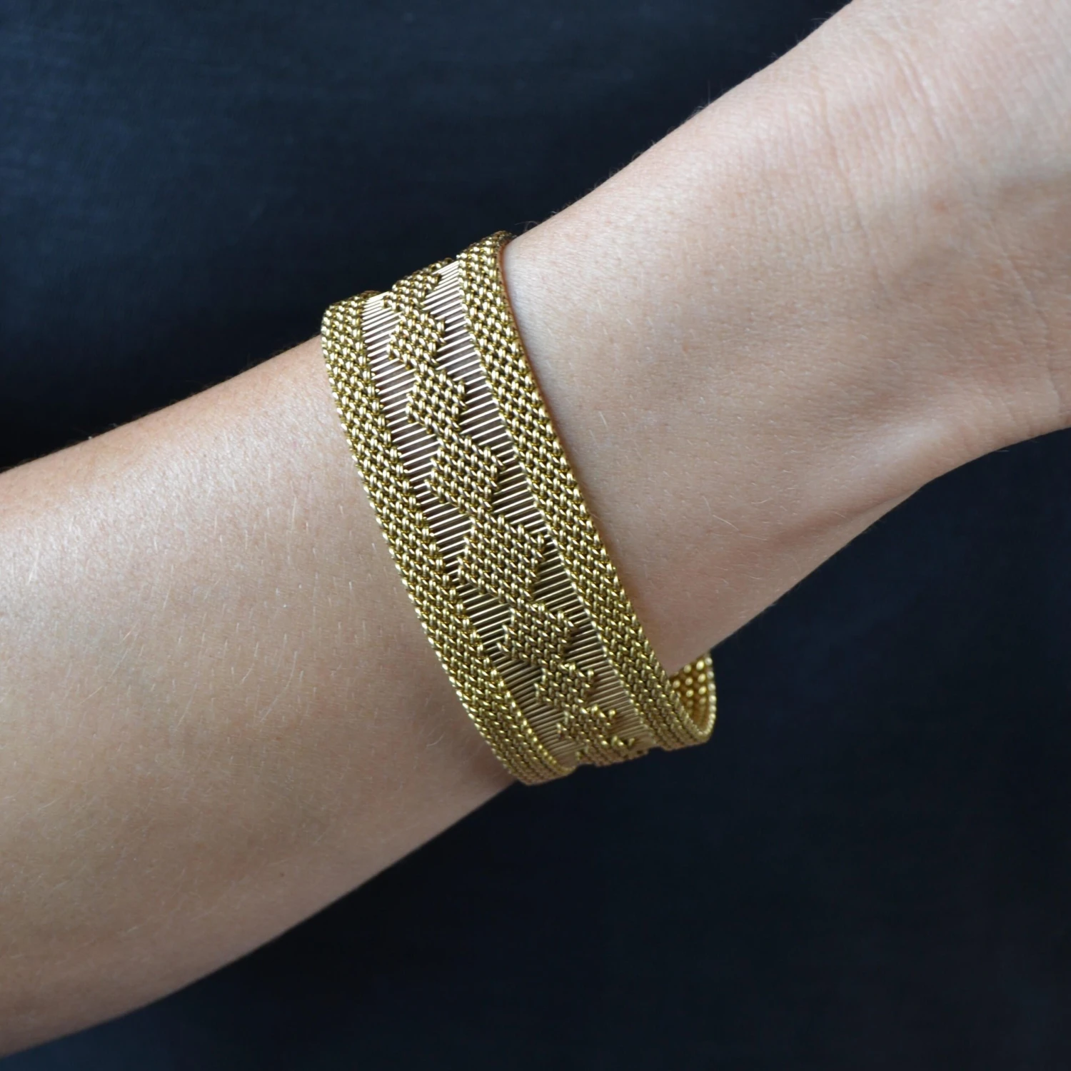This antique golden bracelet is composed of a flexible woven golden mesh with a central openwork feature.