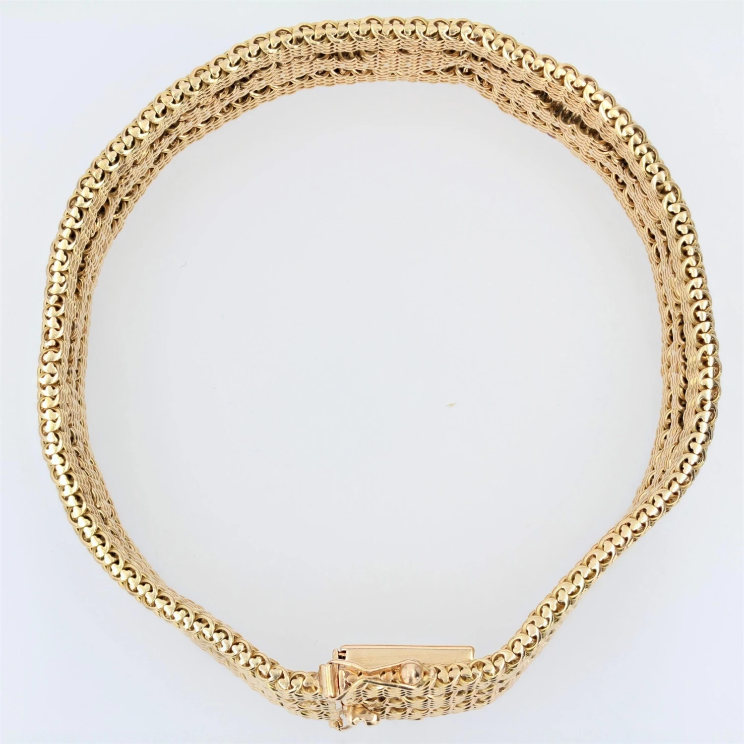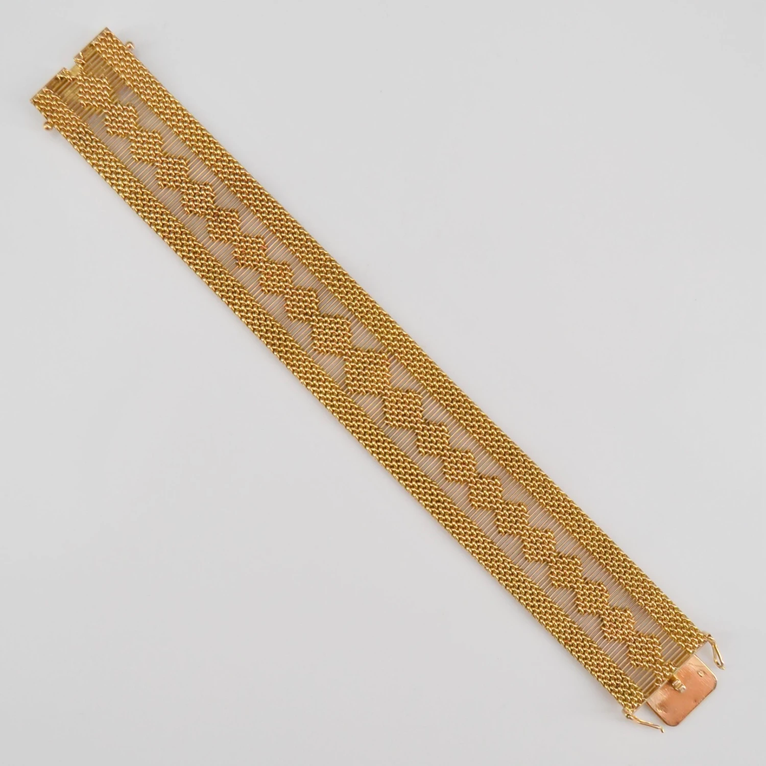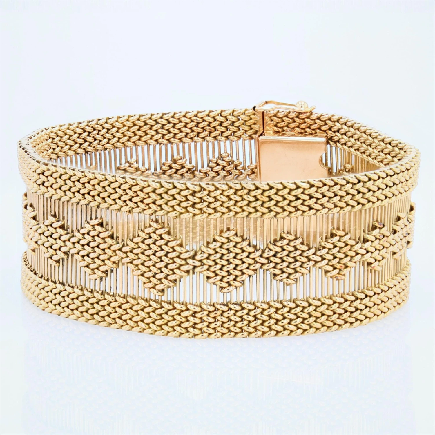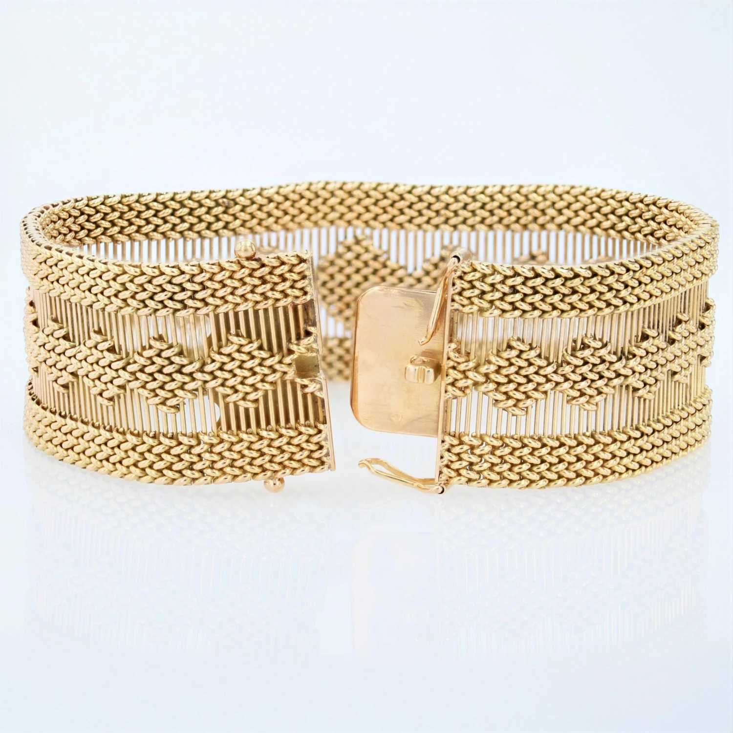 This antique golden bracelet is composed of a flexible woven golden mesh with a central openwork feature.