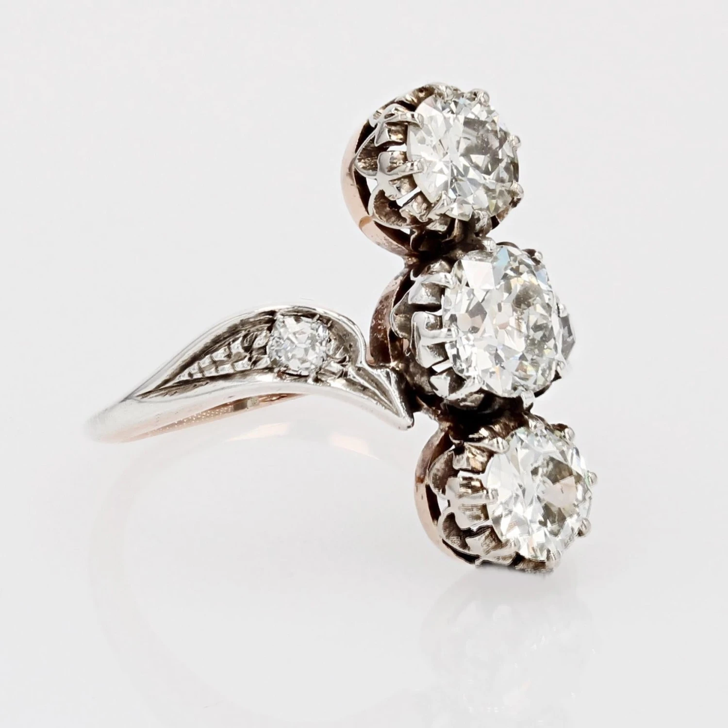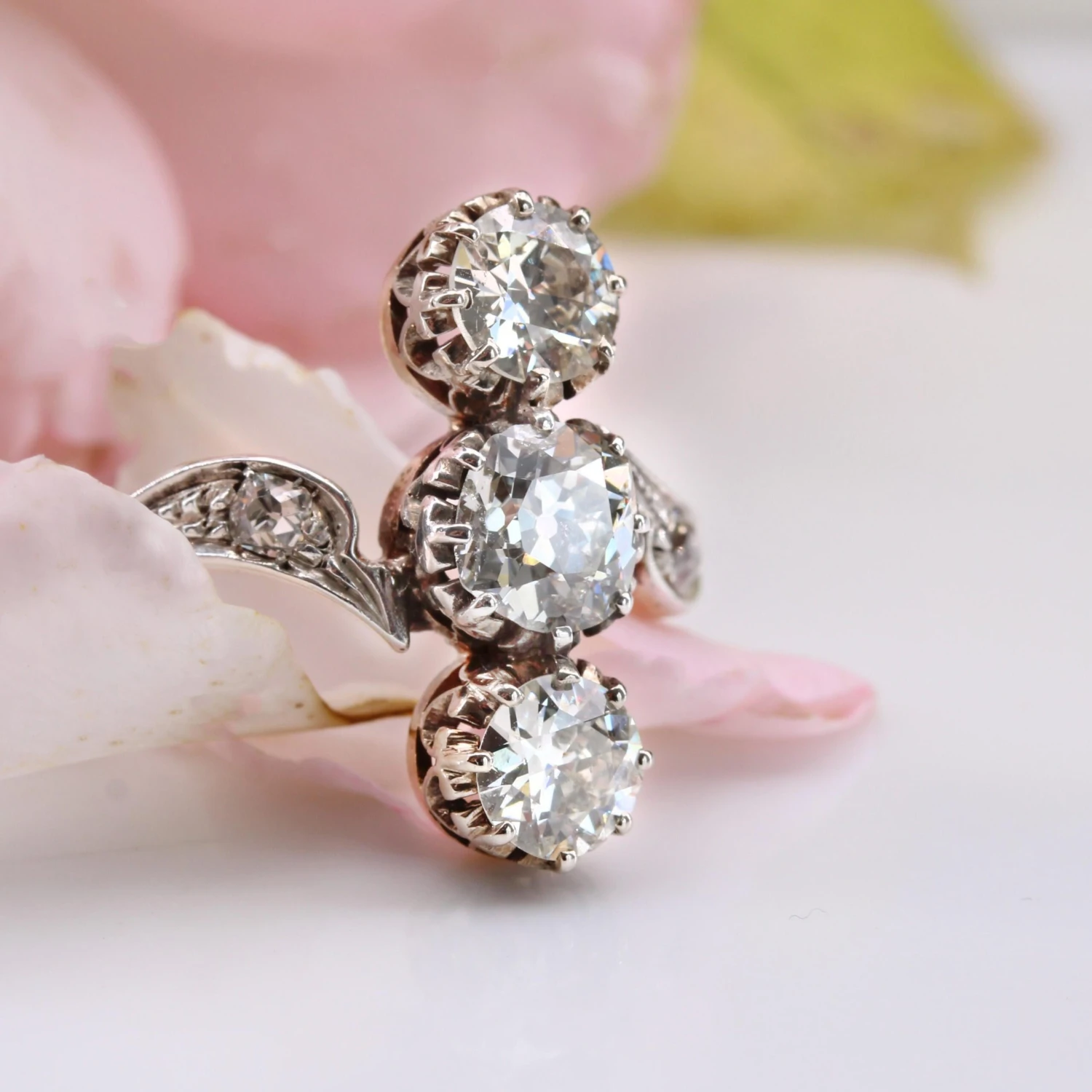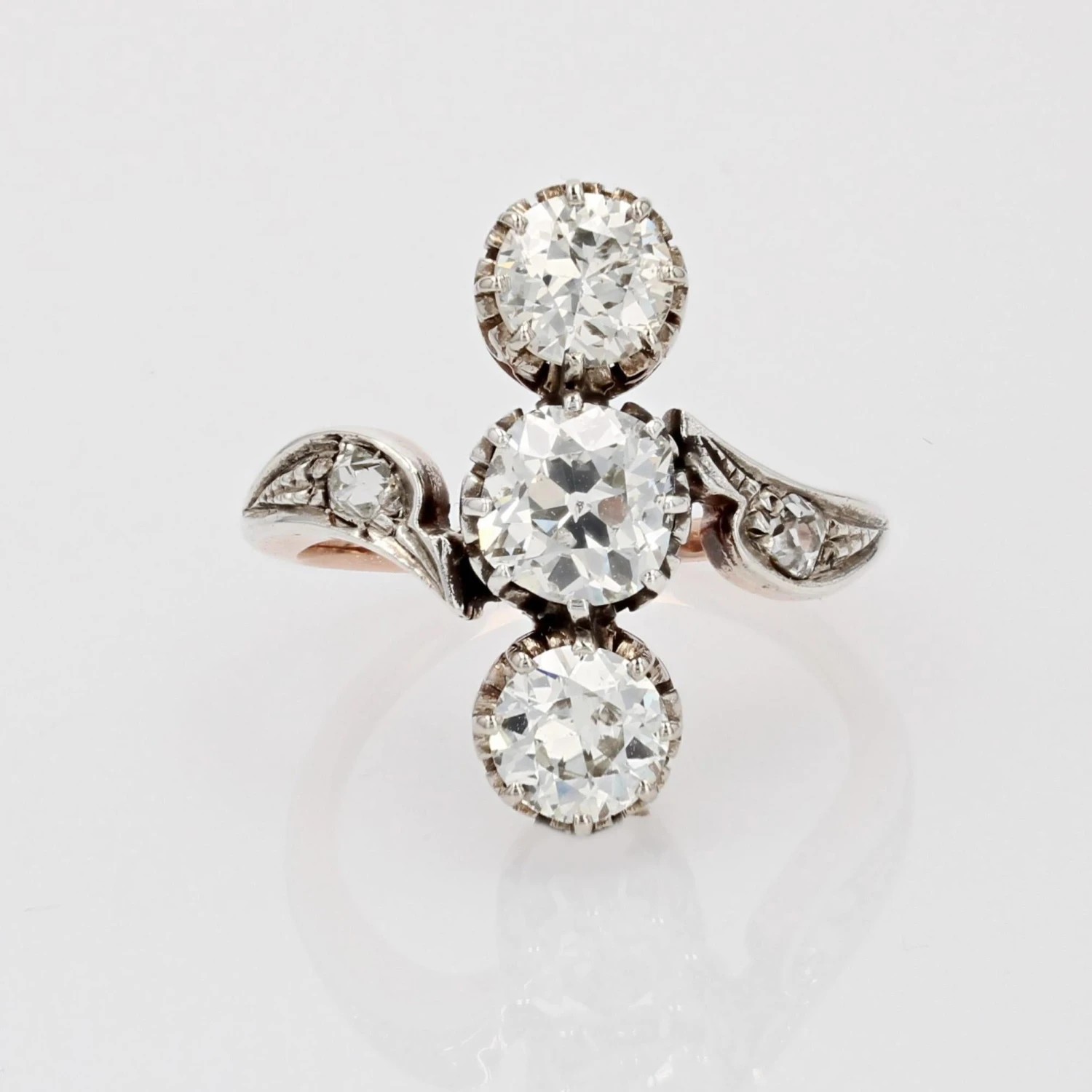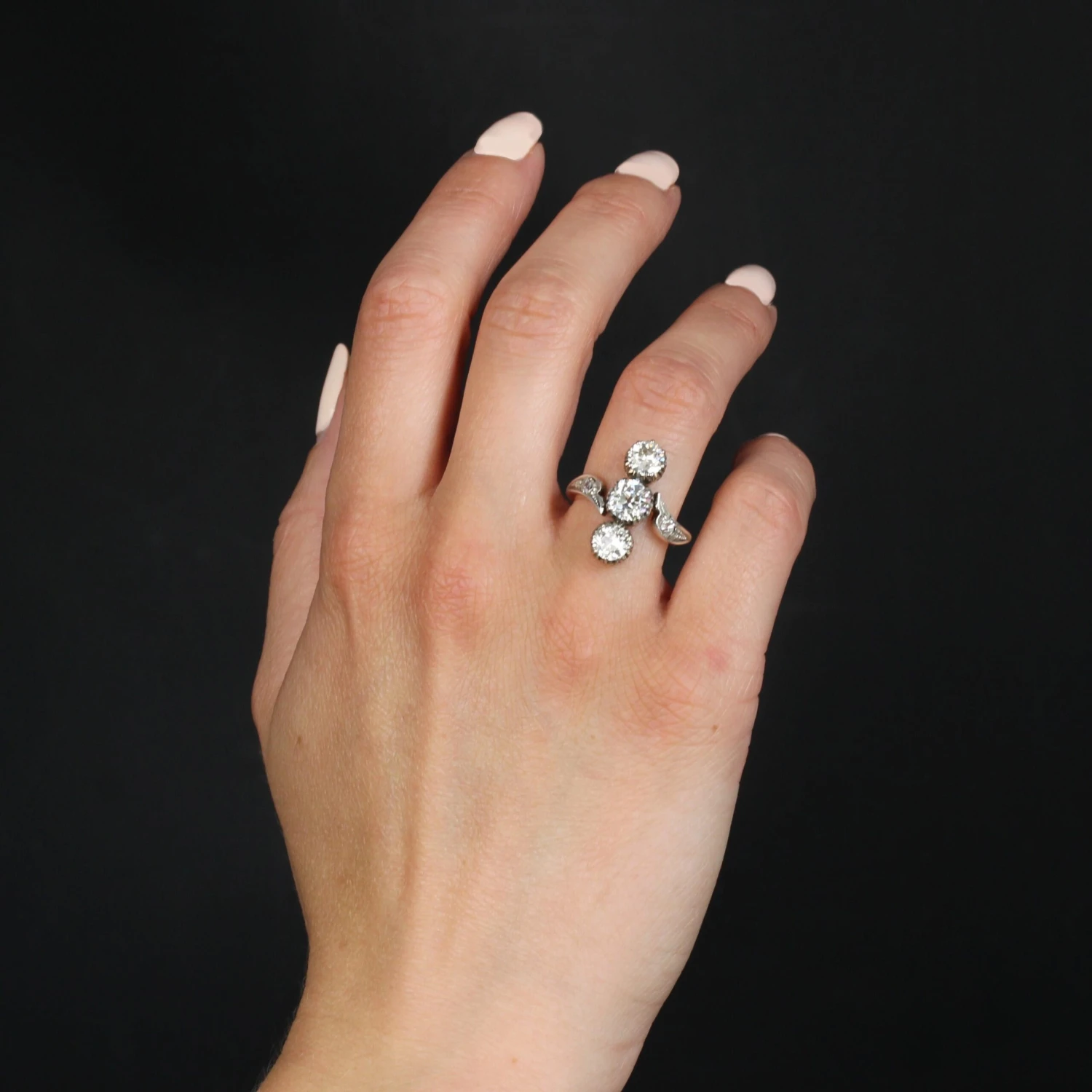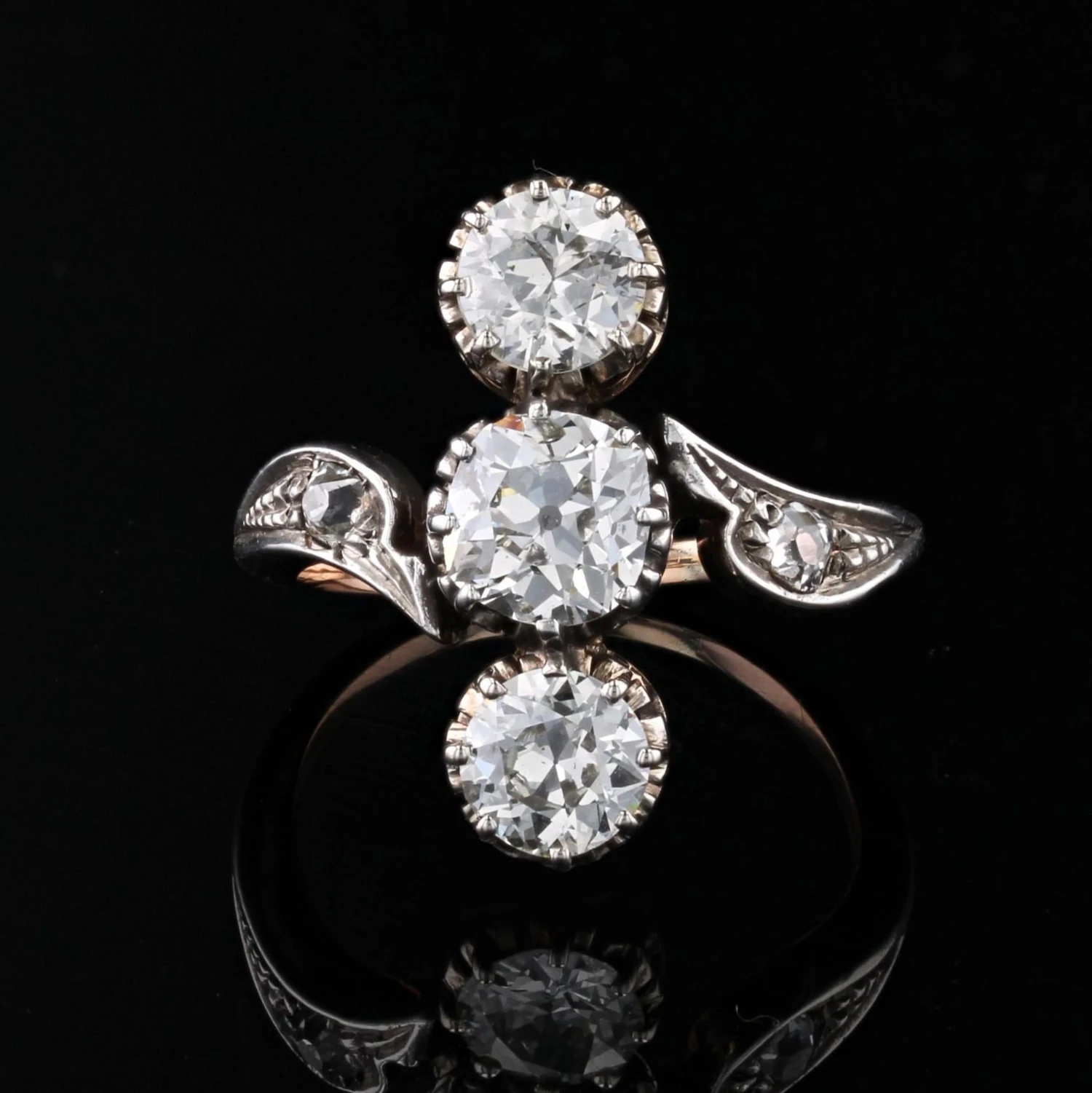 A sumptuous antique ring from the late 19th century, set with 3 old-cut diamonds, the center one being the largest.