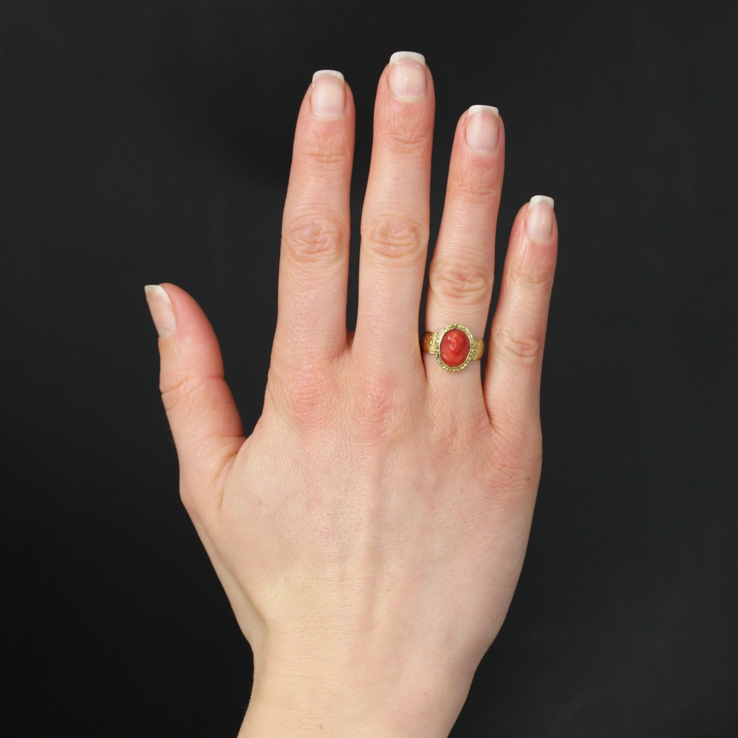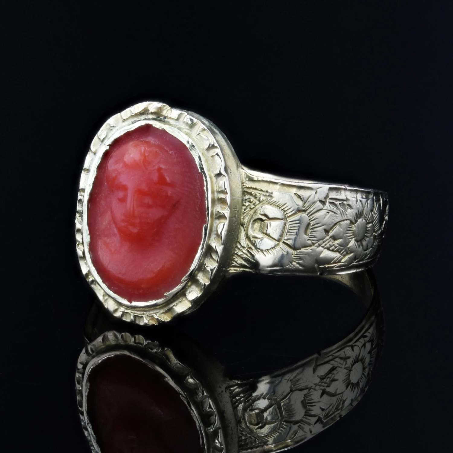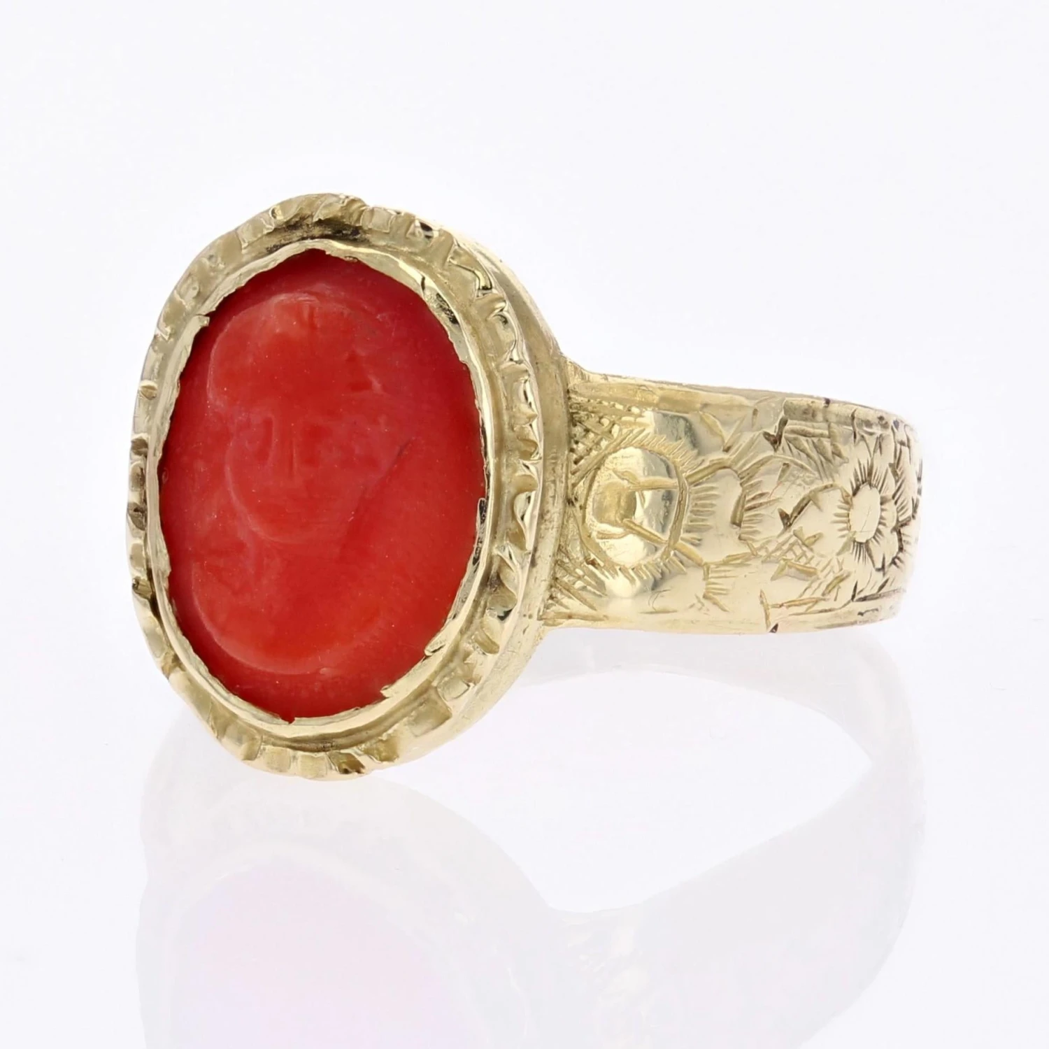 A charming antique ring in yellow gold, its band is engraved with floral motifs on either side of the opening and the head is adorned with a cameo on coral representing a child’s face.