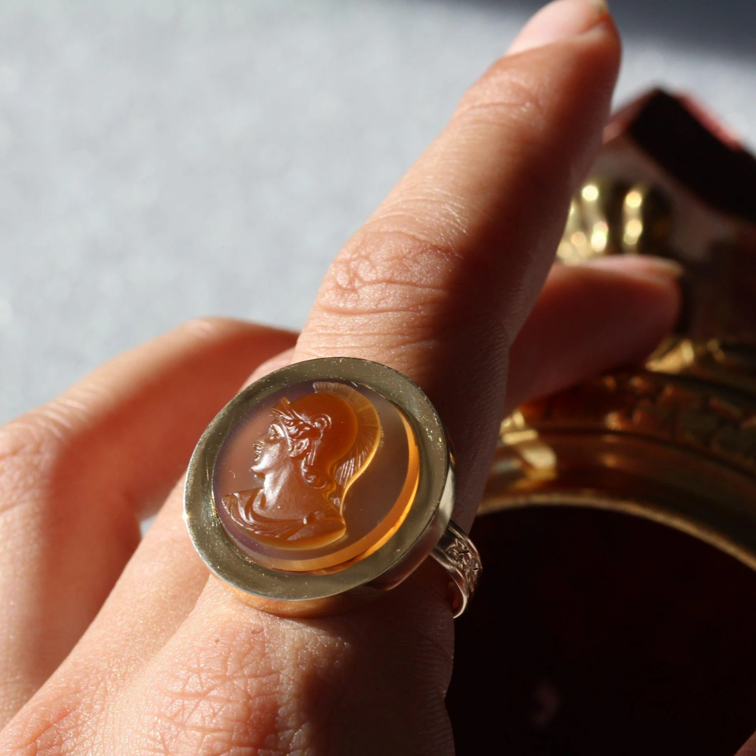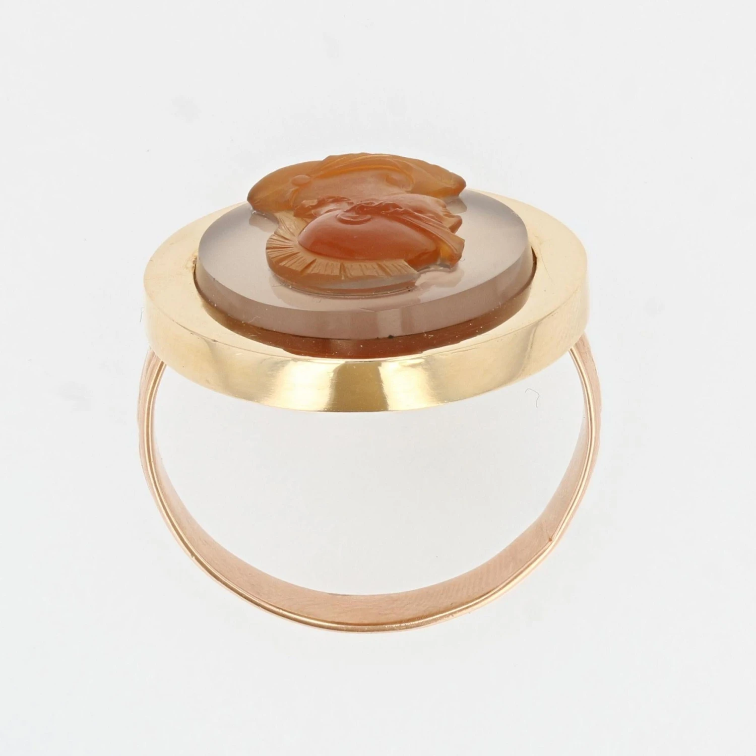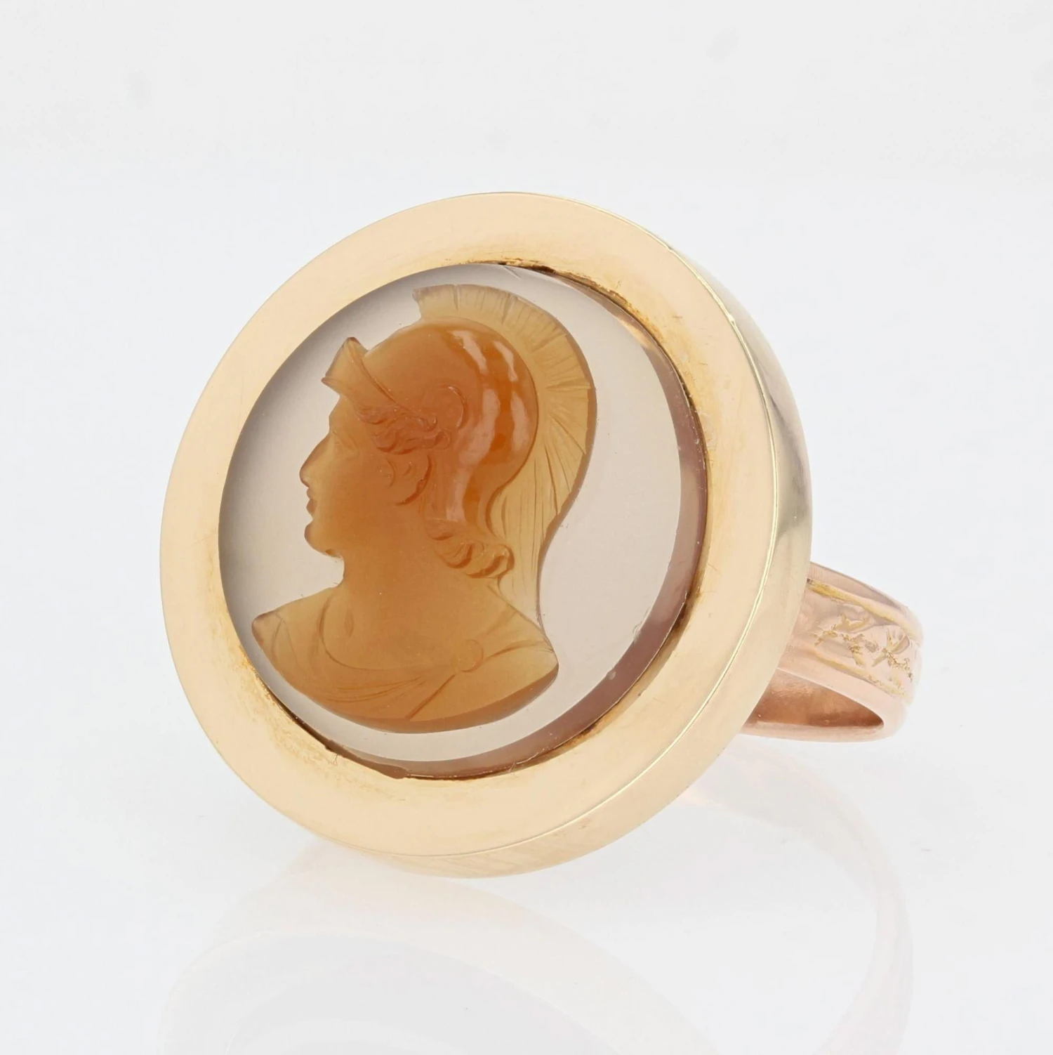 Important antique ring, of round shape, it is decorated with a cameo on agate representing the profile of a warrior helmeted in broad closed setting.