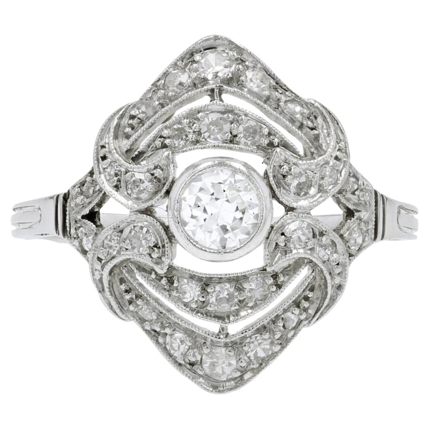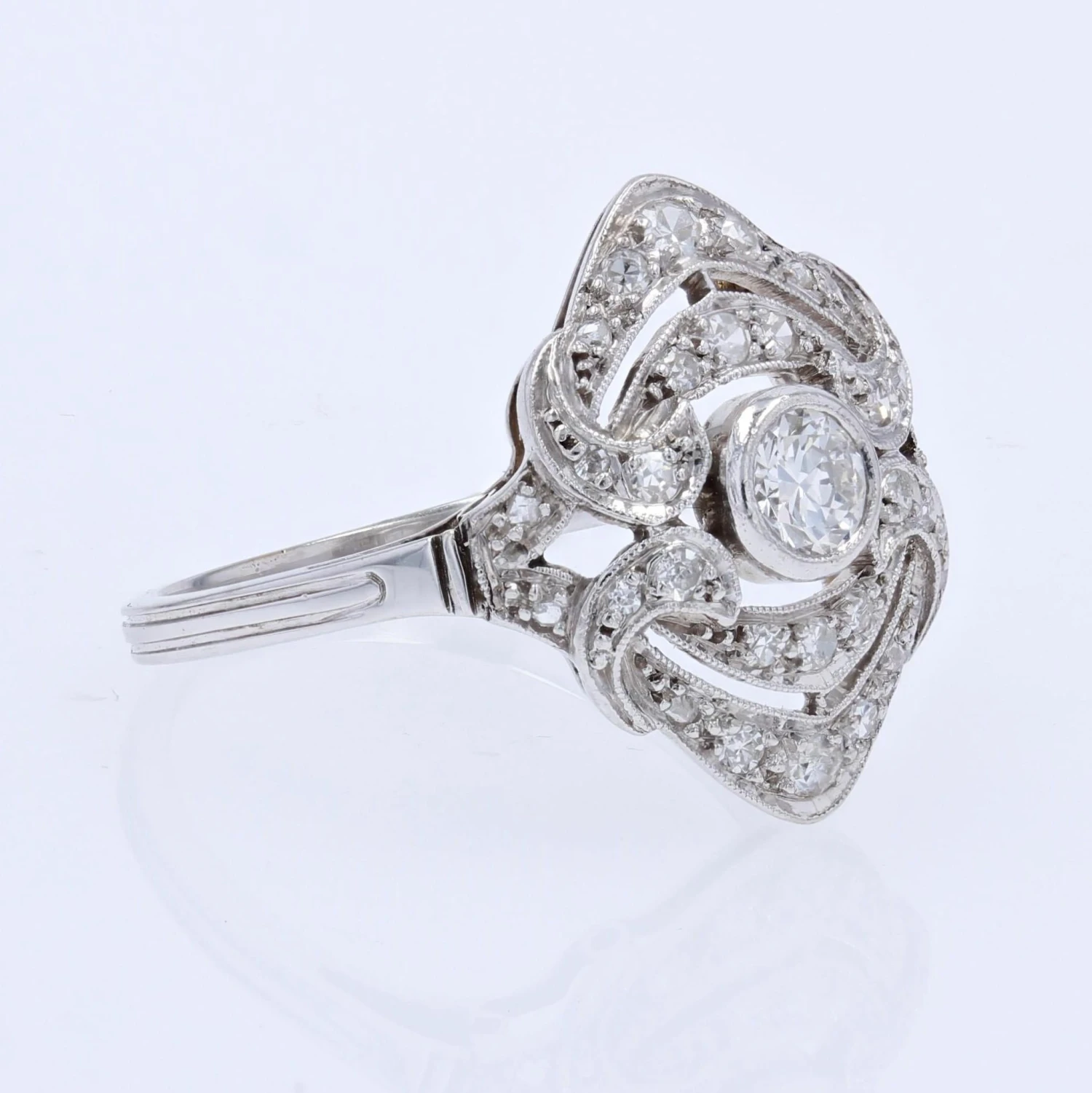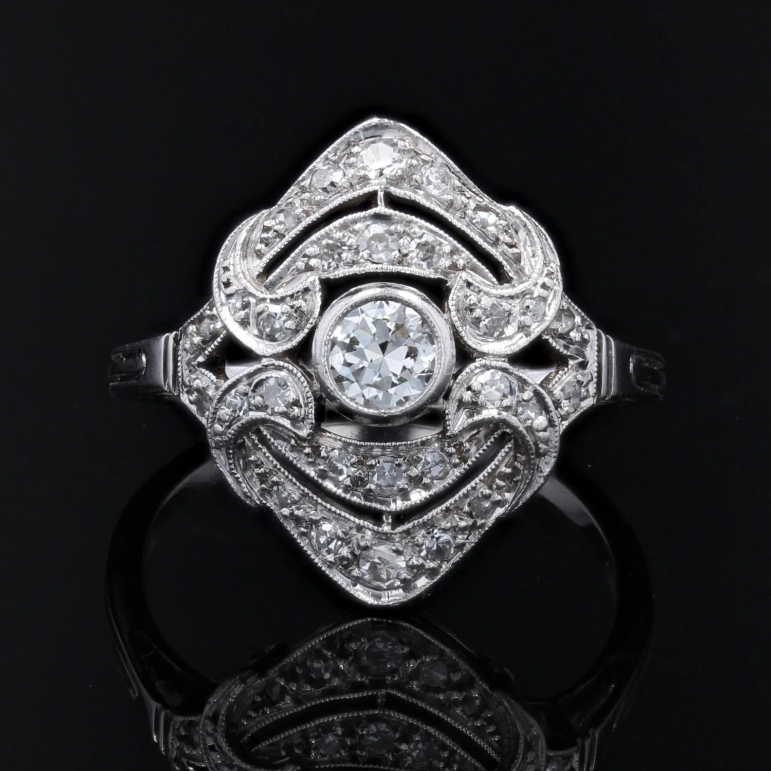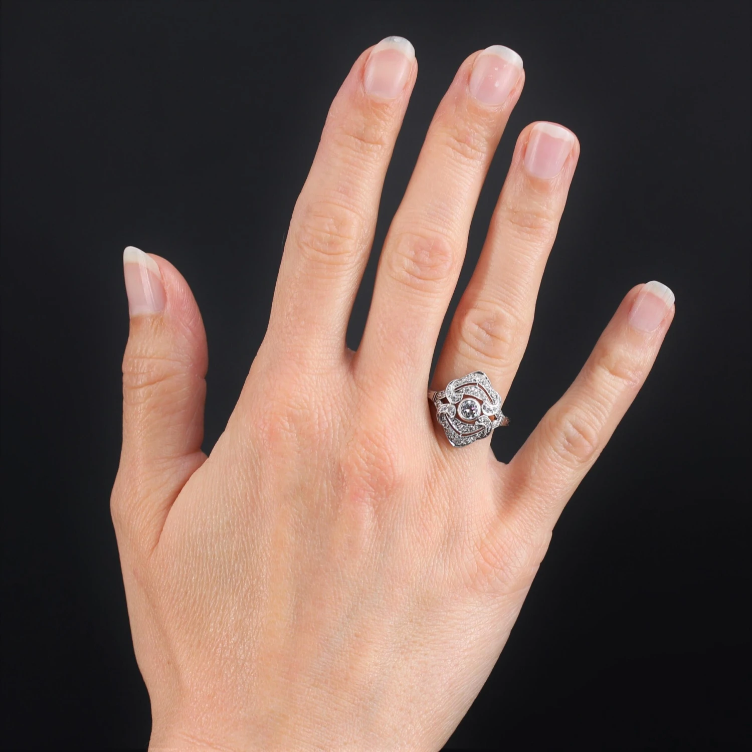 Presenting a diamond-shaped setting that follows the curve of the finger, this lovely antique ring is adorned in the center with a brilliant-cut diamond in closed setting within an openwork decoration and adorned with 8/8-cut diamonds.