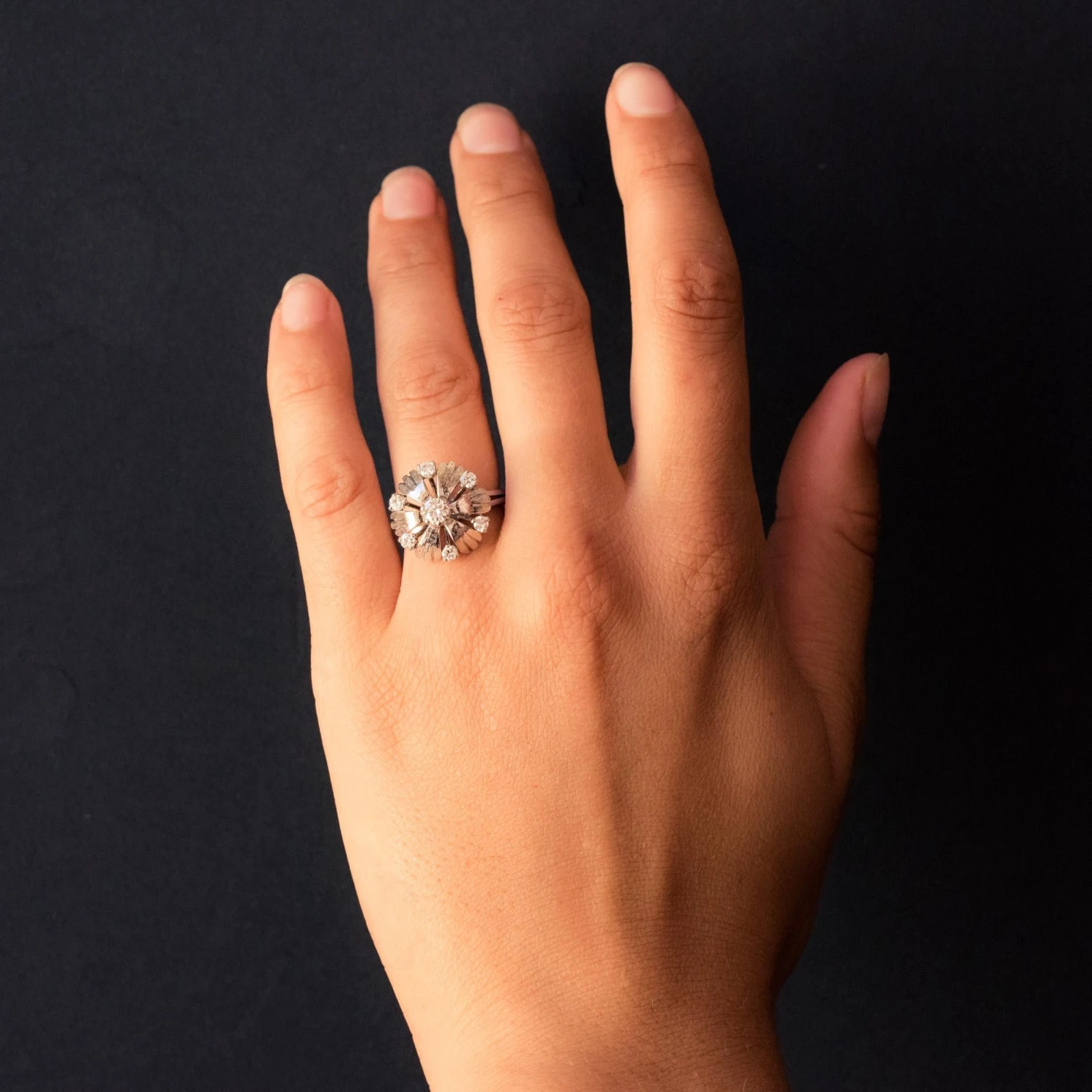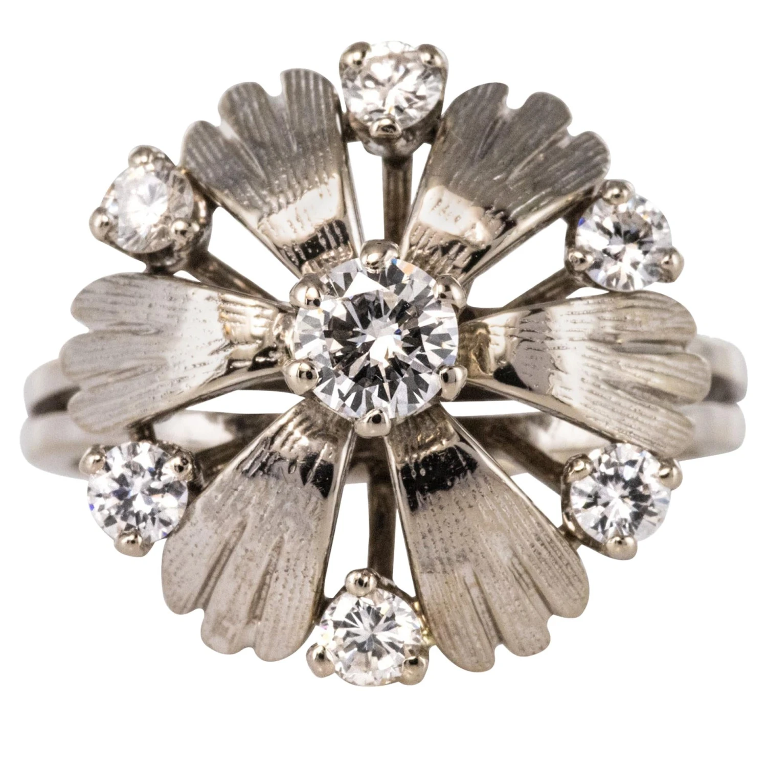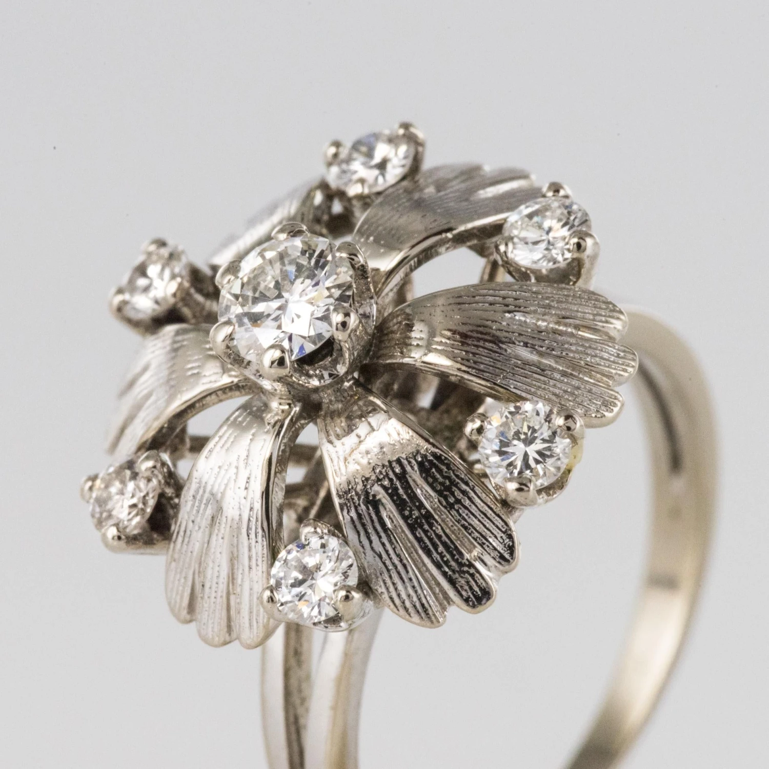 Lovely retro ring, it represents a flower whose heart is set with a modern brilliant-cut diamond with claws, and the petals made of an alternation of chiseled white gold leaves and modern brilliant-cut diamonds set with claws.