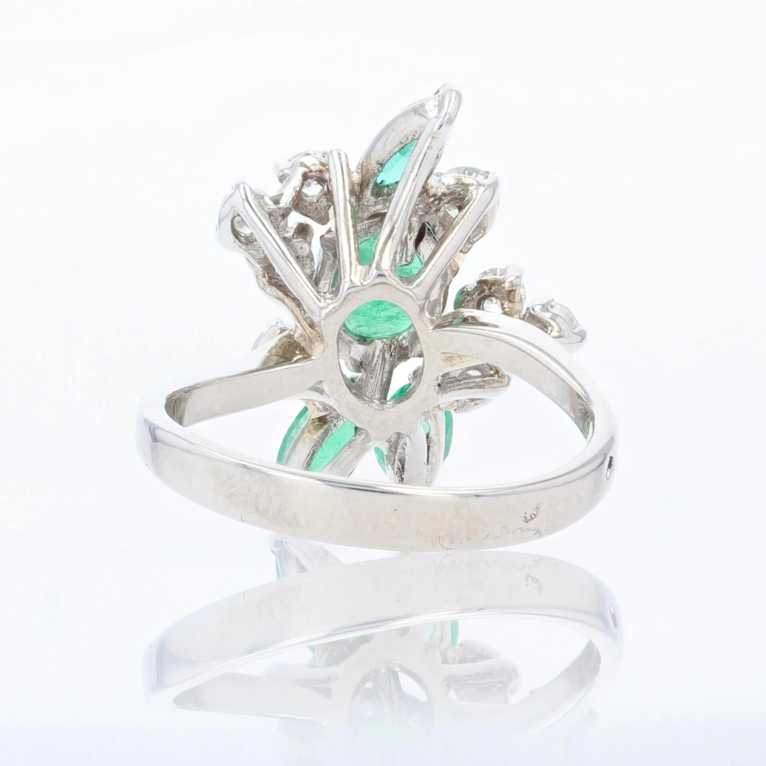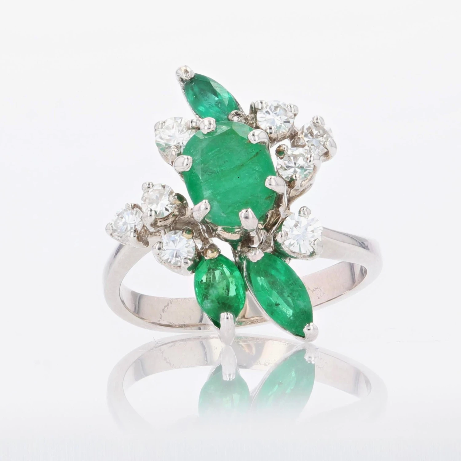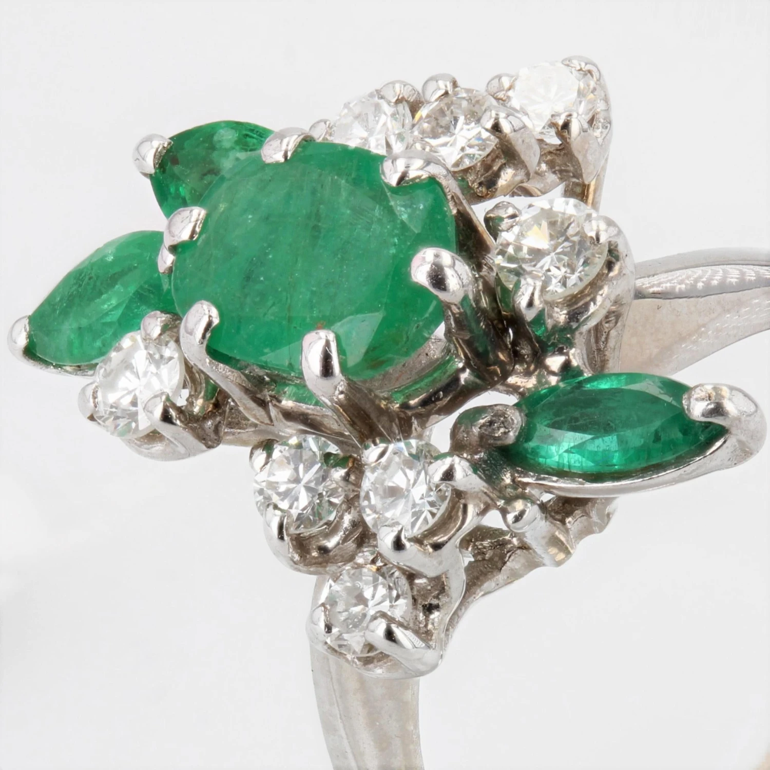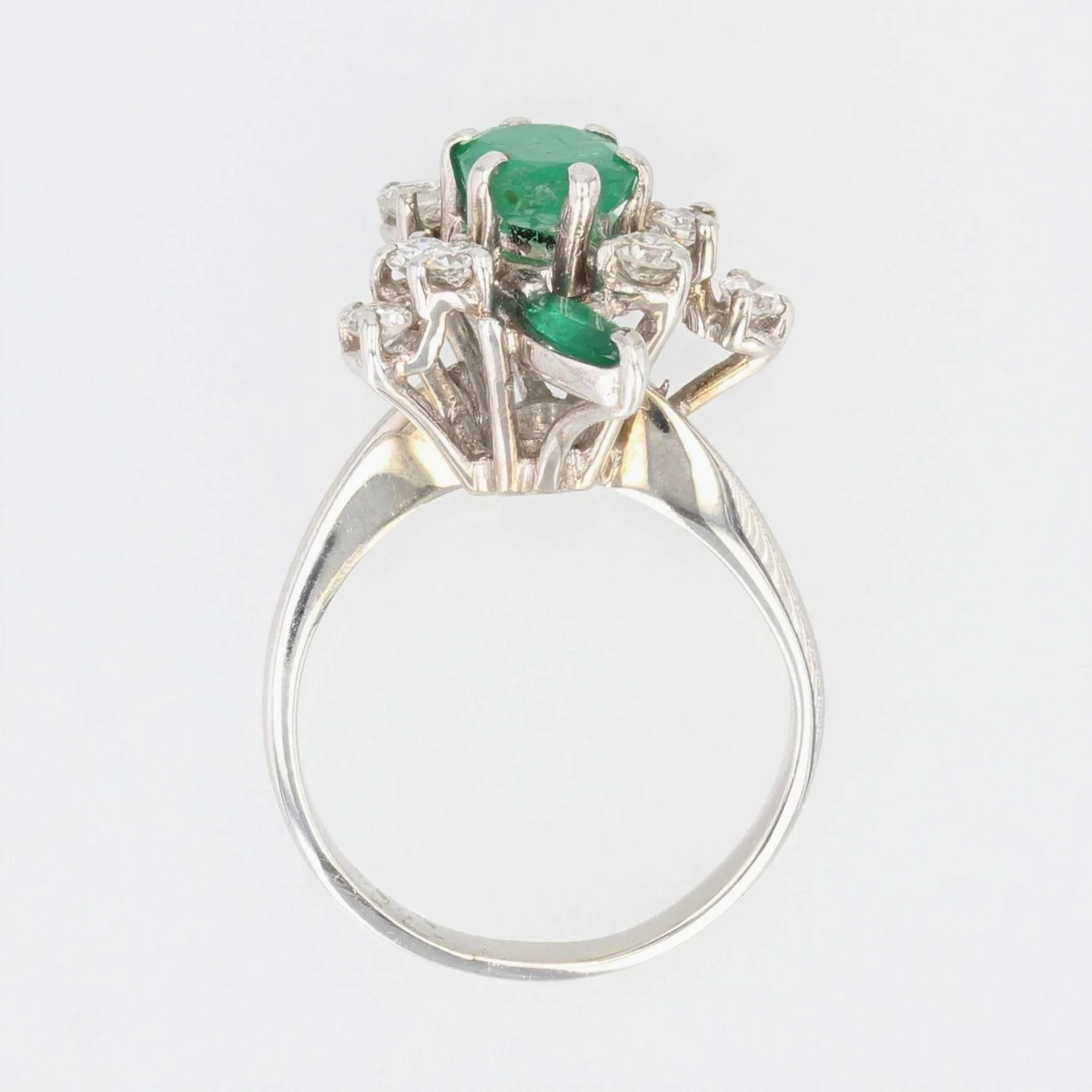 It comes straight from the 1970s, this splendid vintage ring is set with claws of an emerald oval surrounded by 8 modern brilliant cut diamonds and 3 emeralds shuttle.