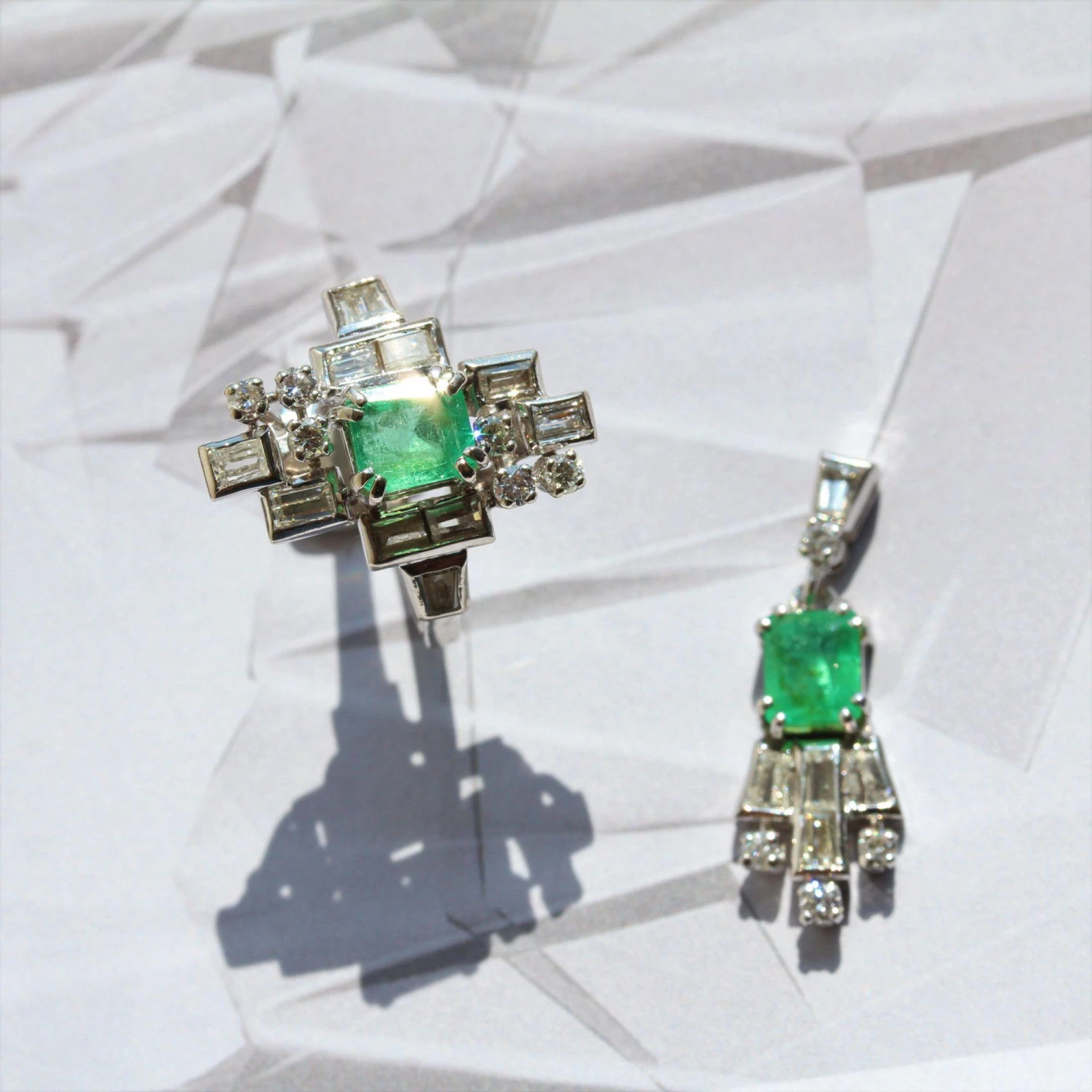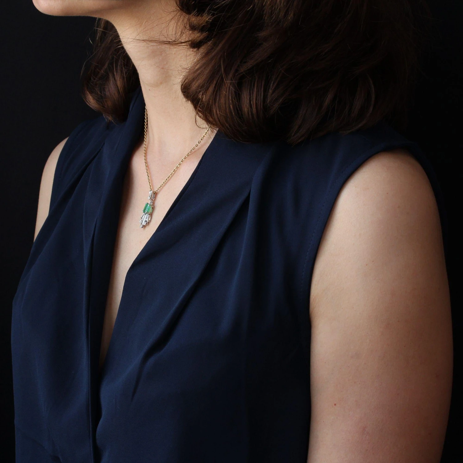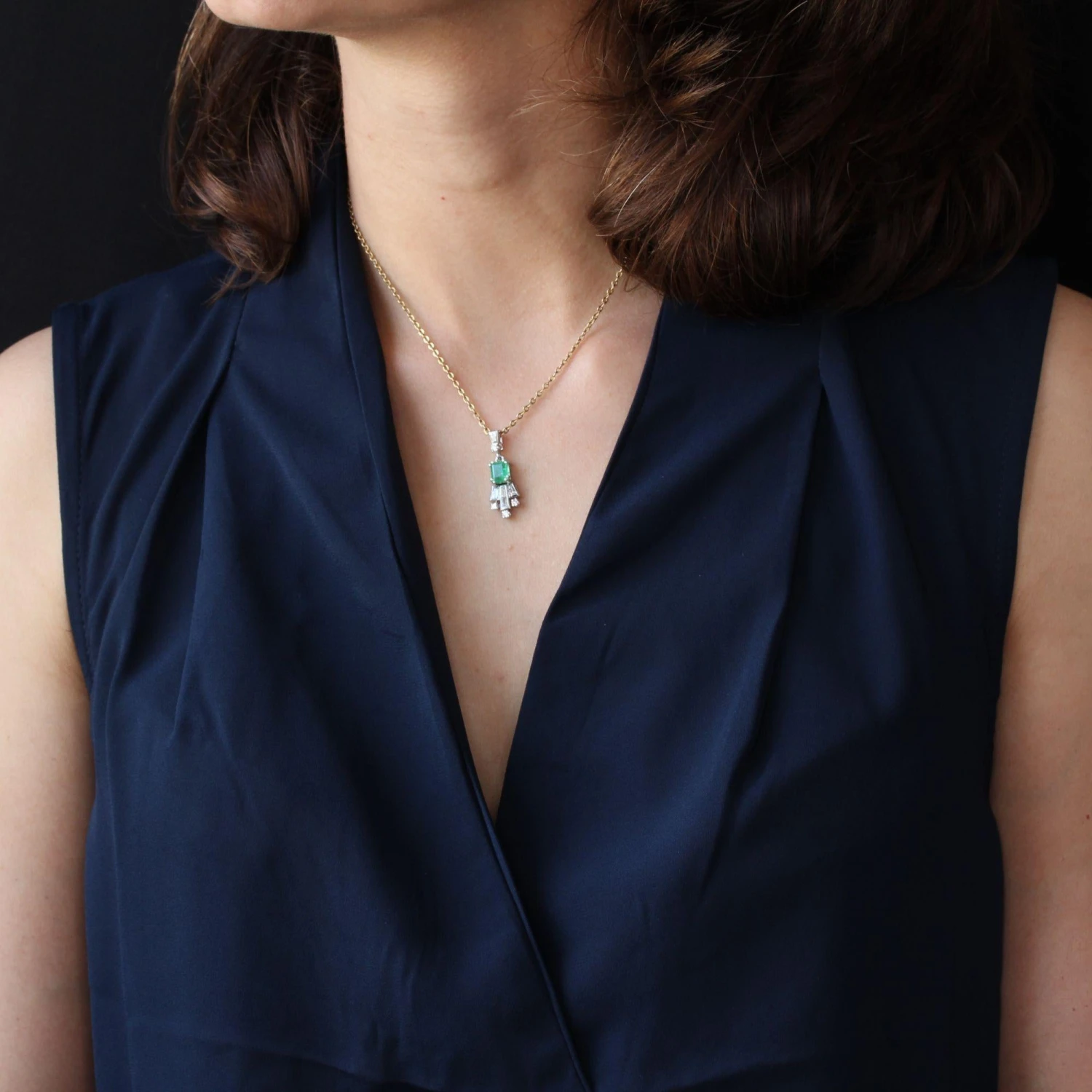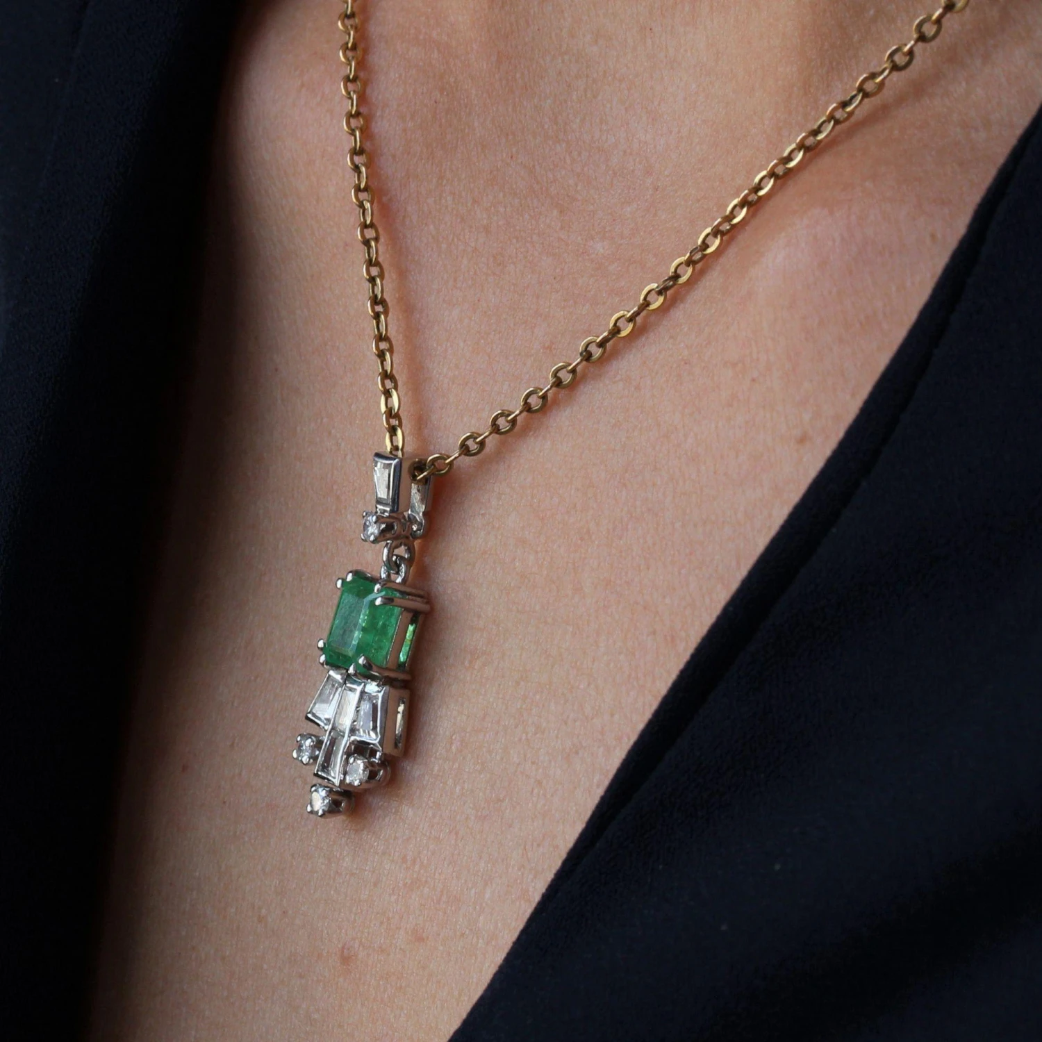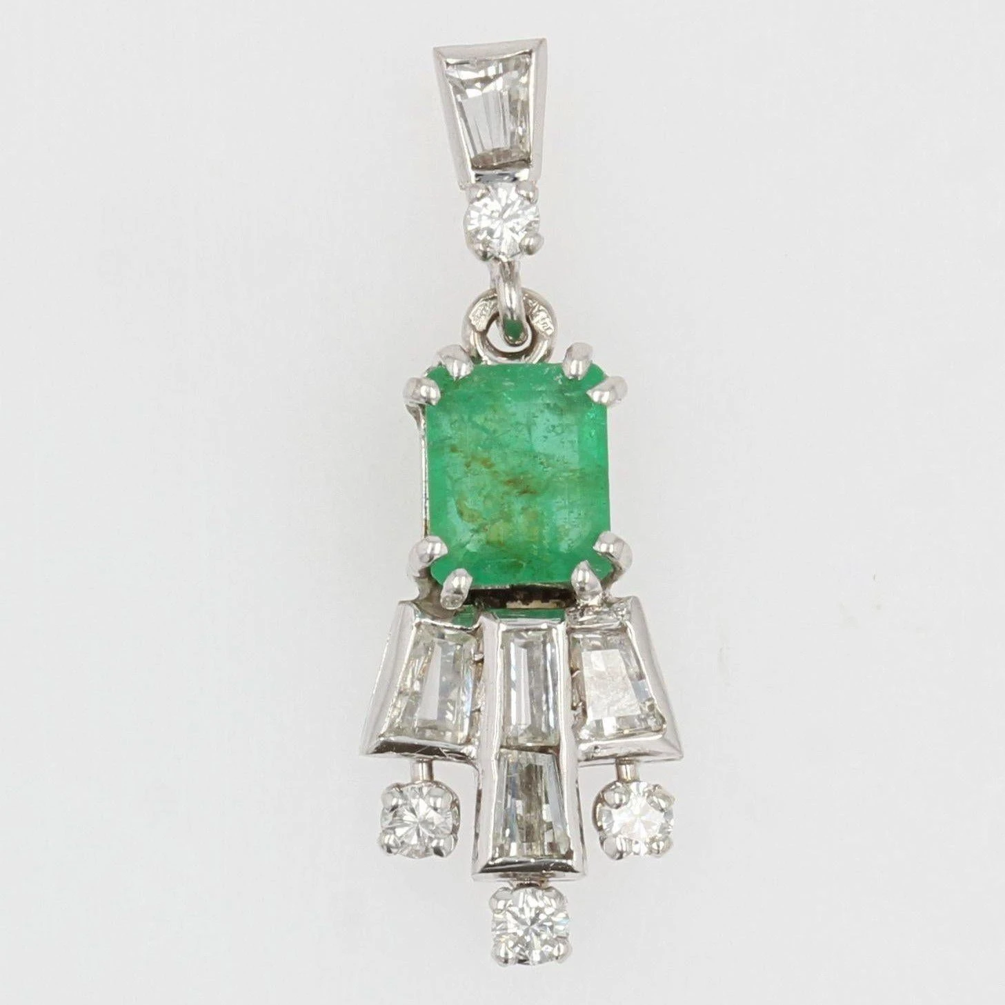 Of geometrical forms, this retro pendant is made up of a trapezoid diamond with, at the base, a brilliant- cut diamond which holds in pampille the pendant formed of an emerald degrees- cut, supporting a pattern made of baguette, trapezium and brilliant- cut diamonds.