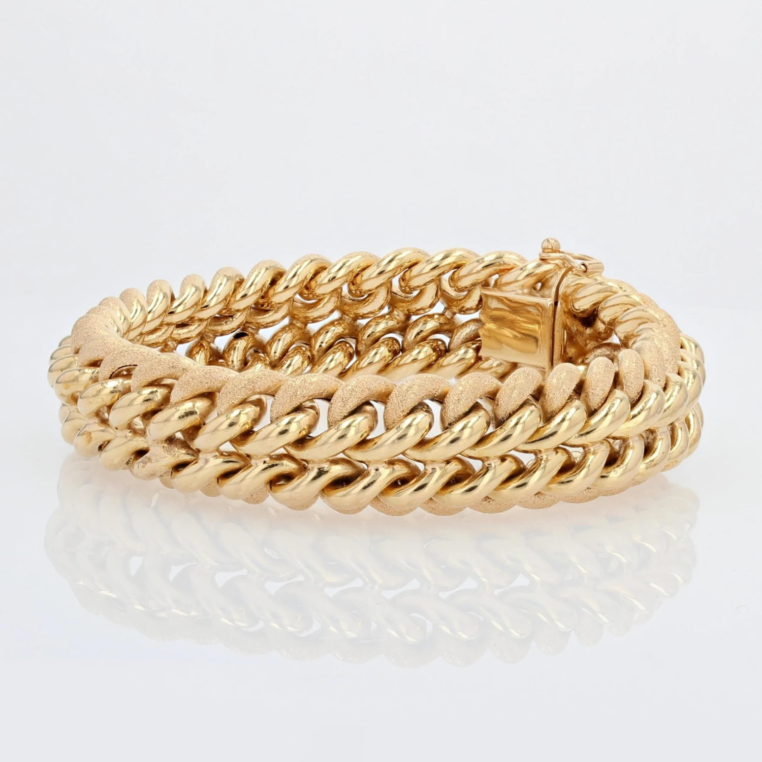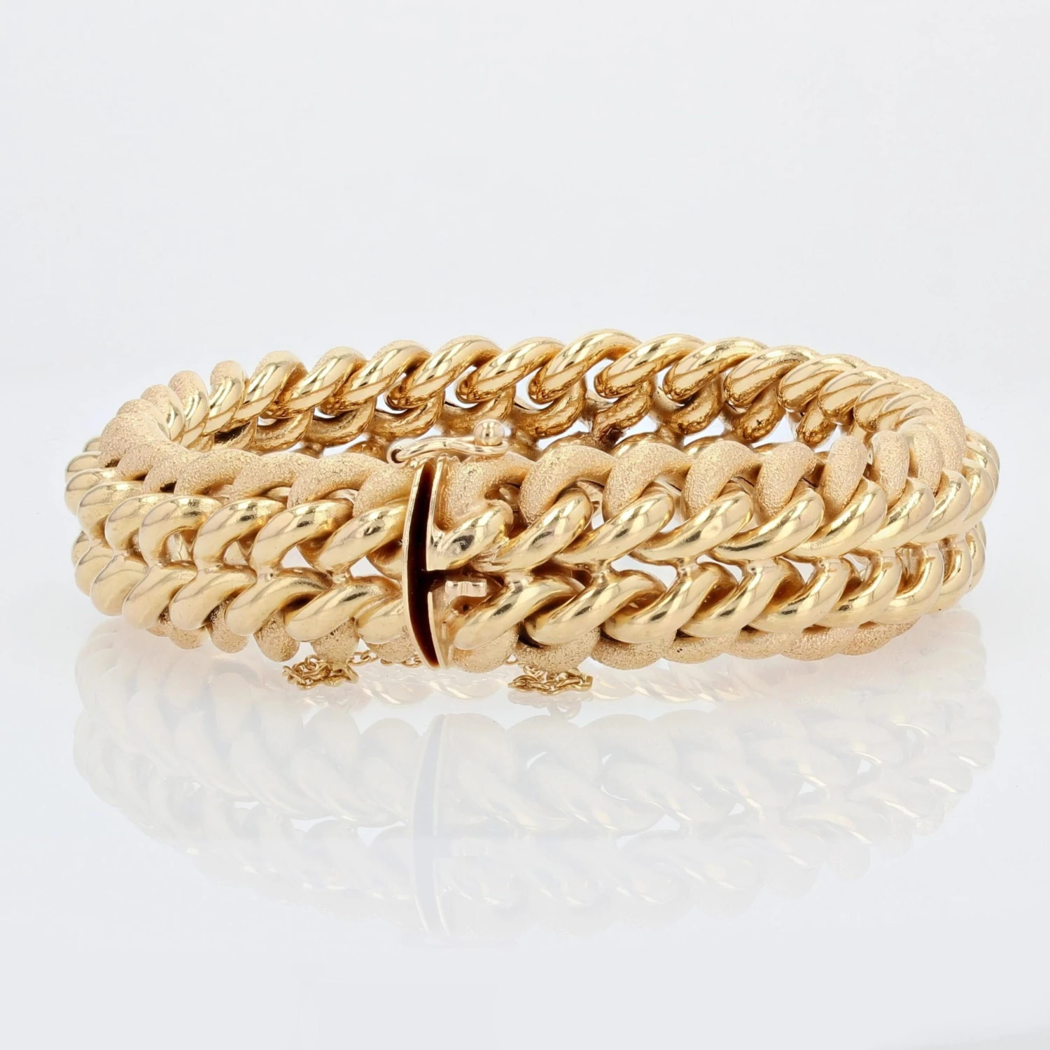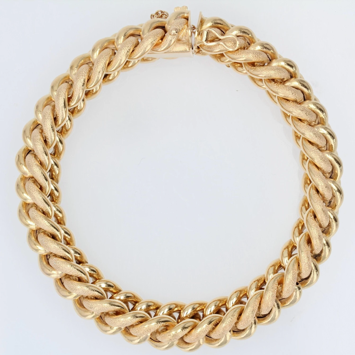 Our opinion : The bracelets of curb type were declined in numerous variants through the centuries this one presents a textured gold mesh which confers him a lot of charm and elegance.