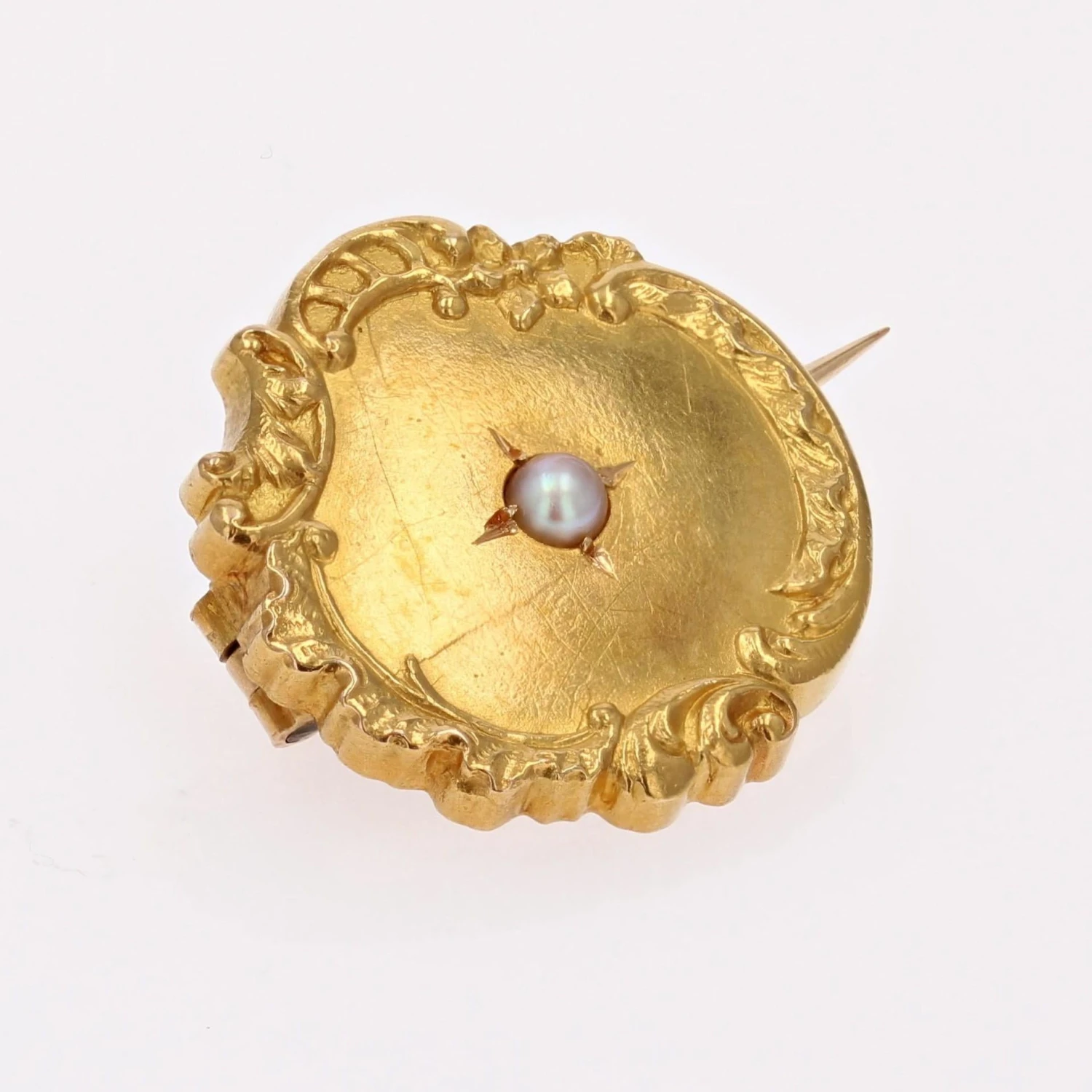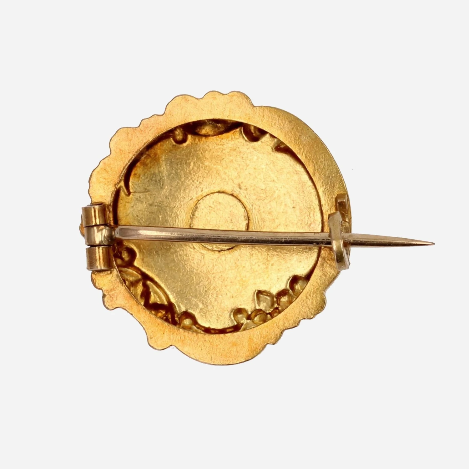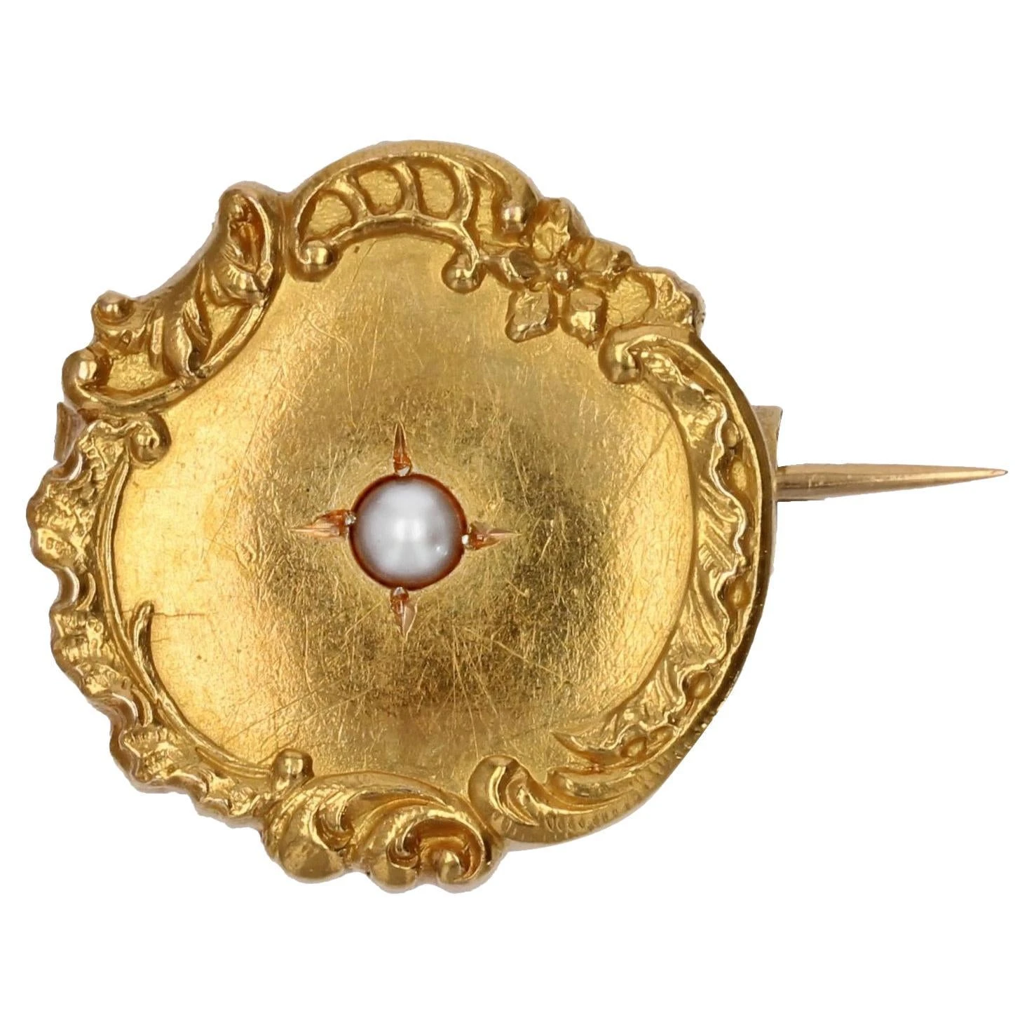 This round collar brooch in yellow gold is bordered by a floral and arabesque design and features a fine half-pearl in the center.