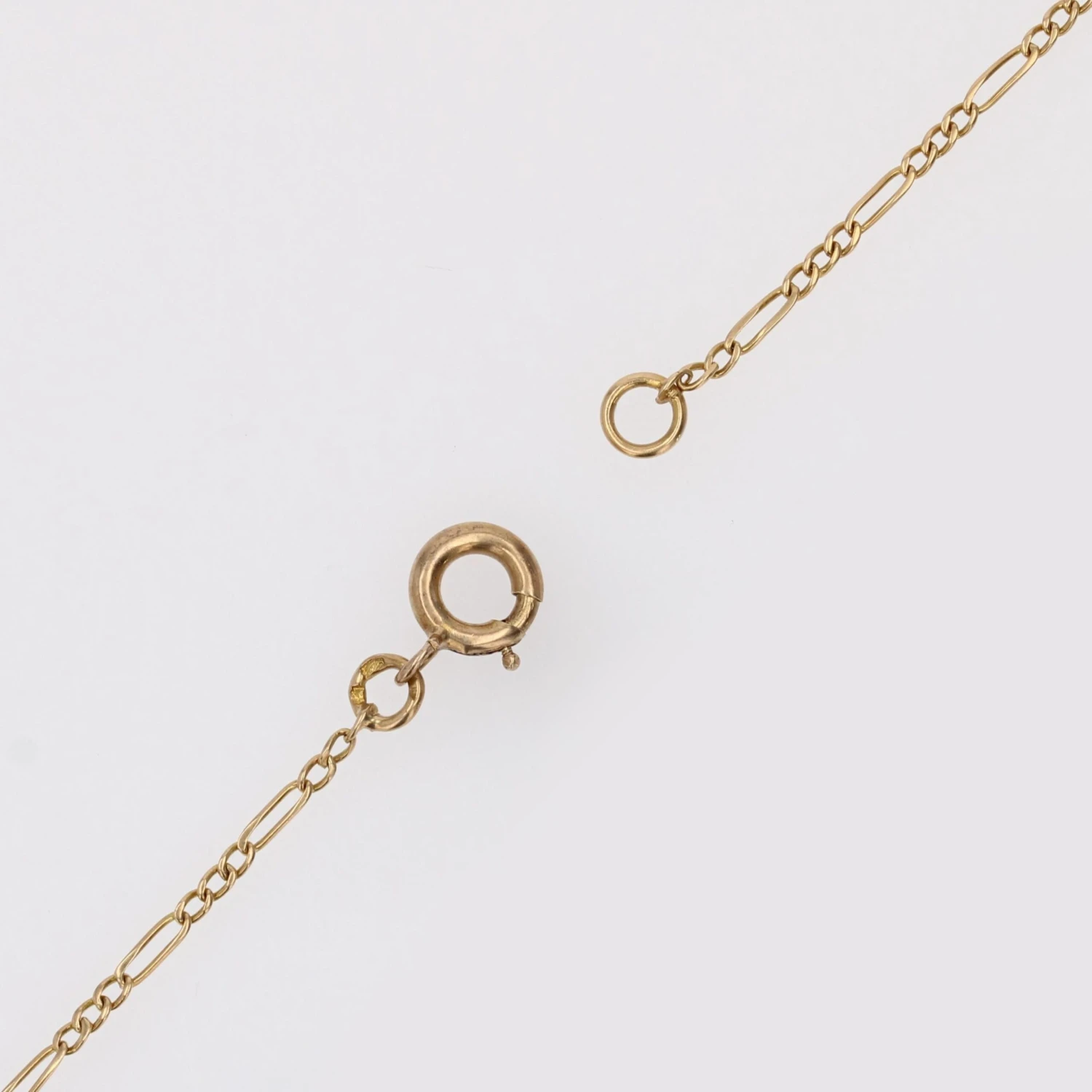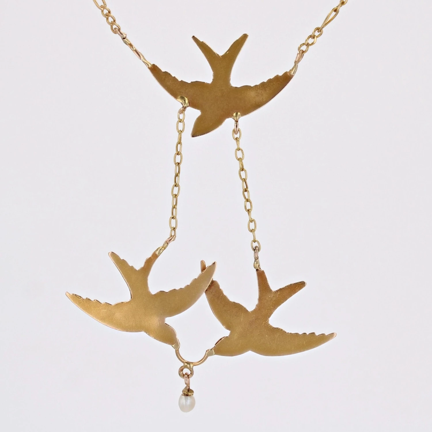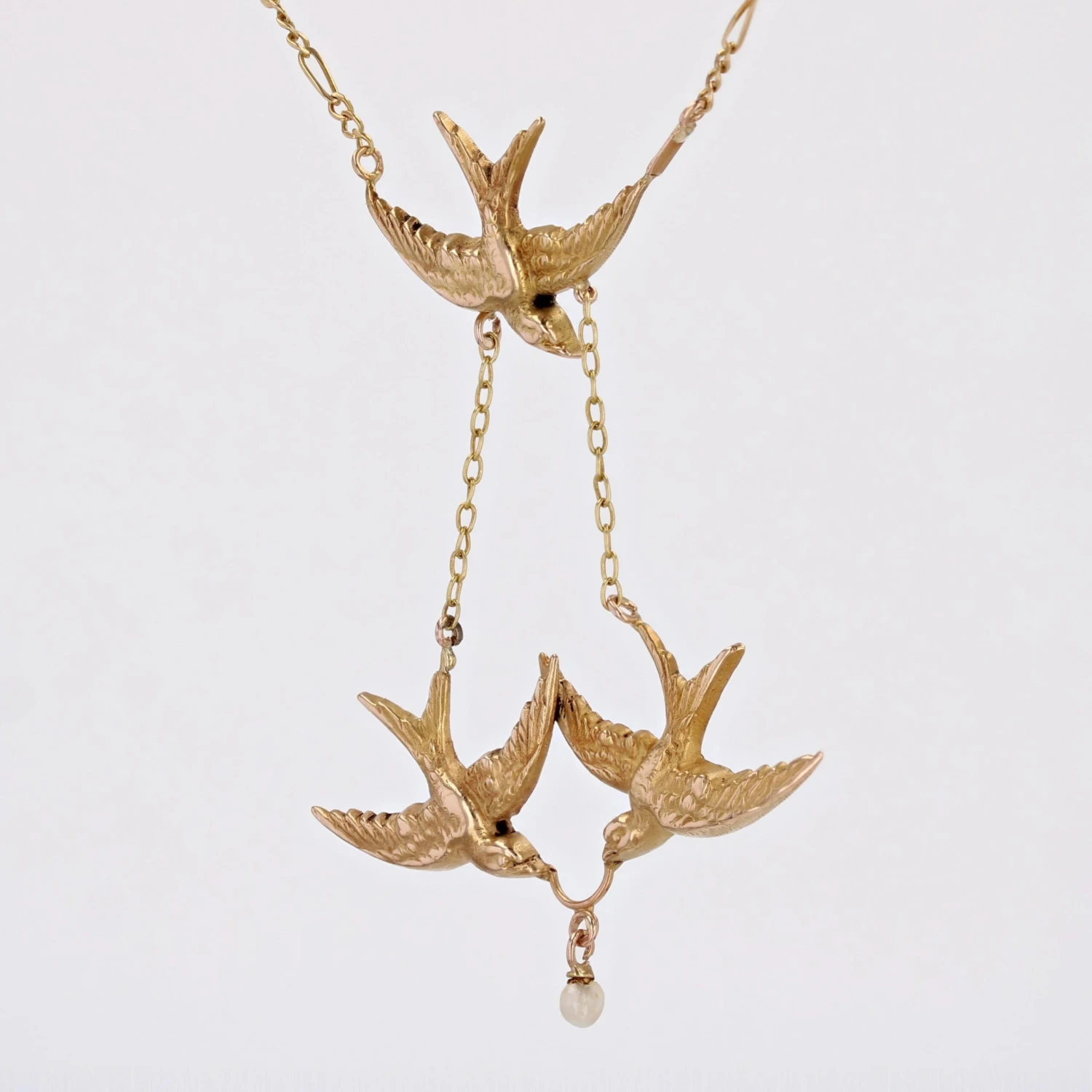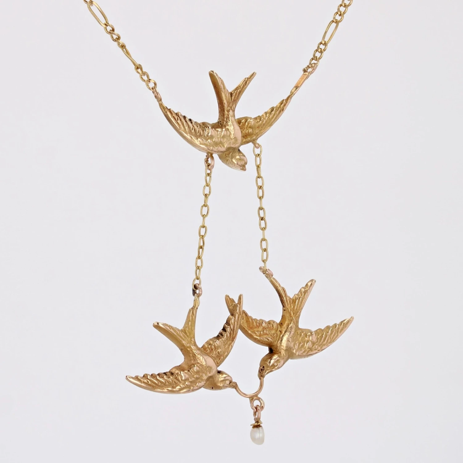 This delicate antique necklace is made of fine alternating gourmette mesh holding a motif of 3 swallows on the front, 2 of which are tassels holding a small baroque pearl in their beak.