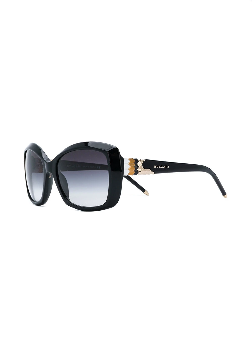 Add some edge to your look with these square-frame sunglasses by Bulgari, in black with metal embellishments.