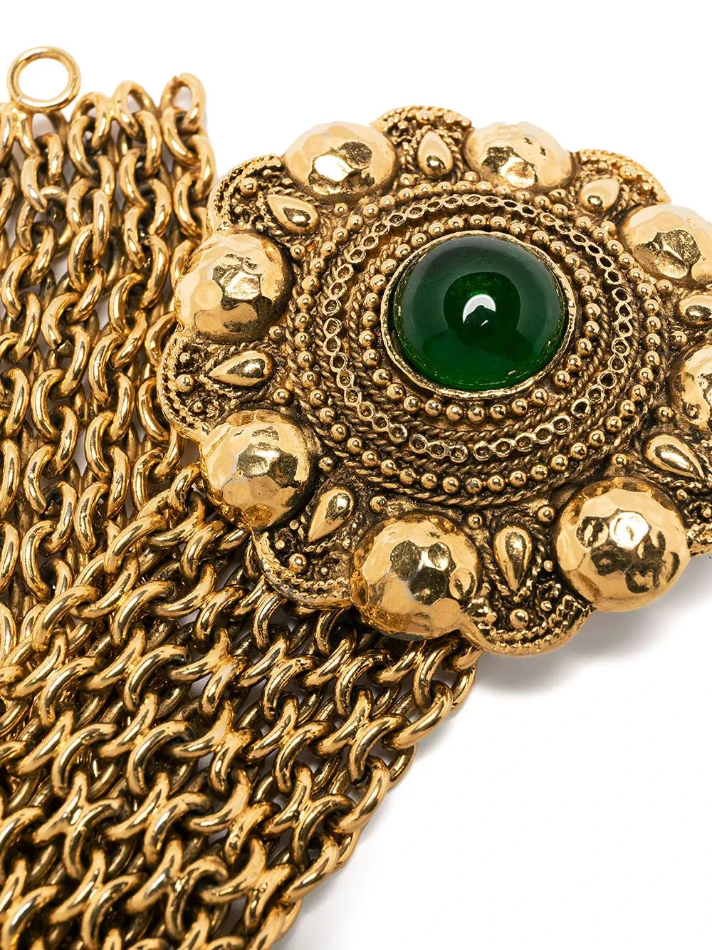 Designed in the 1980s, this eye-catching chunky gold bracelet features a large green gemstone, surrounded by gold petals with an engraved chain detailing.