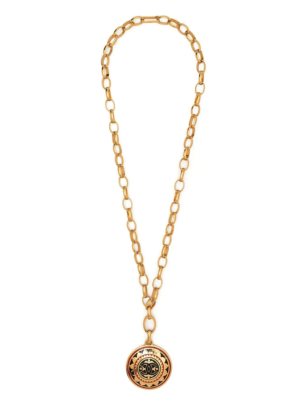 This statement pre-owned Chanel necklace features a gold-toned chain strap with a CC metal medallion, enamelled in black and red.