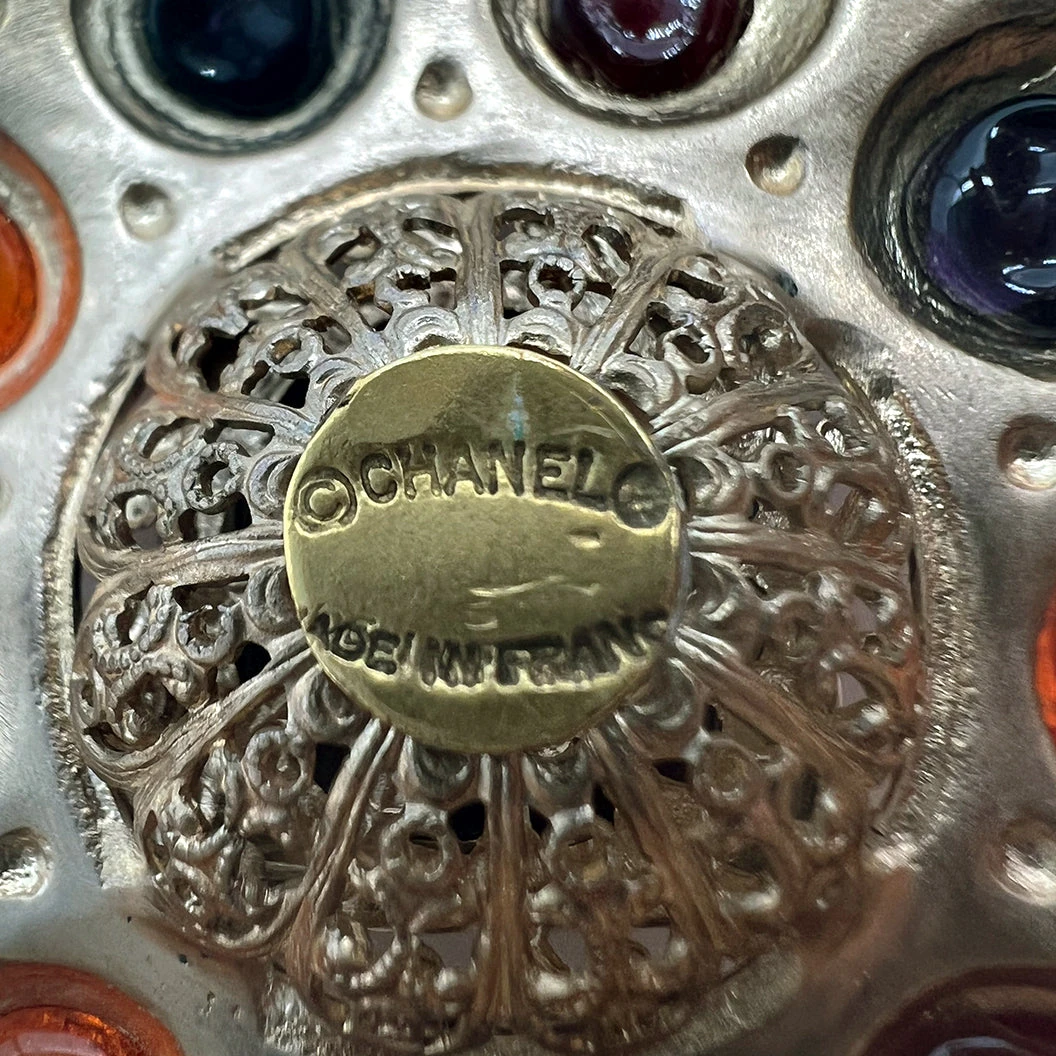 Perfect for a special celebration, this beautiful Chanel pre-owned necklace by Gripoix from the 1980’s showcases an alluring openwork design with a blue centered gripoix stone surrounded by multi-colour faux gemstones in a circular pattern.