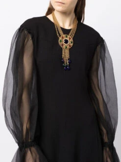 Featuring weighty baroque teardrop dangles for a seductive touch and multi-gilded gold chains, this piece is enhanced by many special rouches showcasing the brand’s attention to details.