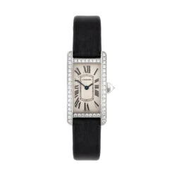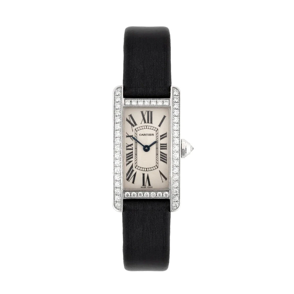 The case is in a white gold set with brilliant cut diamonds and a faceted crown also set with a brilliant cut diamond.