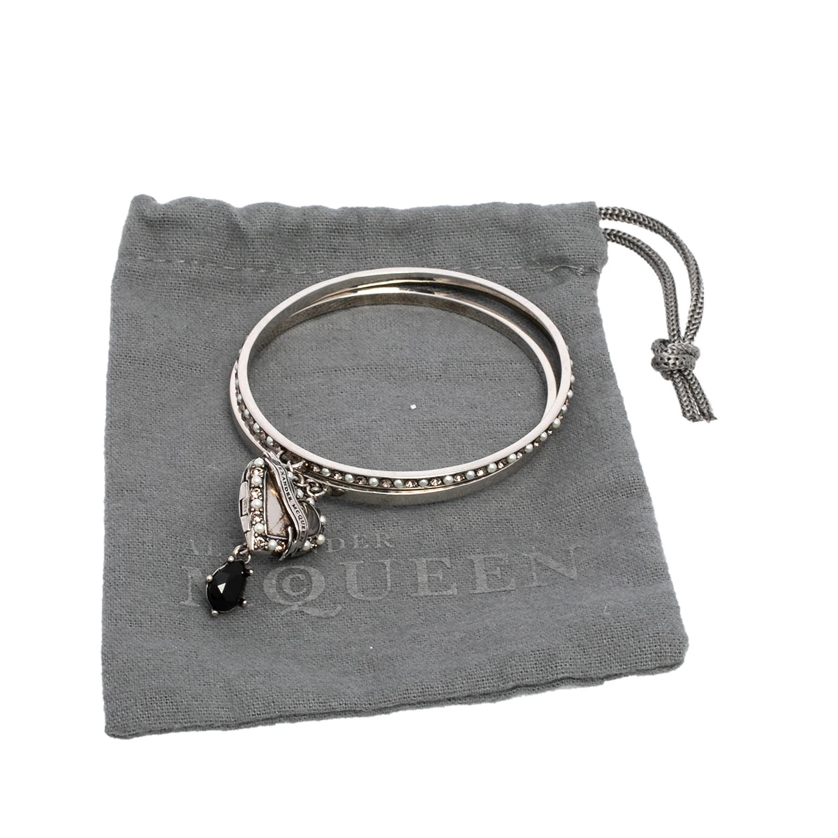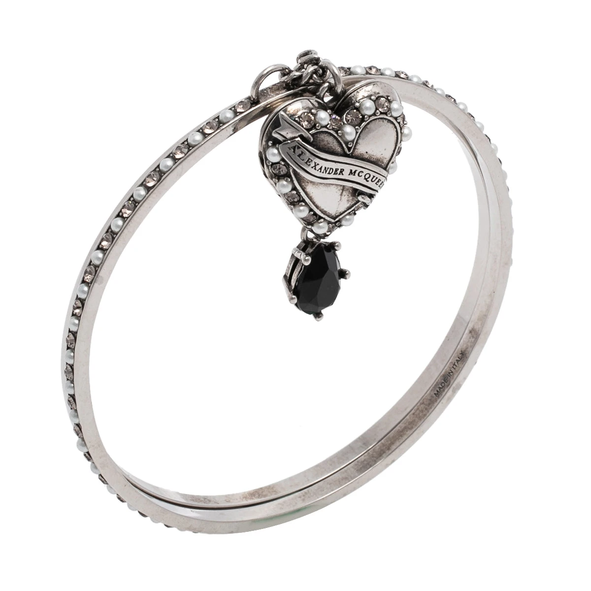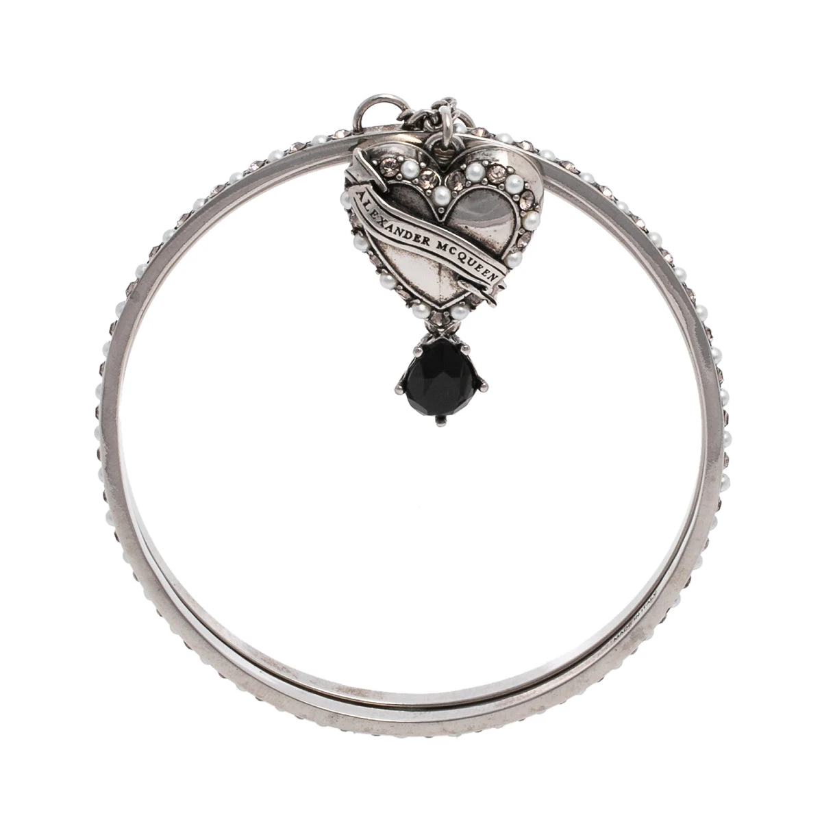 This bangle bracelet from Alexander McQueen is here to enchant you and make you fall in love with it. The fabulous combination of antique silver tone metal with crystals and faux pearls make this piece worth collecting. Grab it today and add sparks of luxury to your wardrobe