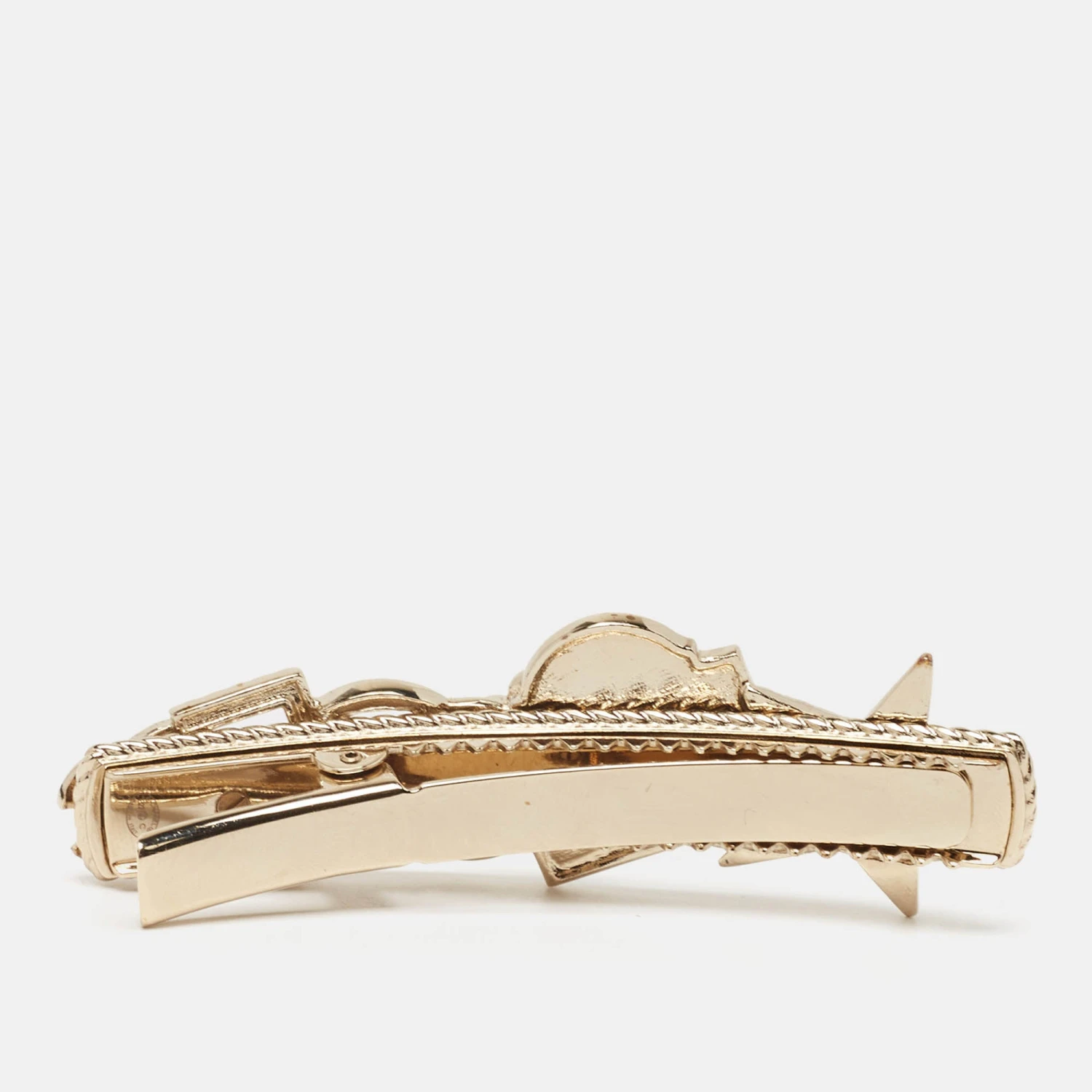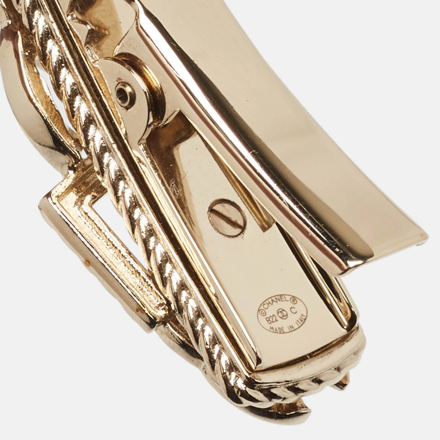 The Chanel hairclip features shimmering crystals and luxurious enamel on a gold tone base. This exquisite accessory combines the timeless charm of Chanel with modern flair, perfect for adding a touch of refined beauty to any hairstyle. Its intricate design embodies classic Parisian style.
