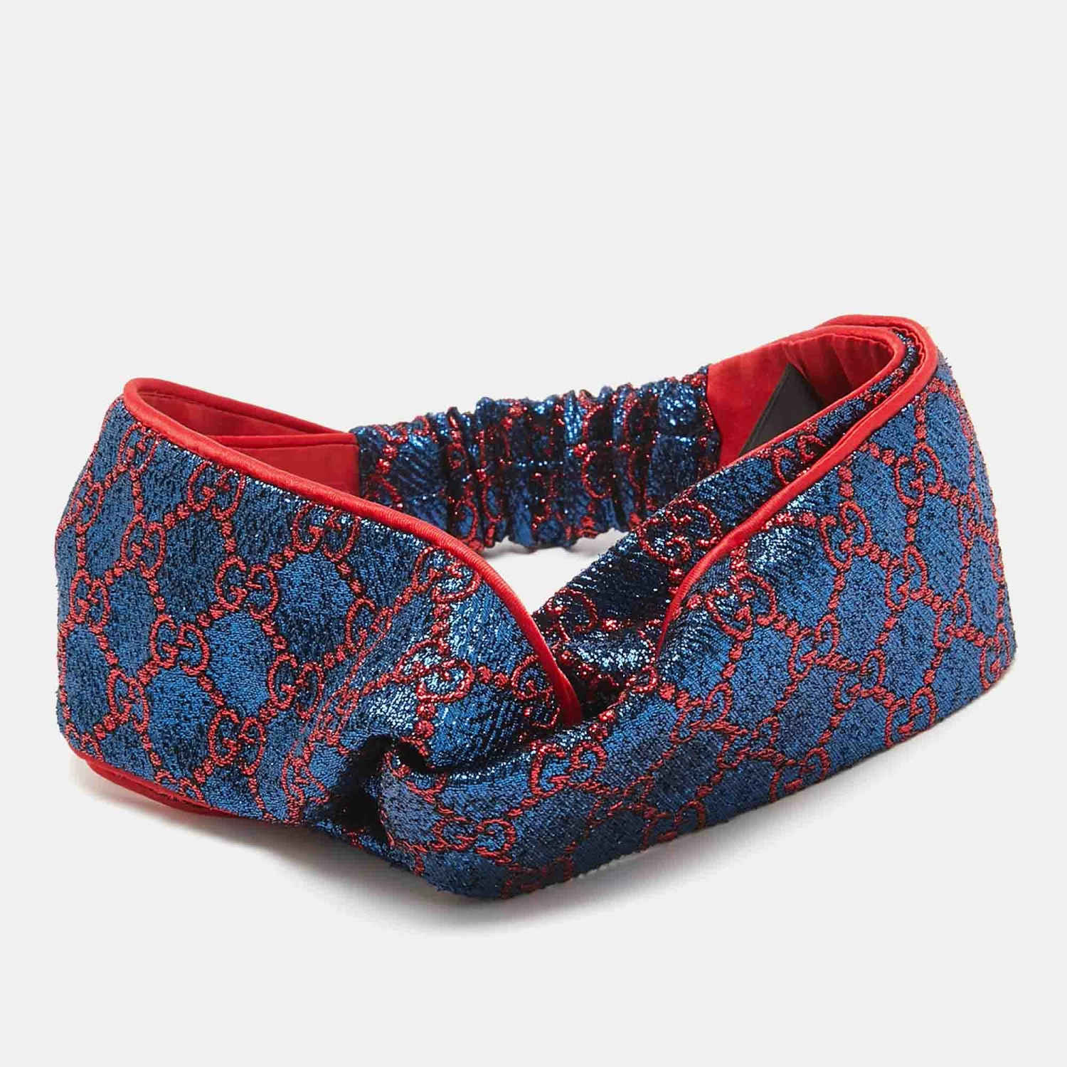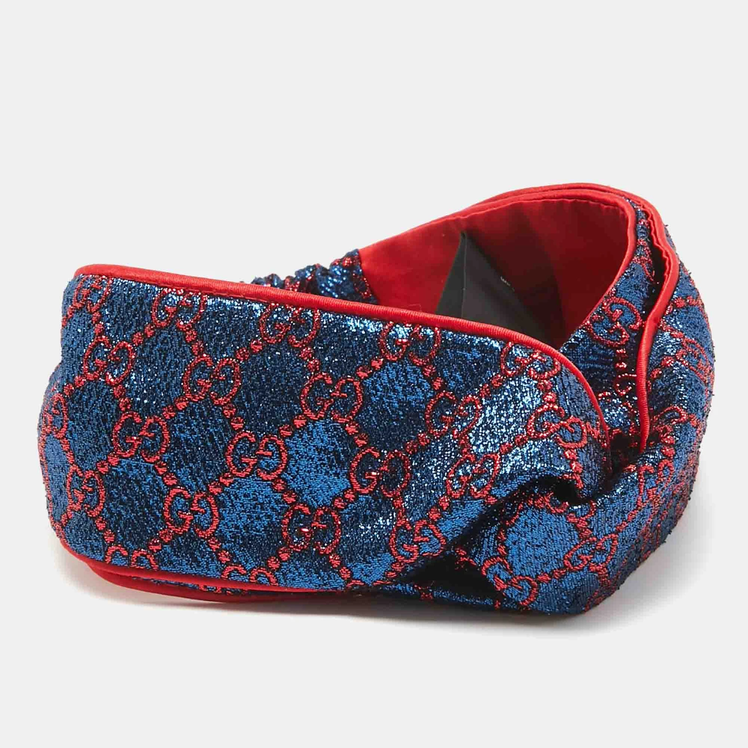 Experience luxury with the Gucci headband. Crafted from premium silk, this striking accessory features Guccis iconic GG pattern, accentuated by vibrant blue and red metallic threads. Perfect for adding a touch of glamor to any outfit, its a statement piece of impeccable quality.