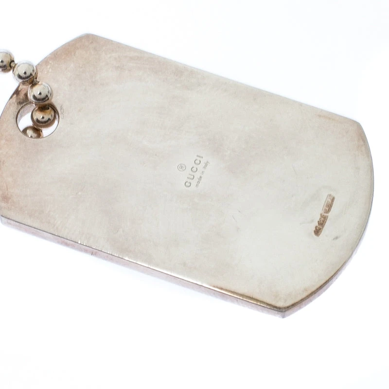 Get this Gucci charm and complete your silver tag collection. The tag shaped pendant has enamel detailing etched on it adding to the design and the creation is complete with a beaded chain.