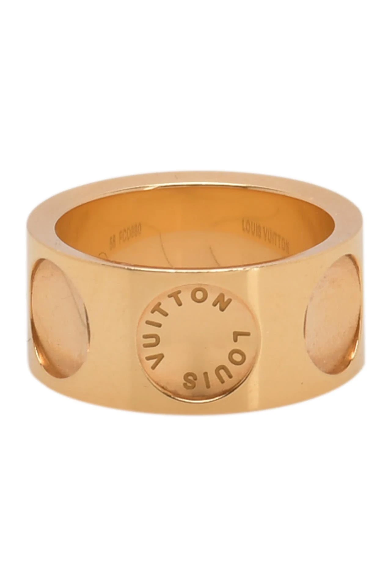 This minimalistic design and elegant ring is crafted of 18 karat yellow gold and features concave circles around the band, with the maison’s moniker engraved around one circle .