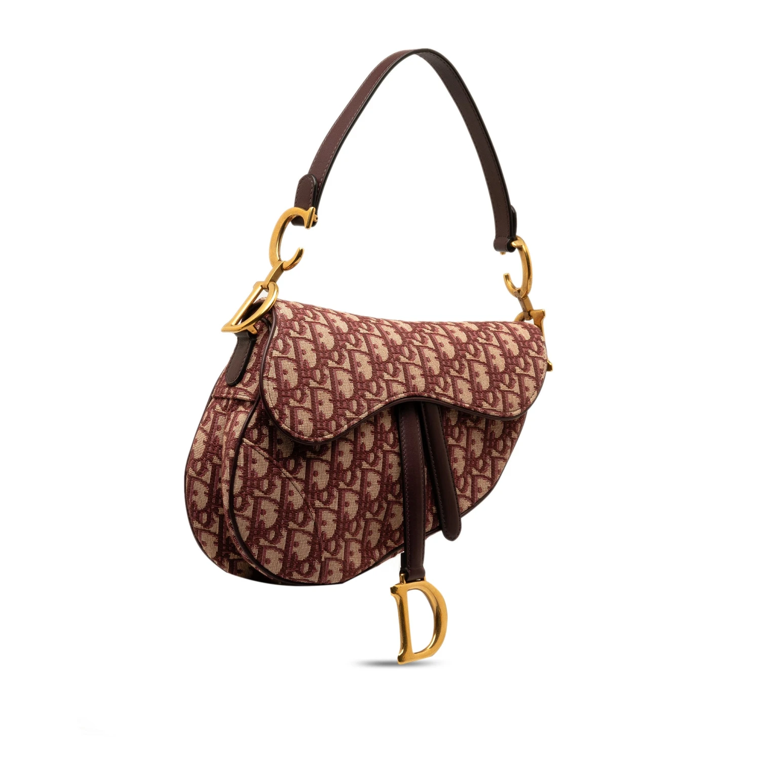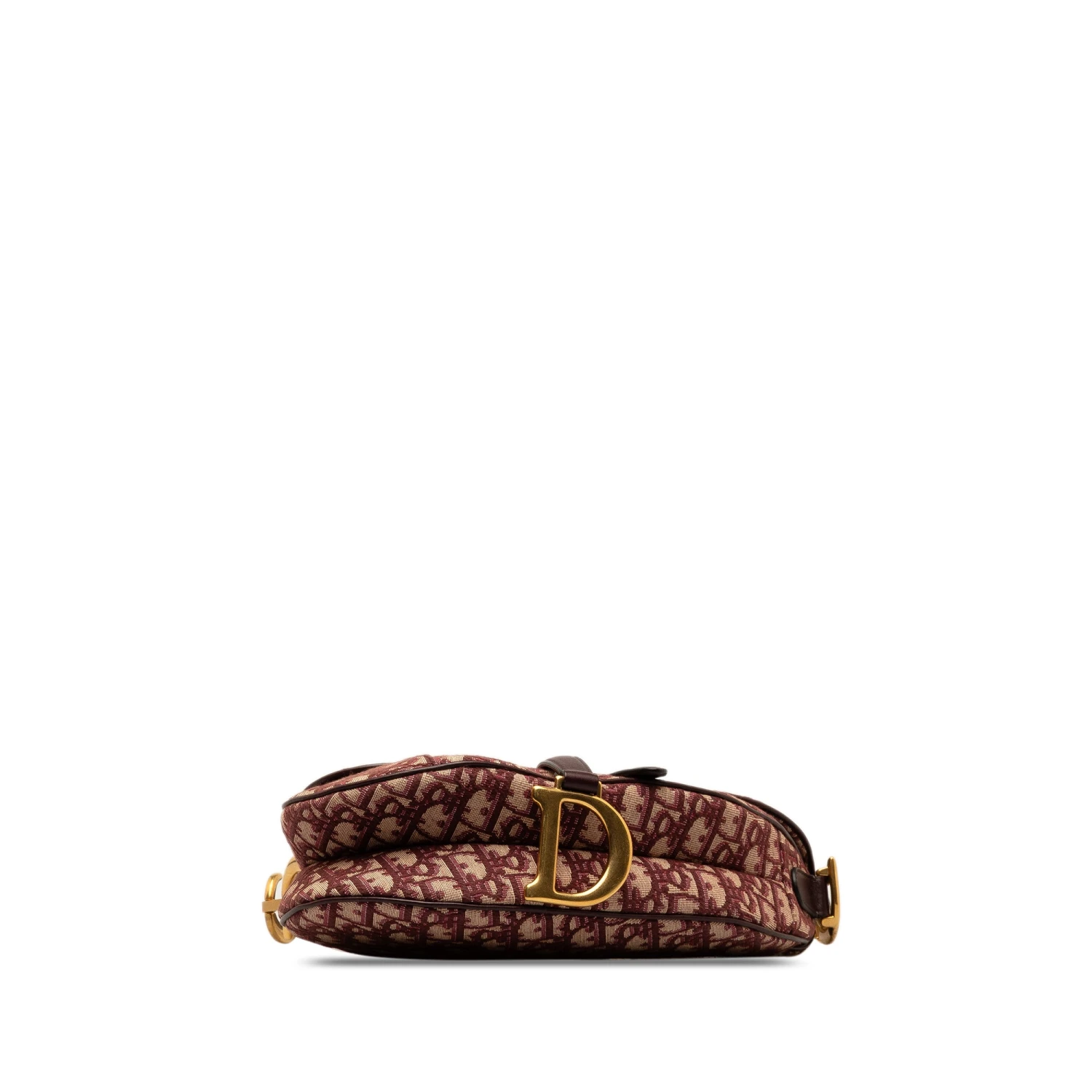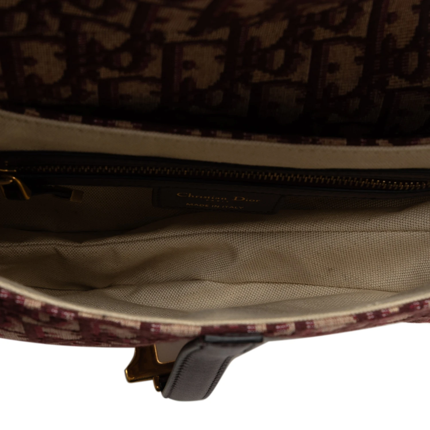 The Saddle features a canvas body with leather trim, a flat leather strap, a flap with magnetic closure, and an interior zip pocket.
