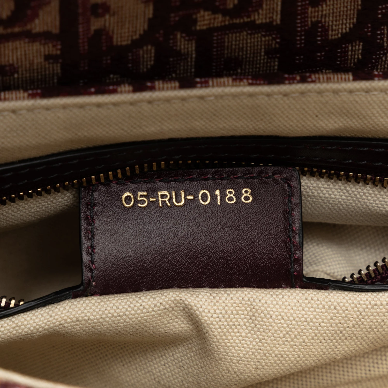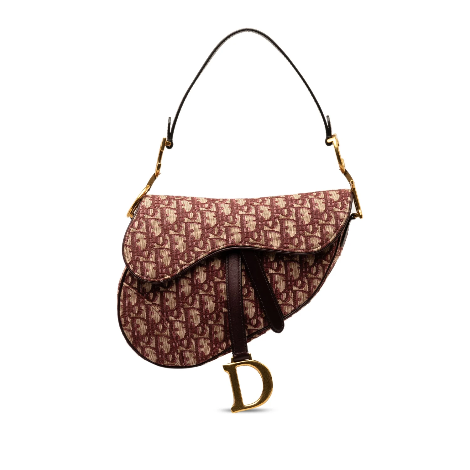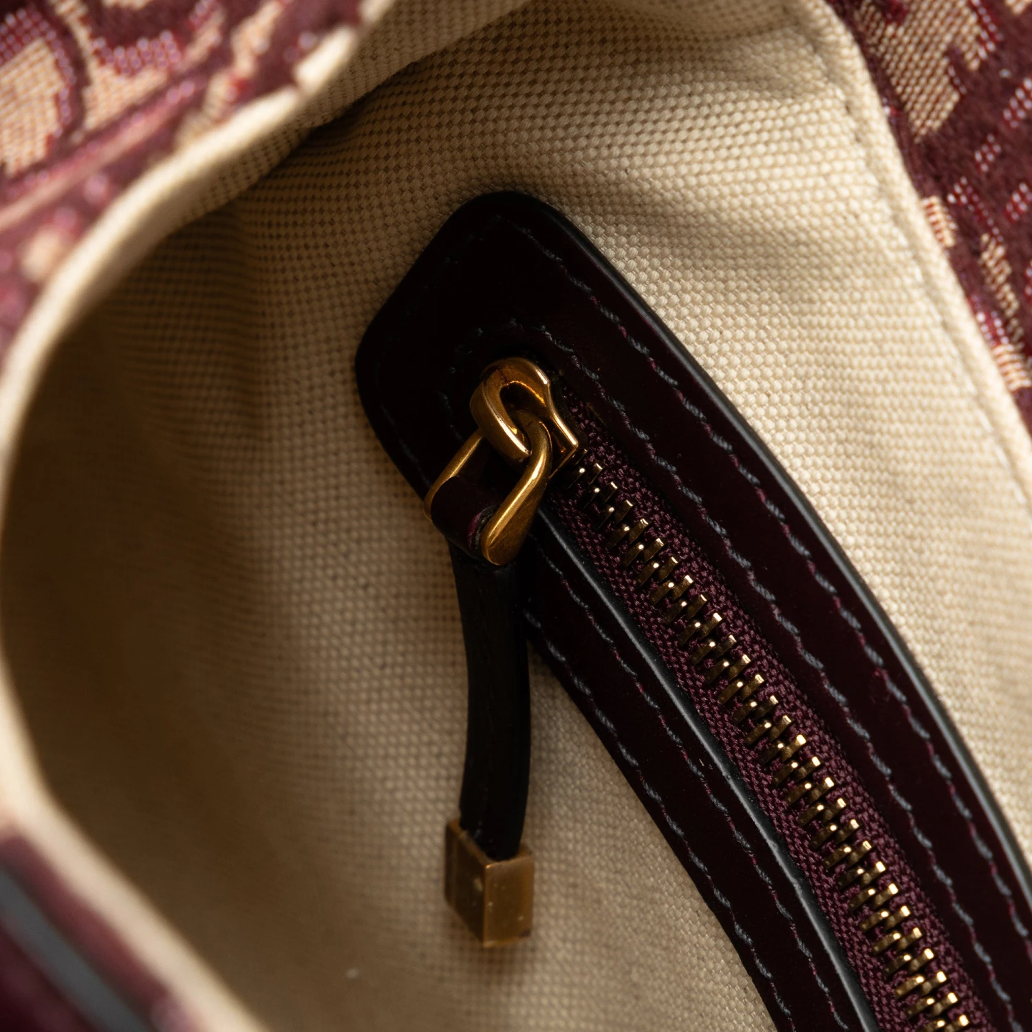 The Saddle features a canvas body with leather trim, a flat leather strap, a flap with magnetic closure, and an interior zip pocket.