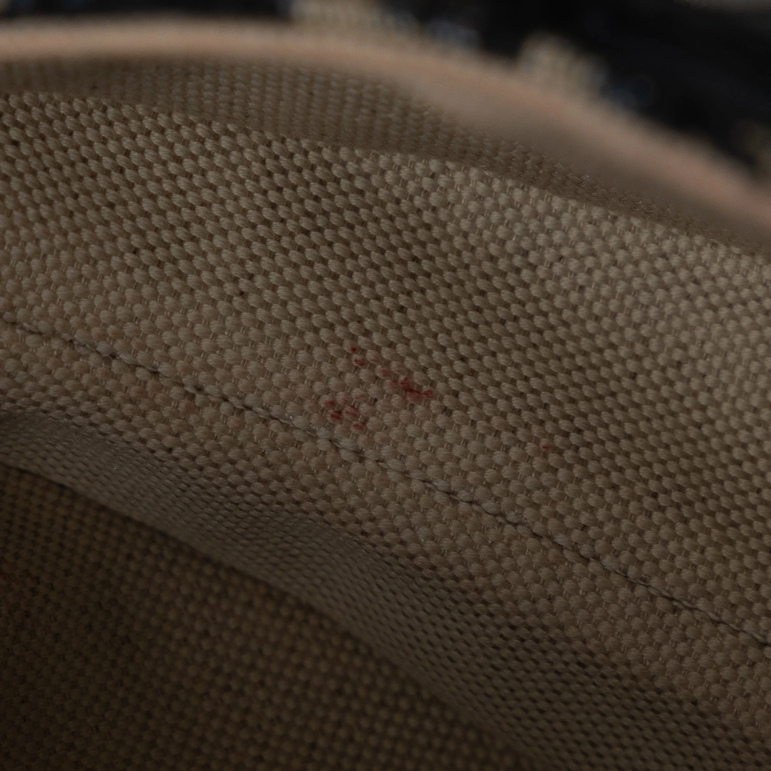 The mini Saddle features an oblique canvas body, a flat leather handle, a front flap with magnetic closure, and an exterior back slip pocket.