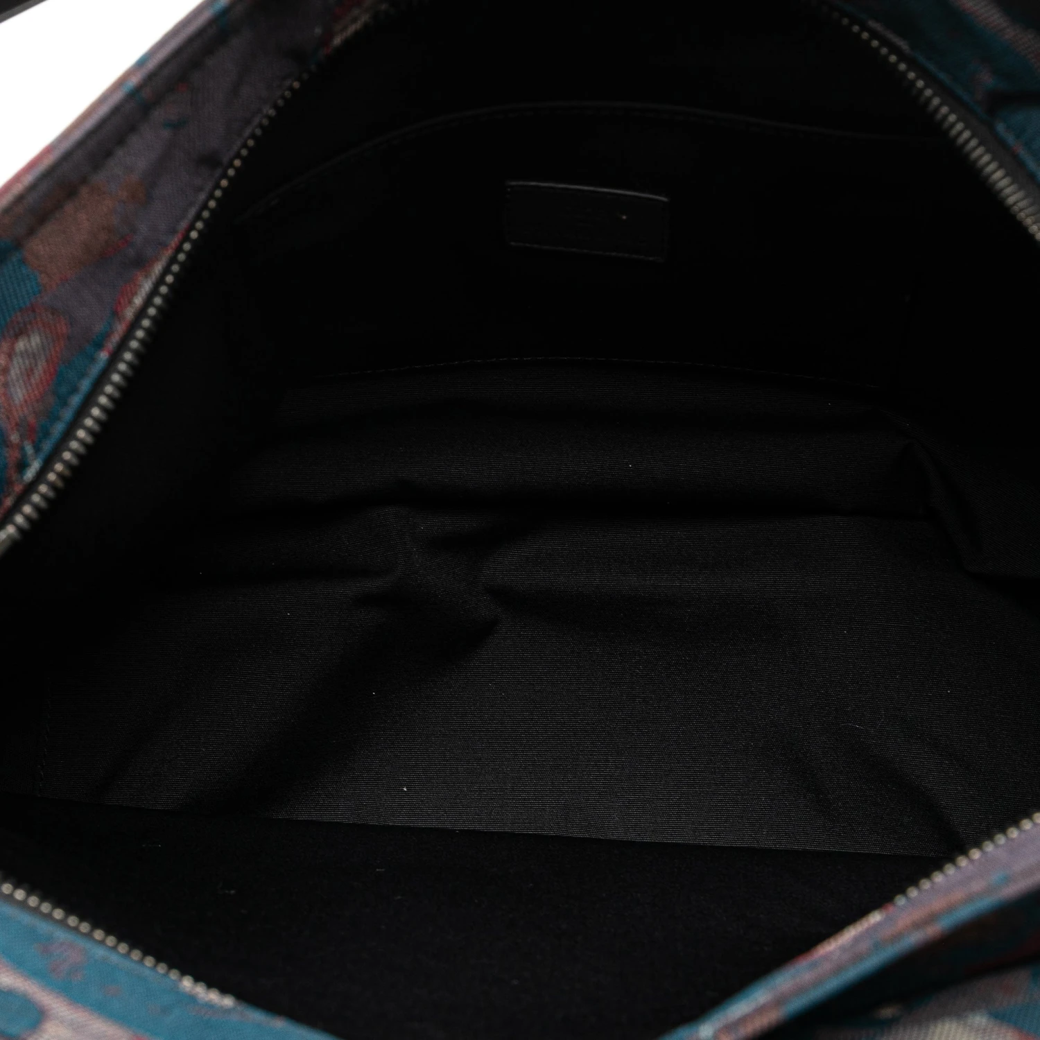 This satchel features a printed denim body with leather trim, a detachable flat leather handle, a detachable and adjustable flat leather shoulder strap, a top zip closure, an exterior flap pocket, and an interior slip pocket. Comes with authenticity card and dust bag.