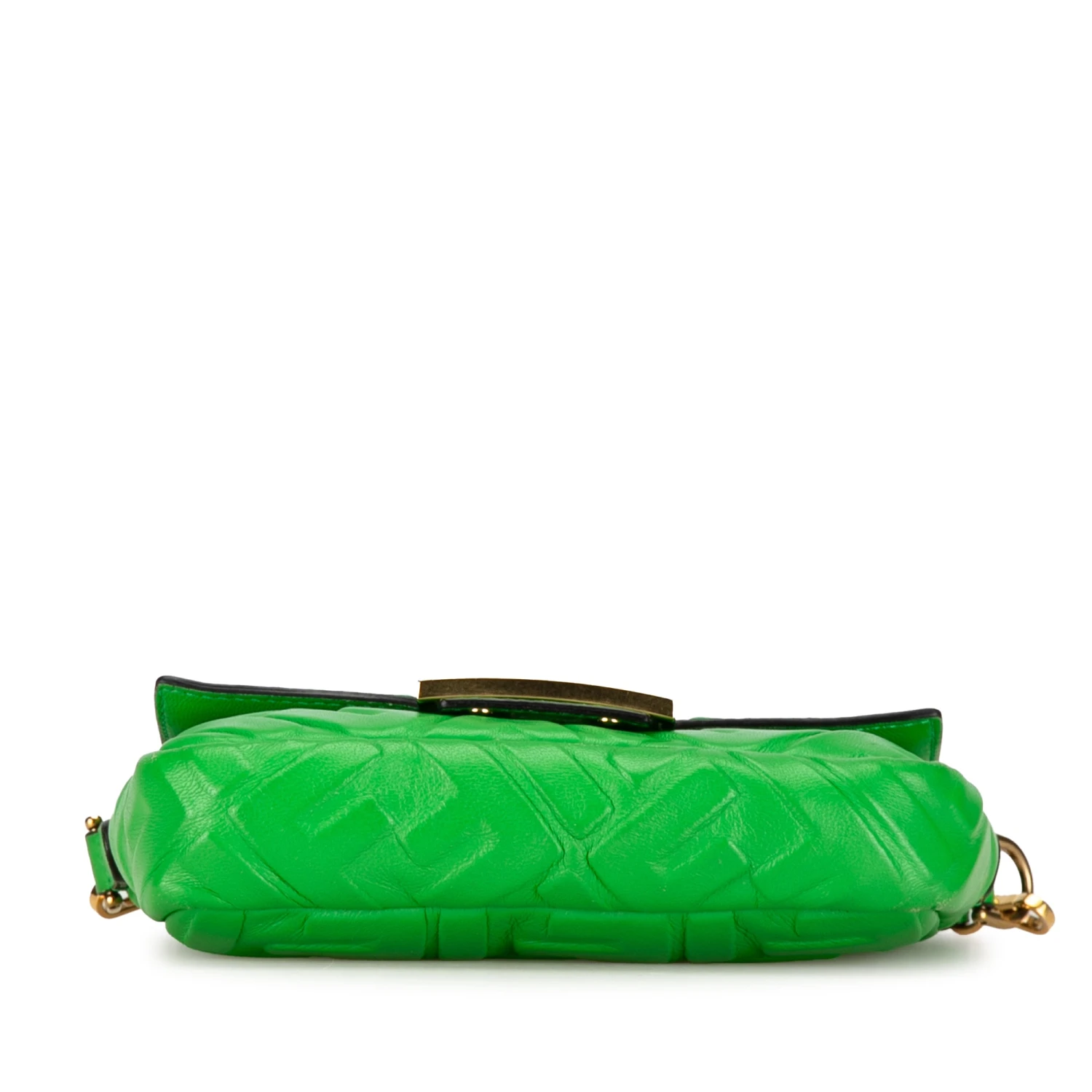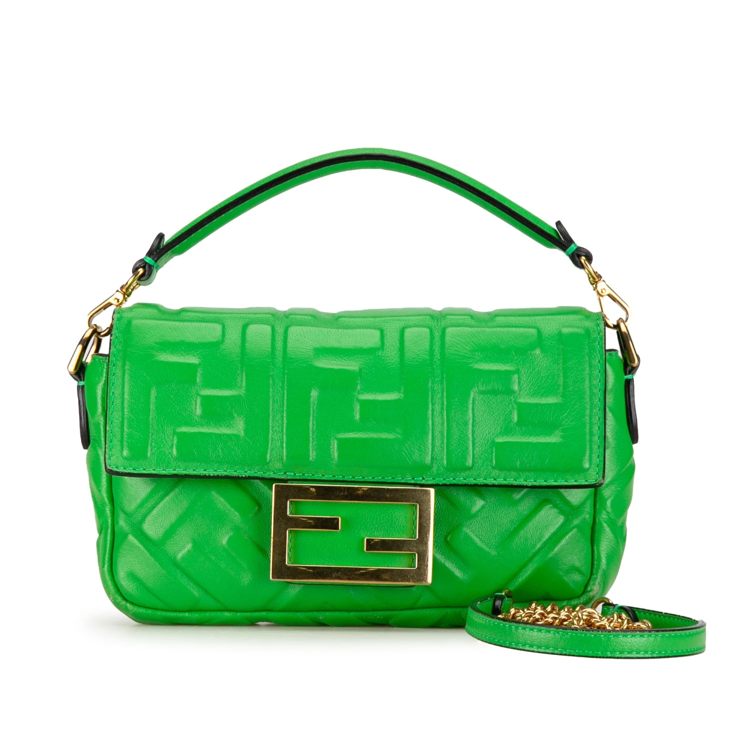 The Baguette features an embossed leather body, a detachable flat leather handle, a detachable curb chain and leather shoulder strap, a front flap with magnetic snap closure, and interior slip pockets.