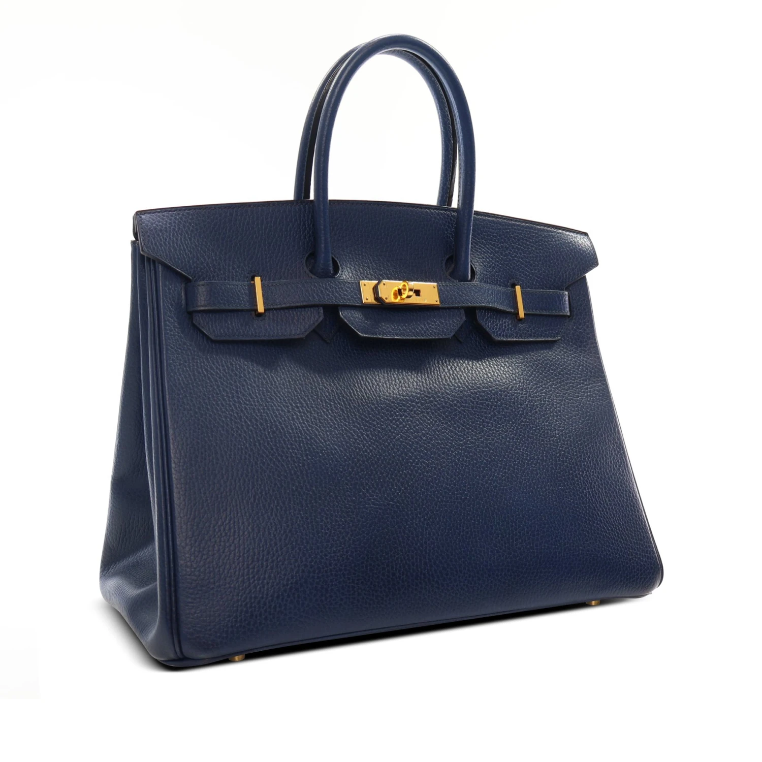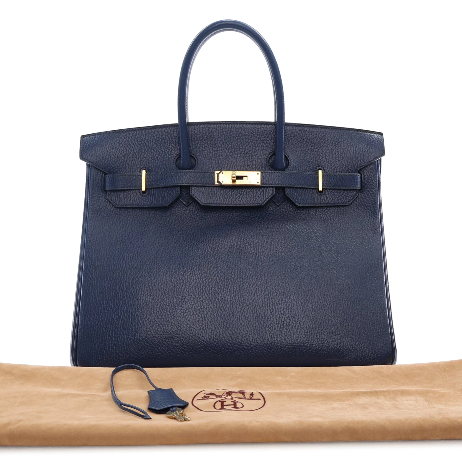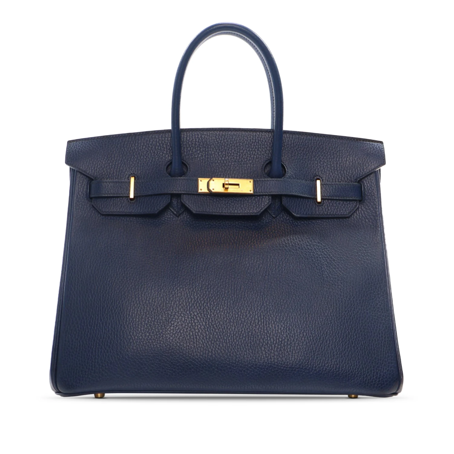 The Birkin 35 features an Ardennes leather body, rolled leather handles, a front flap with turn-lock closure, and interior slip and zip pockets. Comes with dust bag