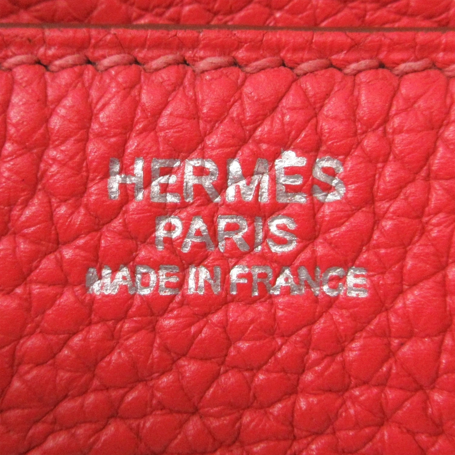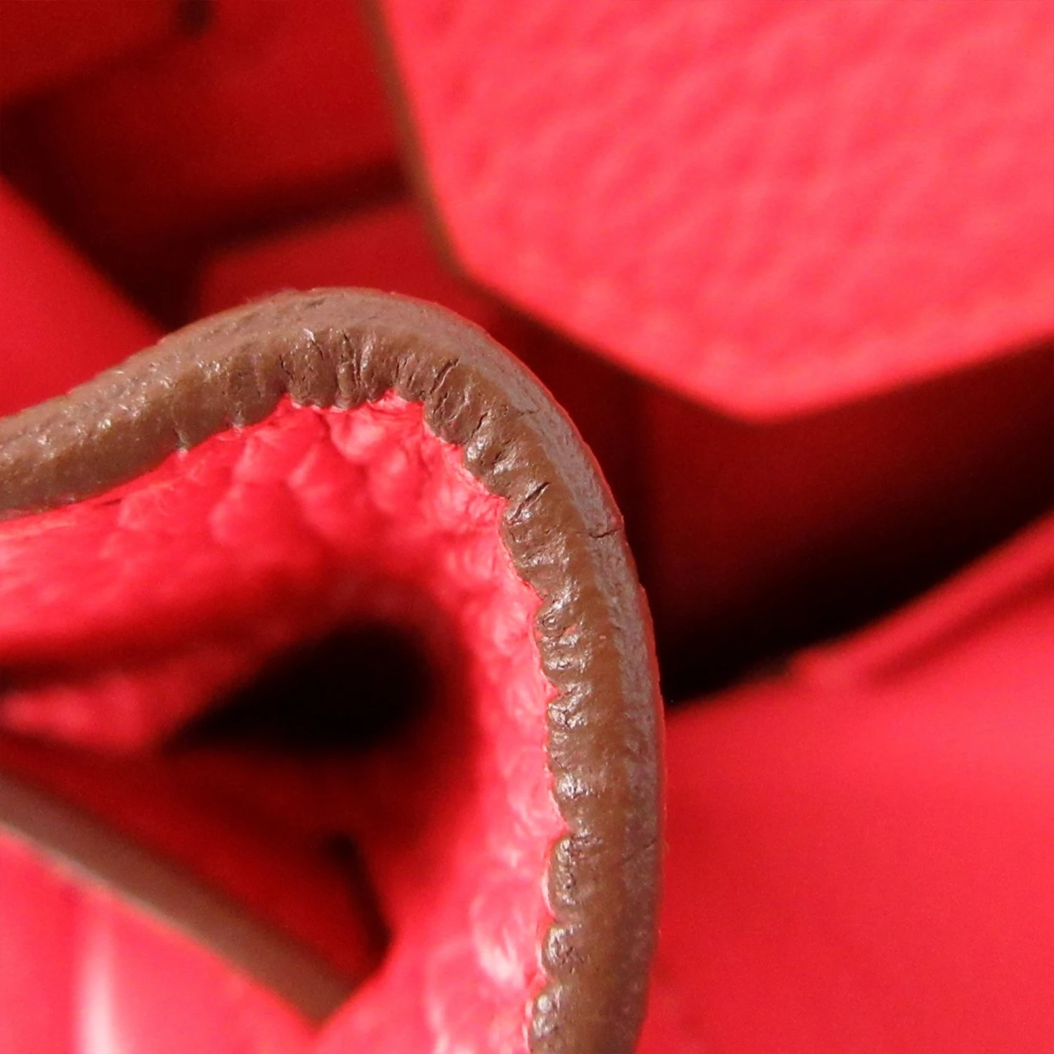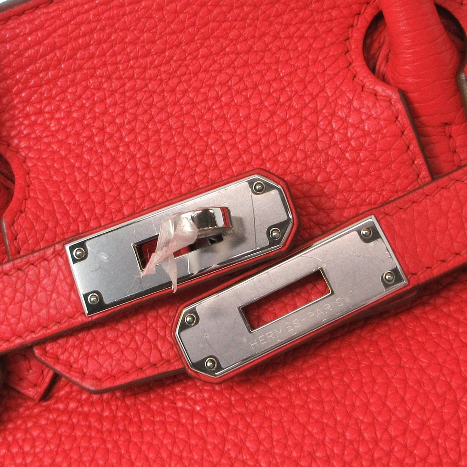 The Birkin 30 features a Clemence leather body in Vermillion color, rolled leather handles, a flap with pull-through and turn lock closure, and interior zip and slip pockets.