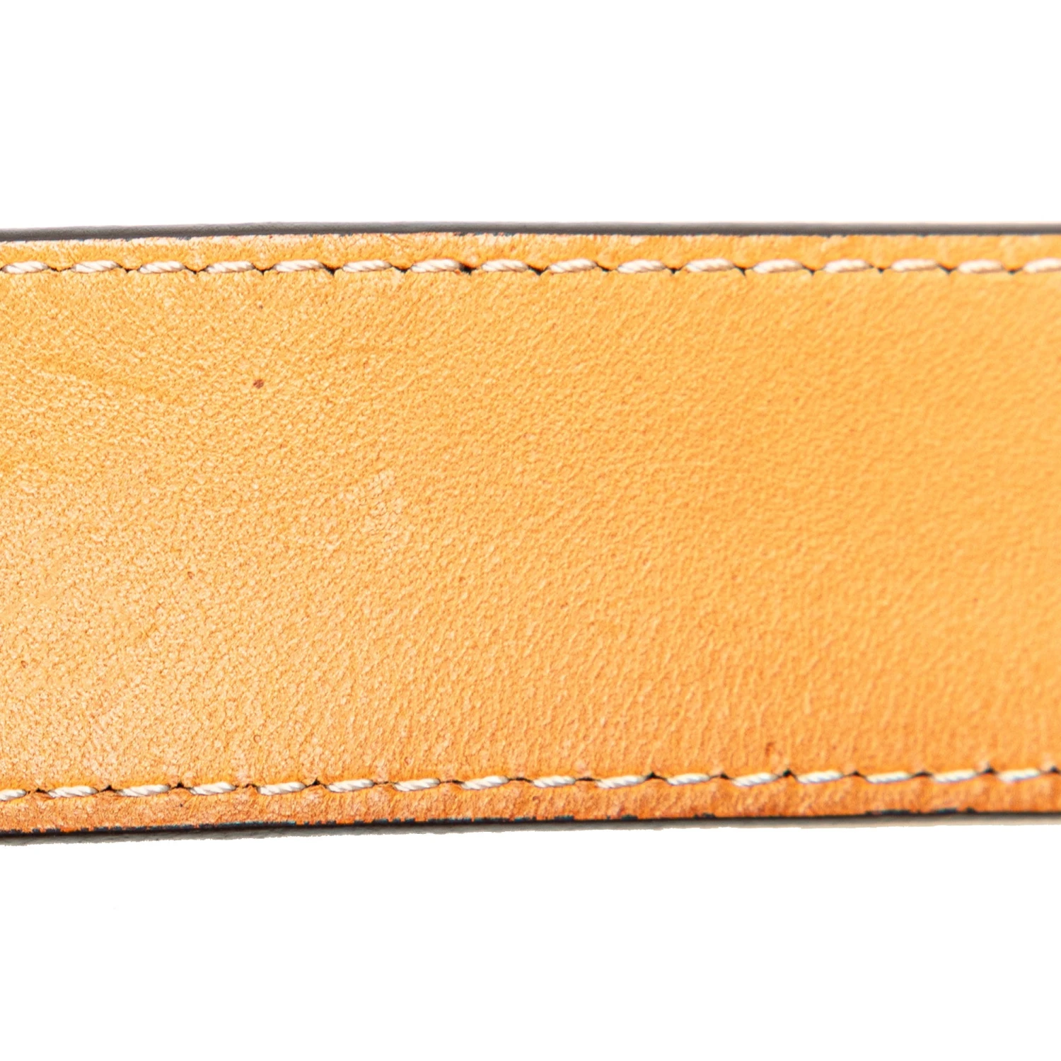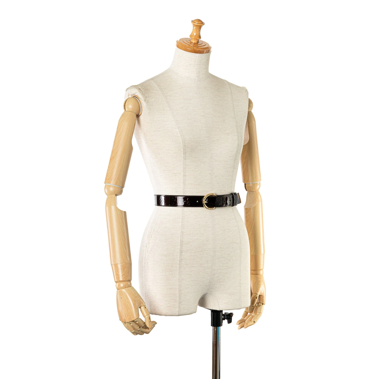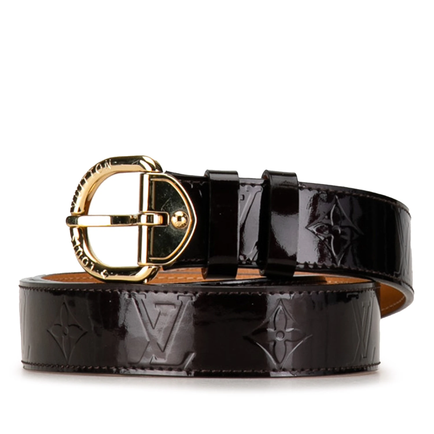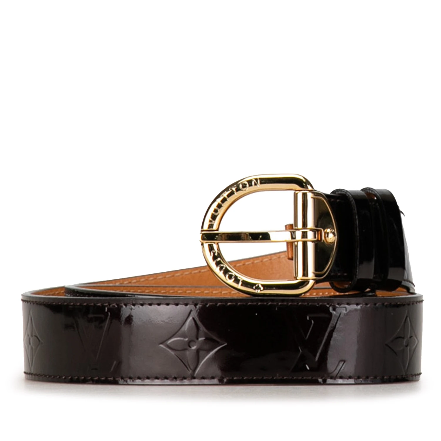 This belt features a vernis leather body and a gold-tone buckle closure.
