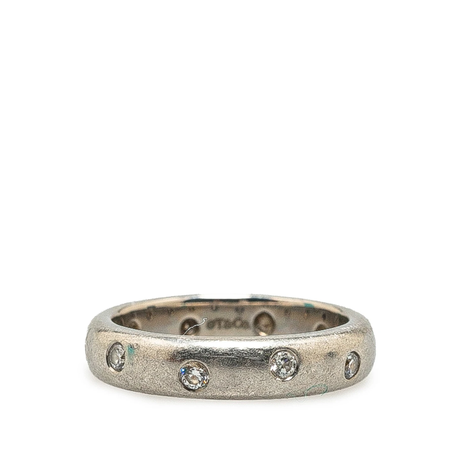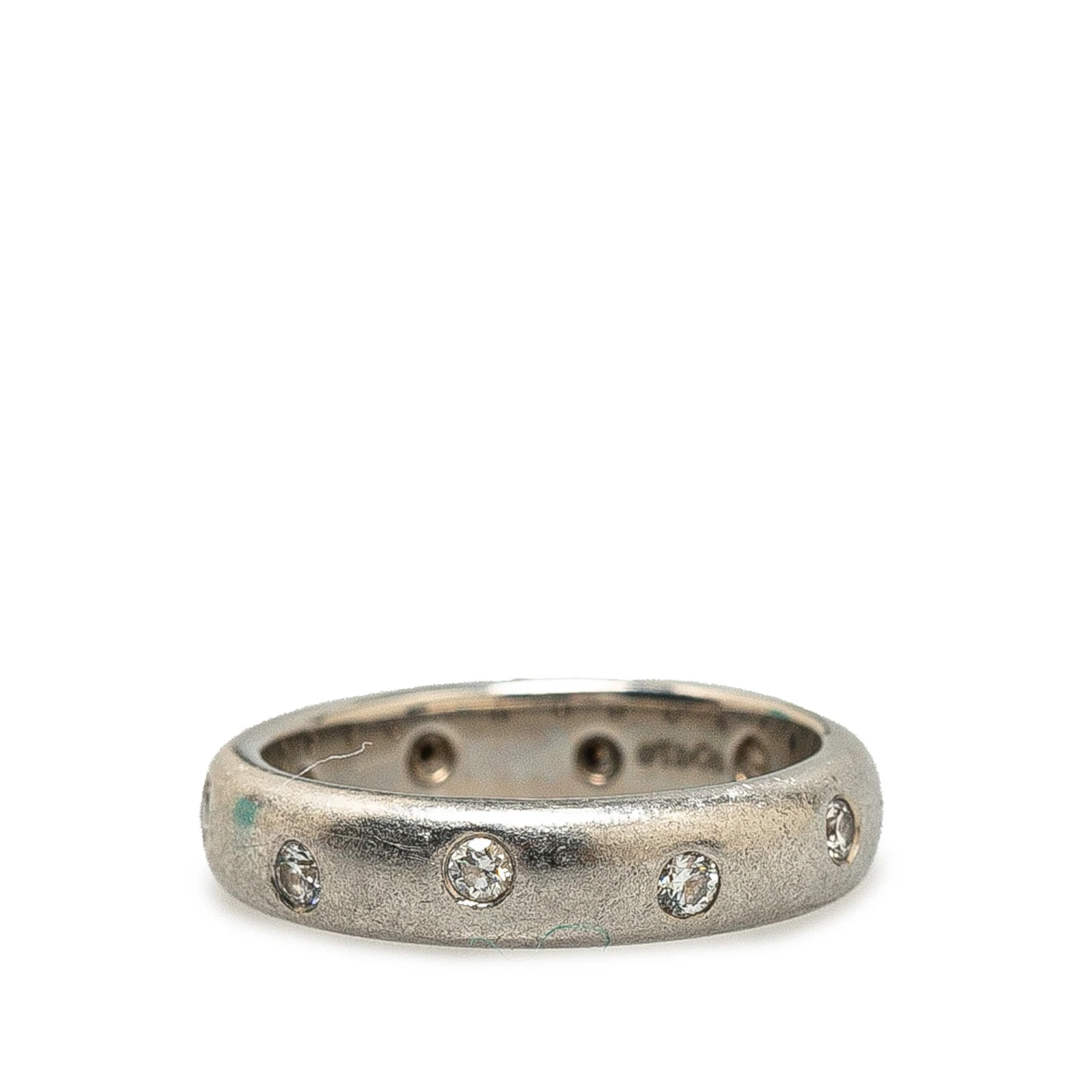 This ring features diamonds set on platinum body. Comes with box.